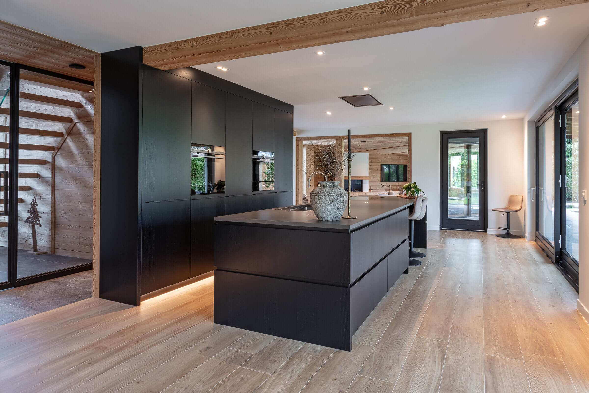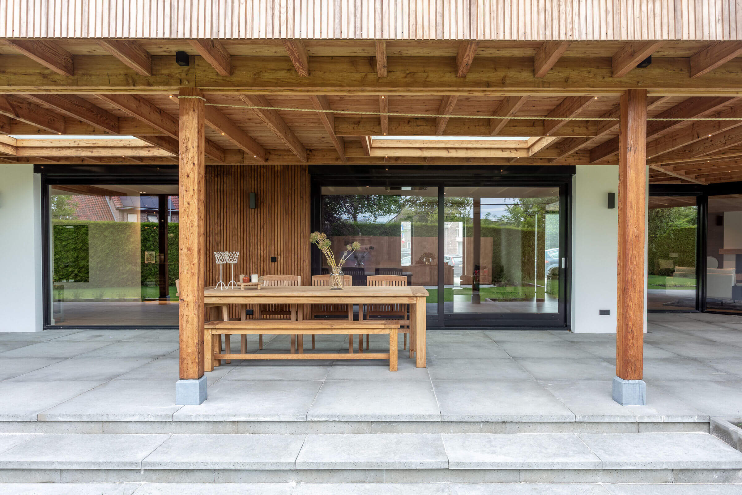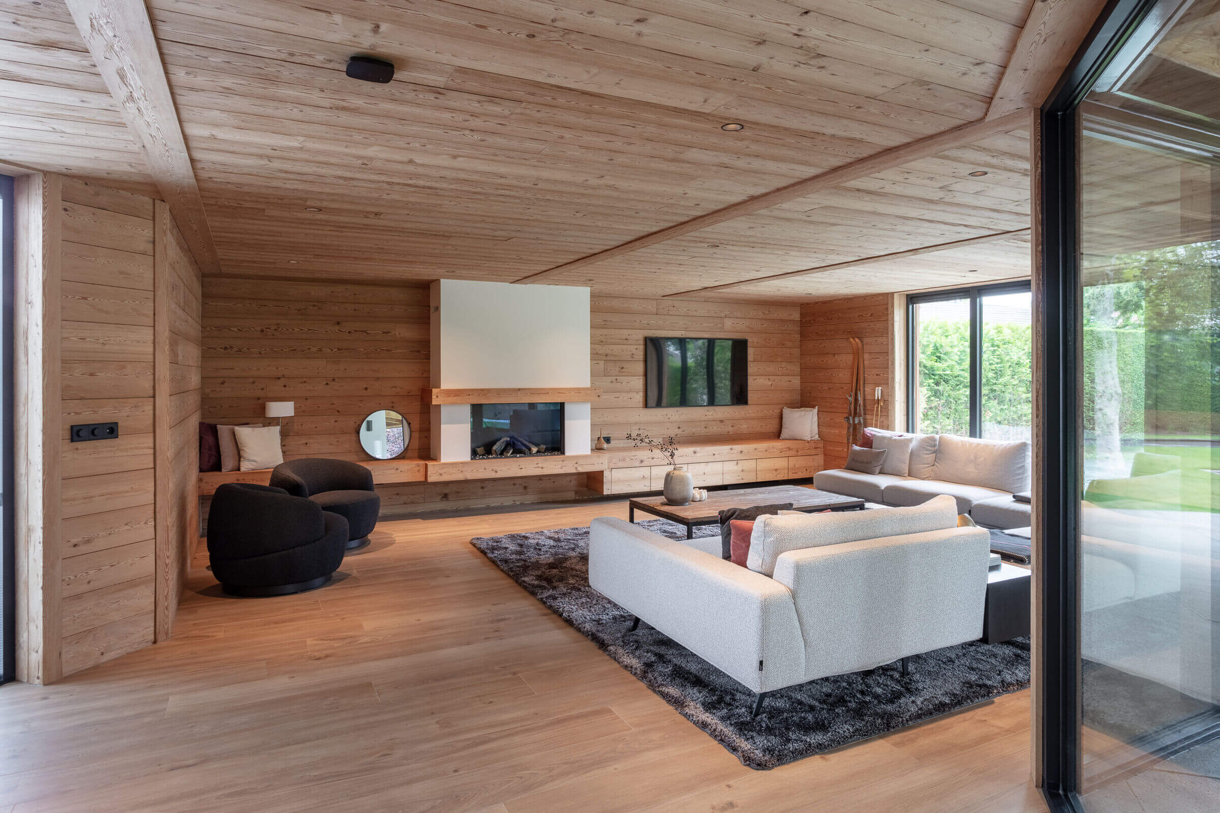 Elewacja budynku to subtelna gra materiałów i tekstur – szlachetna sztukateria została połączona z ciepłym, naturalnym drewnem z Austrii, które pojawia się zarówno na zewnątrz (werandy, okapy, okładziny), jak i w środku – w salonie, kuchni i strefie wypoczynkowej. Ten kontrast materiałowy wpisuje się w koncepcję domu jako nowoczesnej stodoły, gdzie tradycyjna forma spotyka się z nowoczesnym podejściem do funkcji i estetyki.