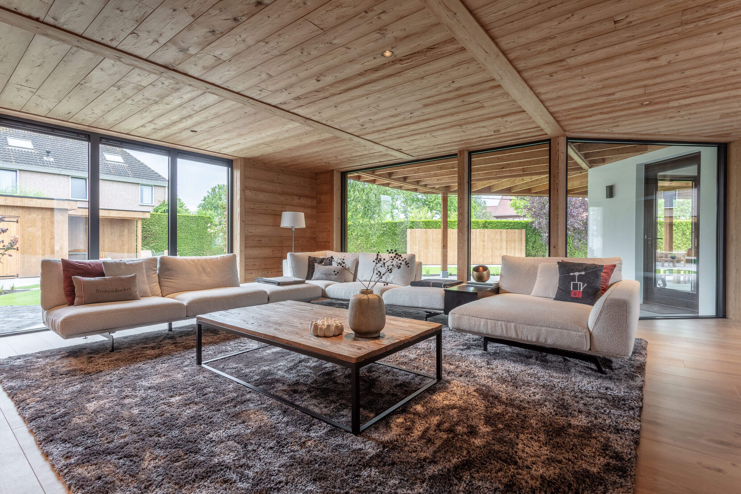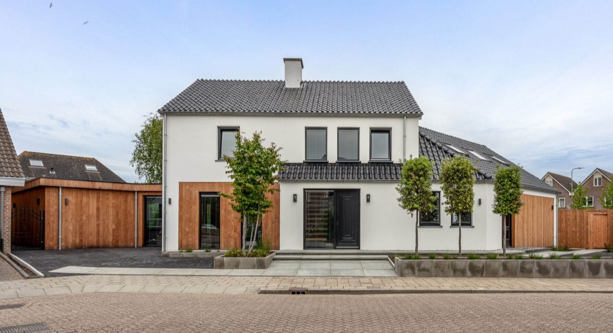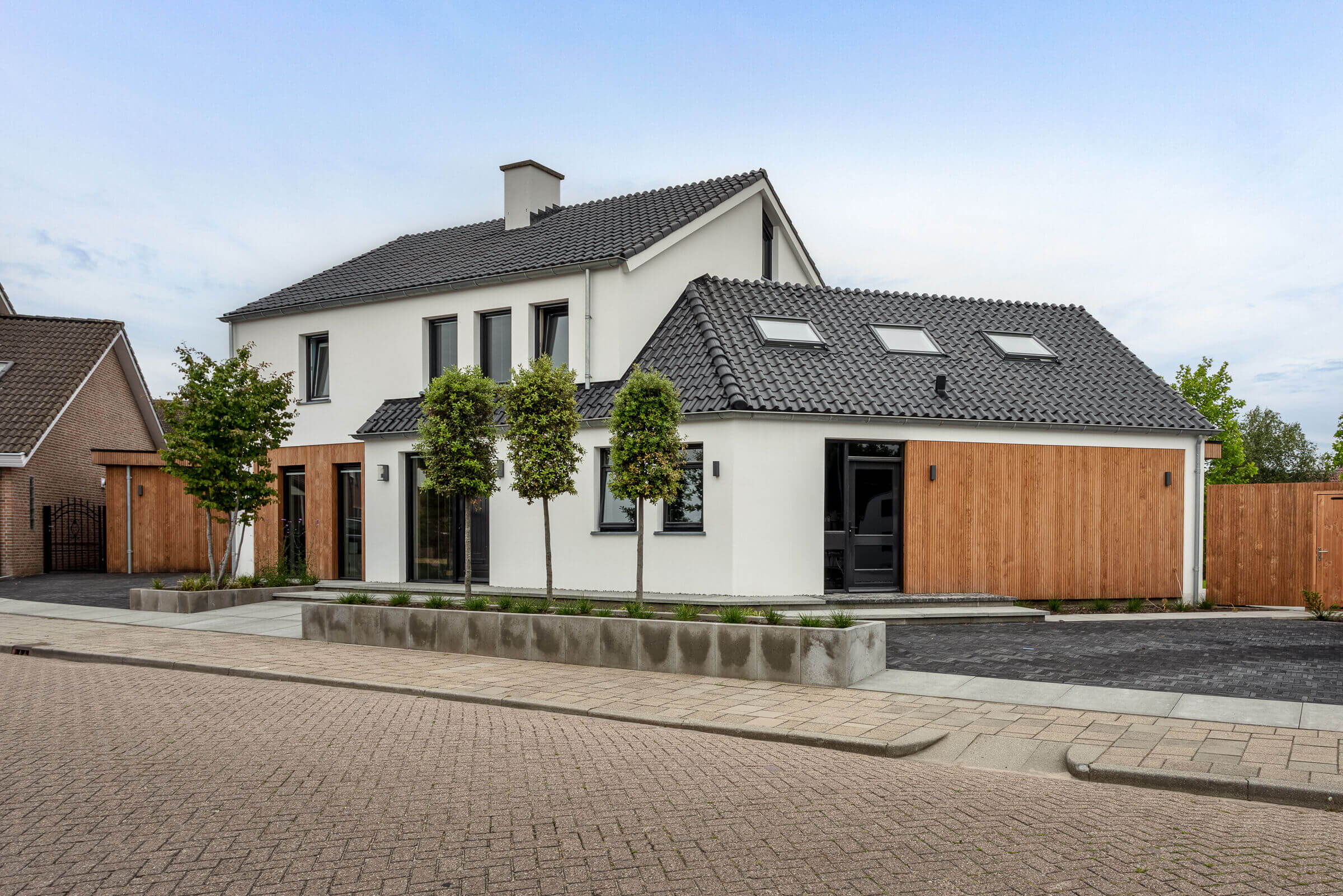 Elewacja budynku to subtelna gra materiałów i tekstur – szlachetna sztukateria została połączona z ciepłym, naturalnym drewnem z Austrii, które pojawia się zarówno na zewnątrz (werandy, okapy, okładziny), jak i w środku – w salonie, kuchni i strefie wypoczynkowej. Ten kontrast materiałowy wpisuje się w koncepcję domu jako nowoczesnej stodoły, gdzie tradycyjna forma spotyka się z nowoczesnym podejściem do funkcji i estetyki.