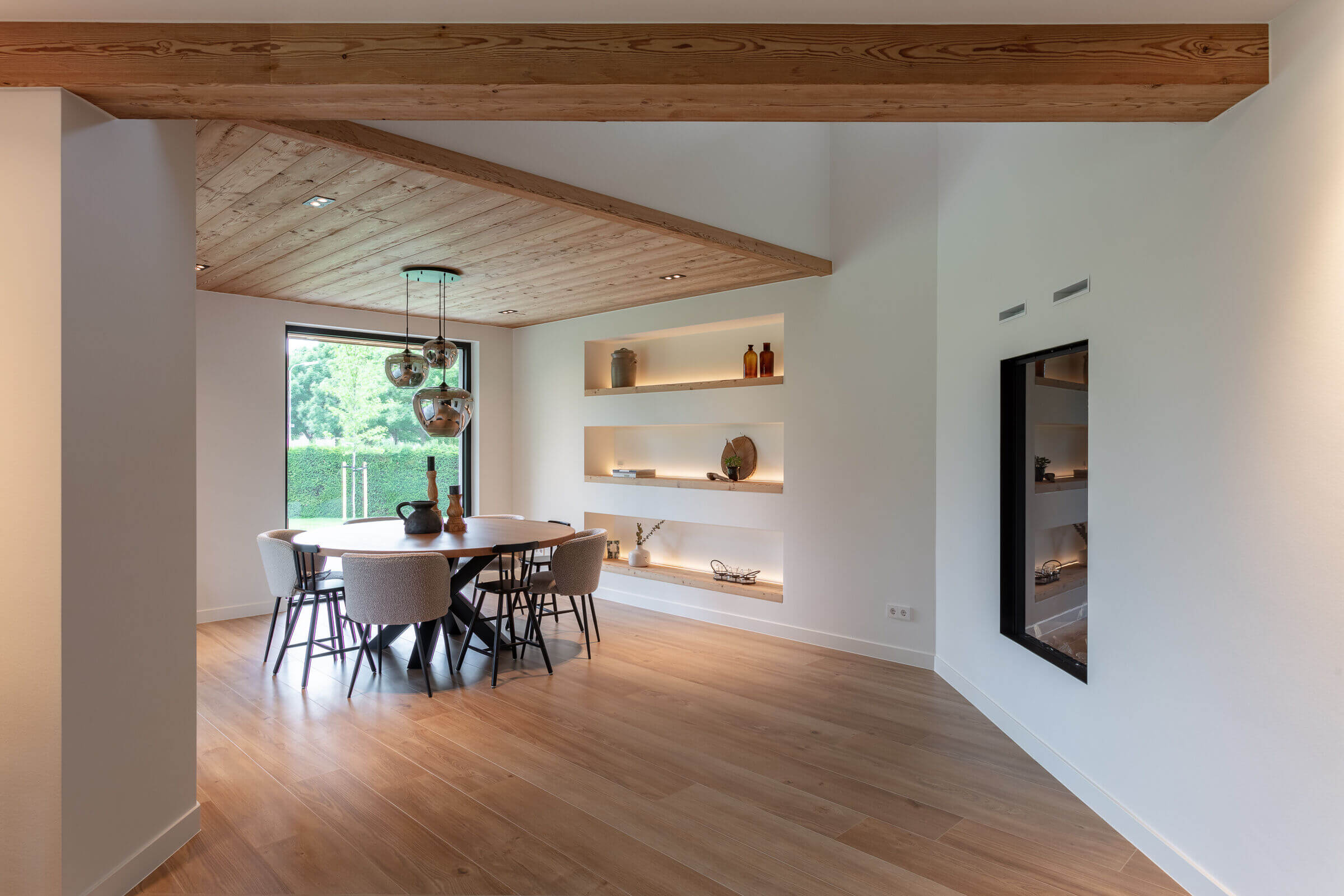 Dom został zaprojektowany z myślą o codziennym komforcie, ale też z dużym wyczuciem estetyki. Funkcjonalne strefy, takie jak spiżarnia, pomieszczenie gospodarcze czy korytarze, starannie oddzielono od przestrzeni dziennej, co pozwoliło stworzyć spójny, klarowny układ wnętrz. Przemieszczając się przez dom, odkrywa się kolejne warstwy stylu – od eleganckich akcentów po naturalne drewniane detale, które tworzą domową atmosferę. Salon i kuchnia otwierają się szeroko na ogród, co maksymalizuje dostęp naturalnego światła i optycznie powiększa przestrzeń.