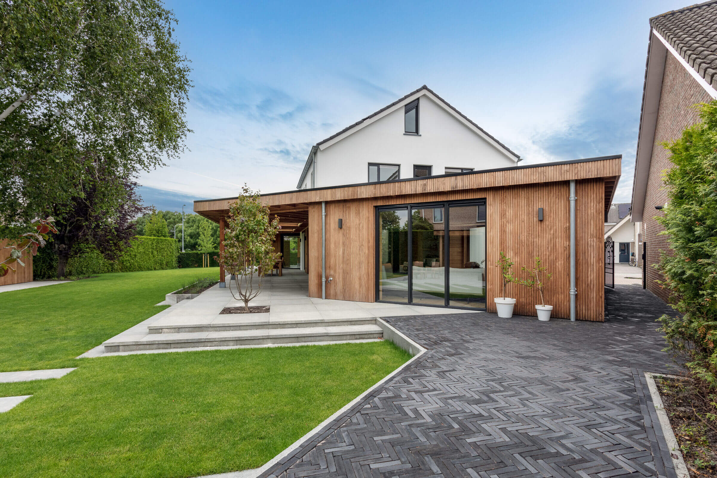 Poszerzenie tylnej osłony budynku stworzyło naturalny przepływ między wnętrzem a ogrodem, zgodnie z życzeniem domowników, którzy cenią sobie otwartą przestrzeń i bliskość natury. Przemyślana integracja dwóch różnych estetyk widoczna jest w każdym detalu – od stolarki okiennej, przez wykończenie ścian, po dobór oświetlenia i mebli.
