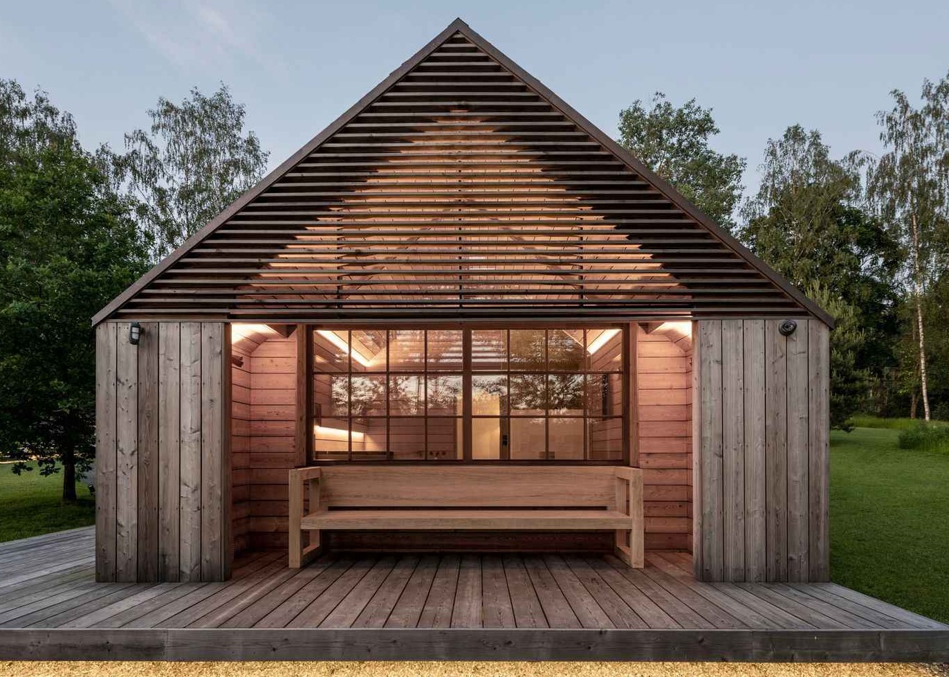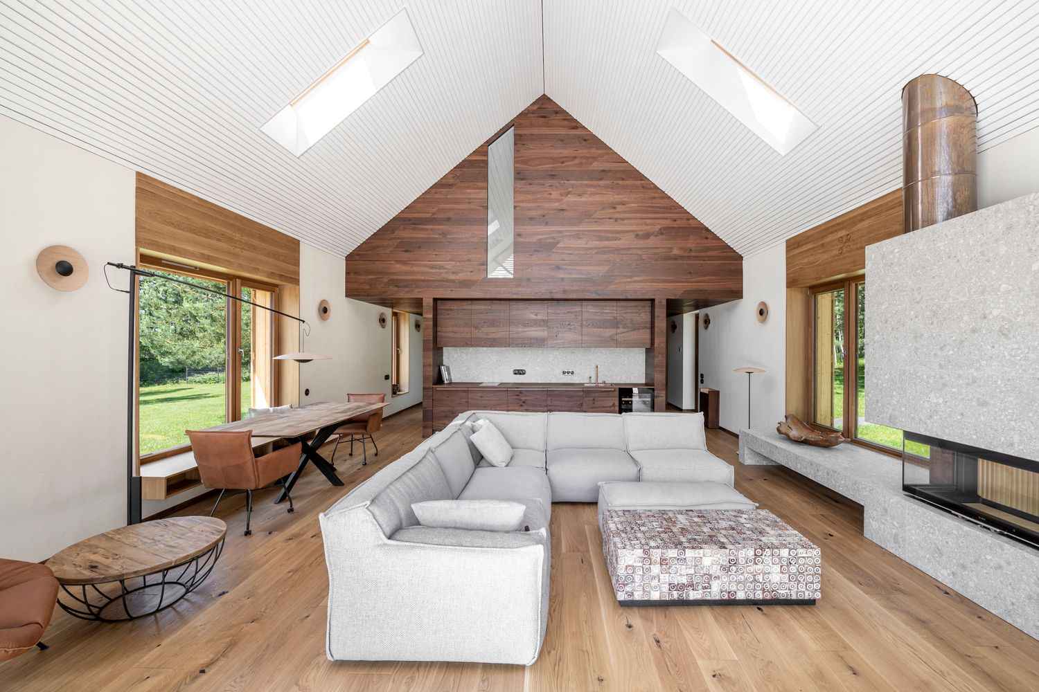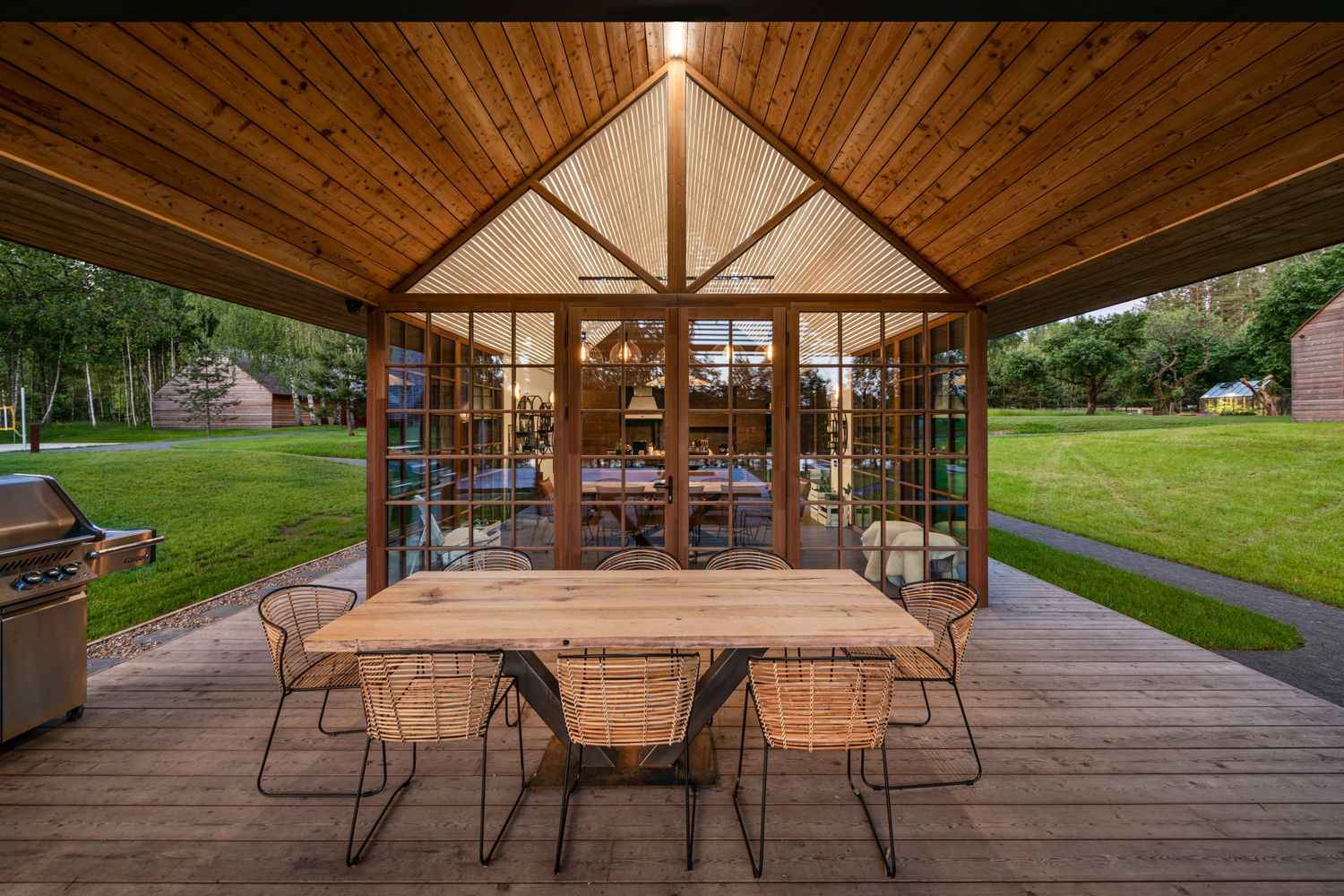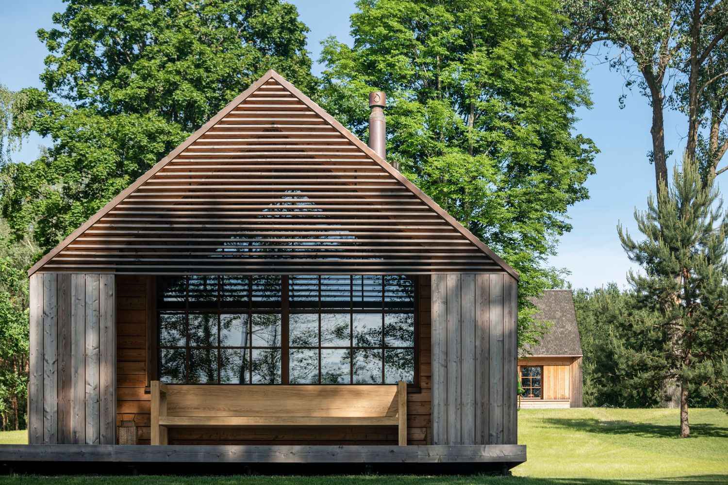 Projekt czerpie inspirację z tradycyjnej wiejskiej zagrody, zachowując pełną funkcjonalność nowoczesnego domu. Na dużej, leśnej działce otoczonej jeziorami rozmieszczono kilka budynków: dom główny, dom dziadków, saunę, kuchnię zewnętrzną i budynek gospodarczy. Łączą je kręte ścieżki, które tworzą swoistą „lokalną sieć życia”, promując codzienne życie zarówno na zewnątrz, jak i wewnątrz. Choć projekt nawiązuje do idei nowoczesnej stodoły, każdy budynek jest harmonijnie wpisany w krajobraz, nie zakłócając naturalnego rytmu otoczenia.