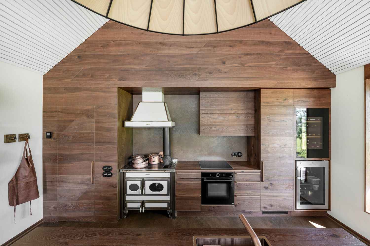 Architekci postawili na naturalne materiały i neutralną kolorystykę – modrzewiowe elewacje, gonty dachowe, drewno, tynk, kamień i kolory ziemi. Już podczas budowy elementy te zaczęły się stapiać z otoczeniem, sprawiając wrażenie, że dom istnieje tu od zawsze. Pomimo rustykalnej formy, wnętrza są nowoczesne, wygodne i przemyślane, bez zbędnych ozdobników. Projekt „Avatar” to nie tylko dom, ale manifest życia blisko natury – zaprojektowany z uważnością, z dala od miejskiego pędu, oferujący harmonię, równowagę i nową jakość codzienności.