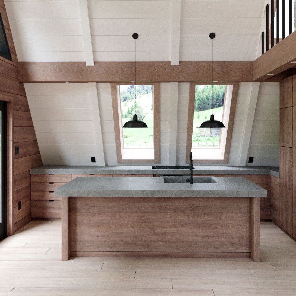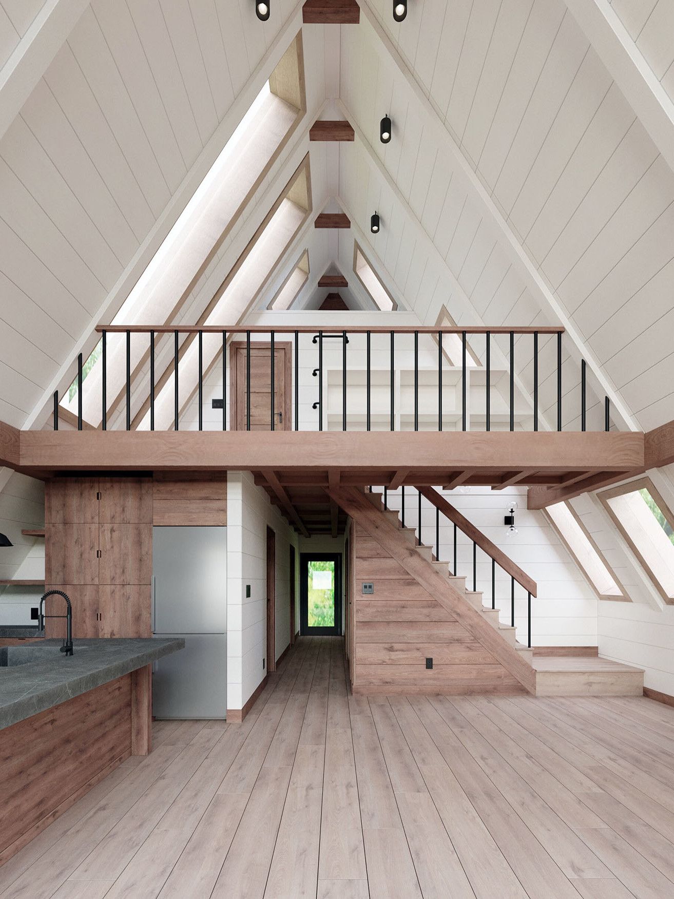 Projekt obejmuje trzy obszerne tarasy z deski cedrowej, wysokie sufity wykończone drewnianymi belkami oraz duże, robione na wymiar okna panoramiczne, które otwierają wnętrze na otaczający krajobraz. W środku znajdują się trzy sypialnie i dwie łazienki, w tym wyjątkowy pokój z łóżkami piętrowymi dla czterech osób. Na poddaszu zaplanowano przytulną, jasną przestrzeń, która doskonale sprawdzi się jako kącik do pracy, relaksu czy czytania.