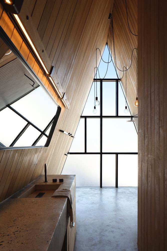 W środku dominują okładziny z białego dębu, które otulają przestrzeń naturalnym ciepłem, w kontraście do surowych, polerowanych betonowych posadzek. Główna strefa dzienna została subtelnie podzielona na trzy poziomy: miejsce do gotowania, spożywania posiłków oraz wspólnego spędzania czasu. Z każdego z tych punktów rozpościera się inny widok na elementy otoczenia — ocean, skały, światło — tworząc narrację, która zmienia się wraz z ruchem po domu.