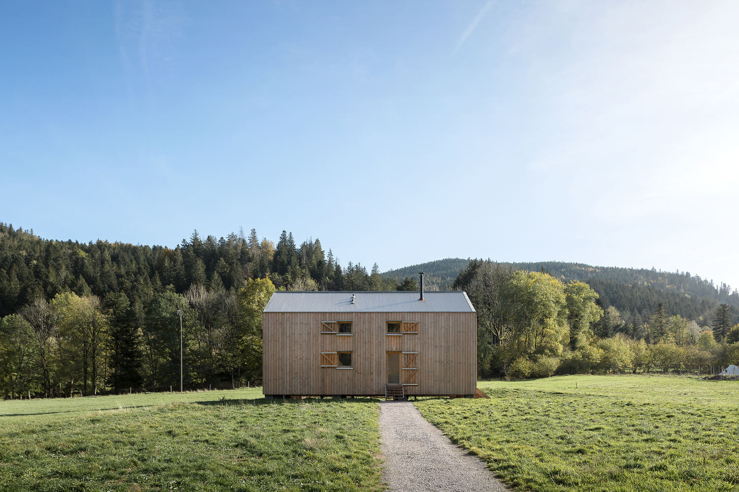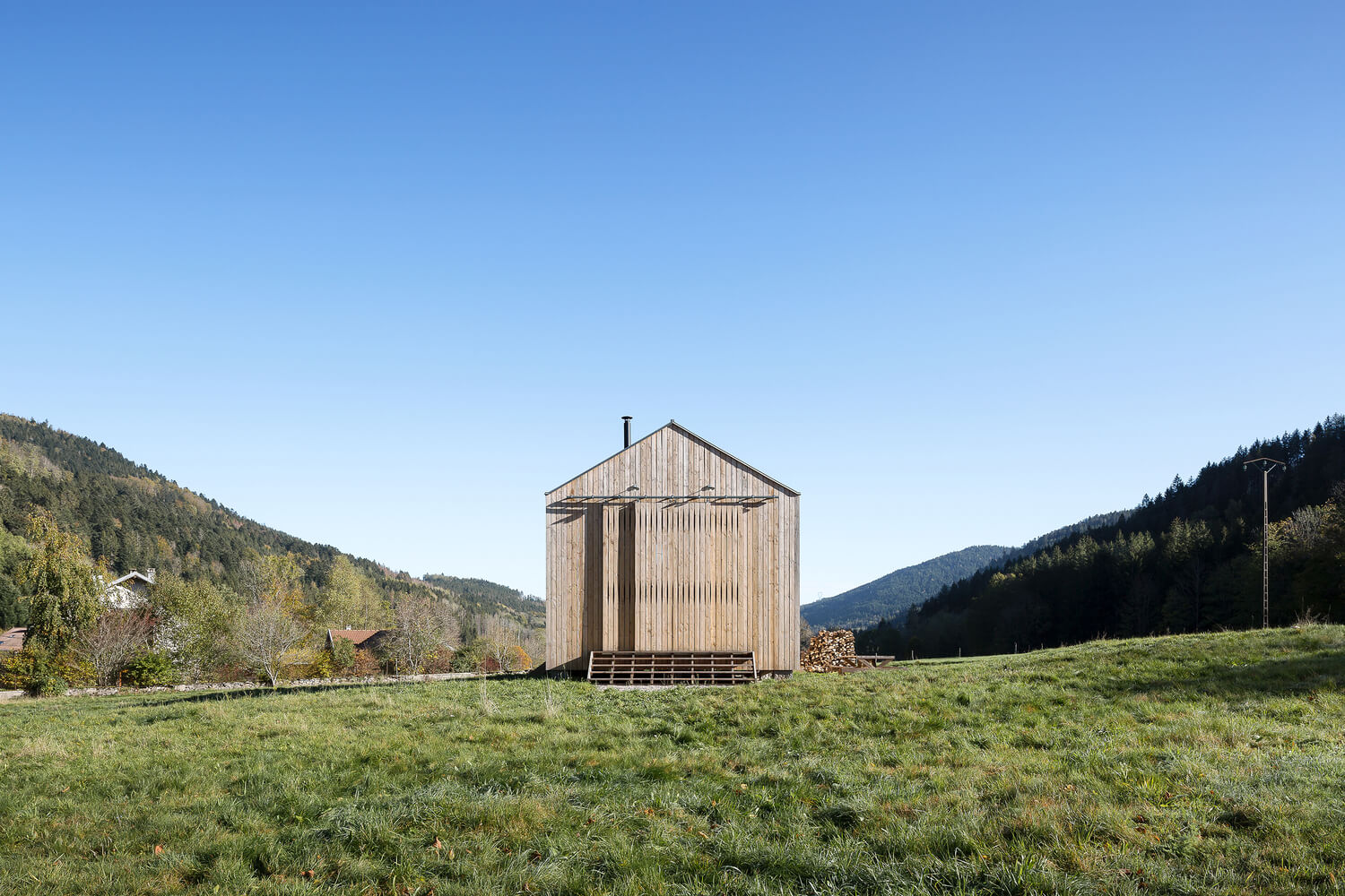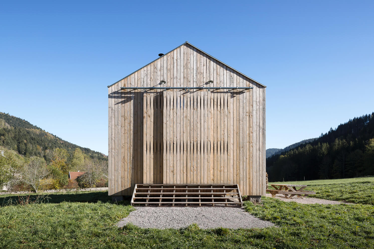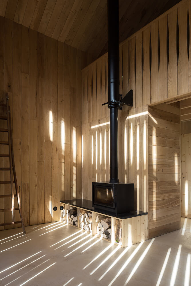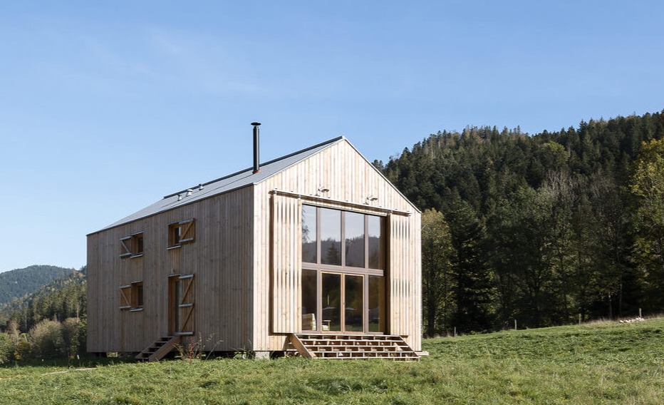 Stodoła opiera się na 12 granitowych blokach, co minimalizuje jej kontakt z podłożem i sprawia, że budynek wydaje się unosić nad powierzchnią ziemi. Dzięki temu dom doskonale wpisuje się w naturalny krajobraz, przywołując estetykę dawnych gospodarstw. Cztery fasady budynku pokryto pionową okładziną drewnianą, a po bokach zamontowano okiennice inspirowane tradycyjnymi balustradami, które często spotyka się w górskich rejonach.
