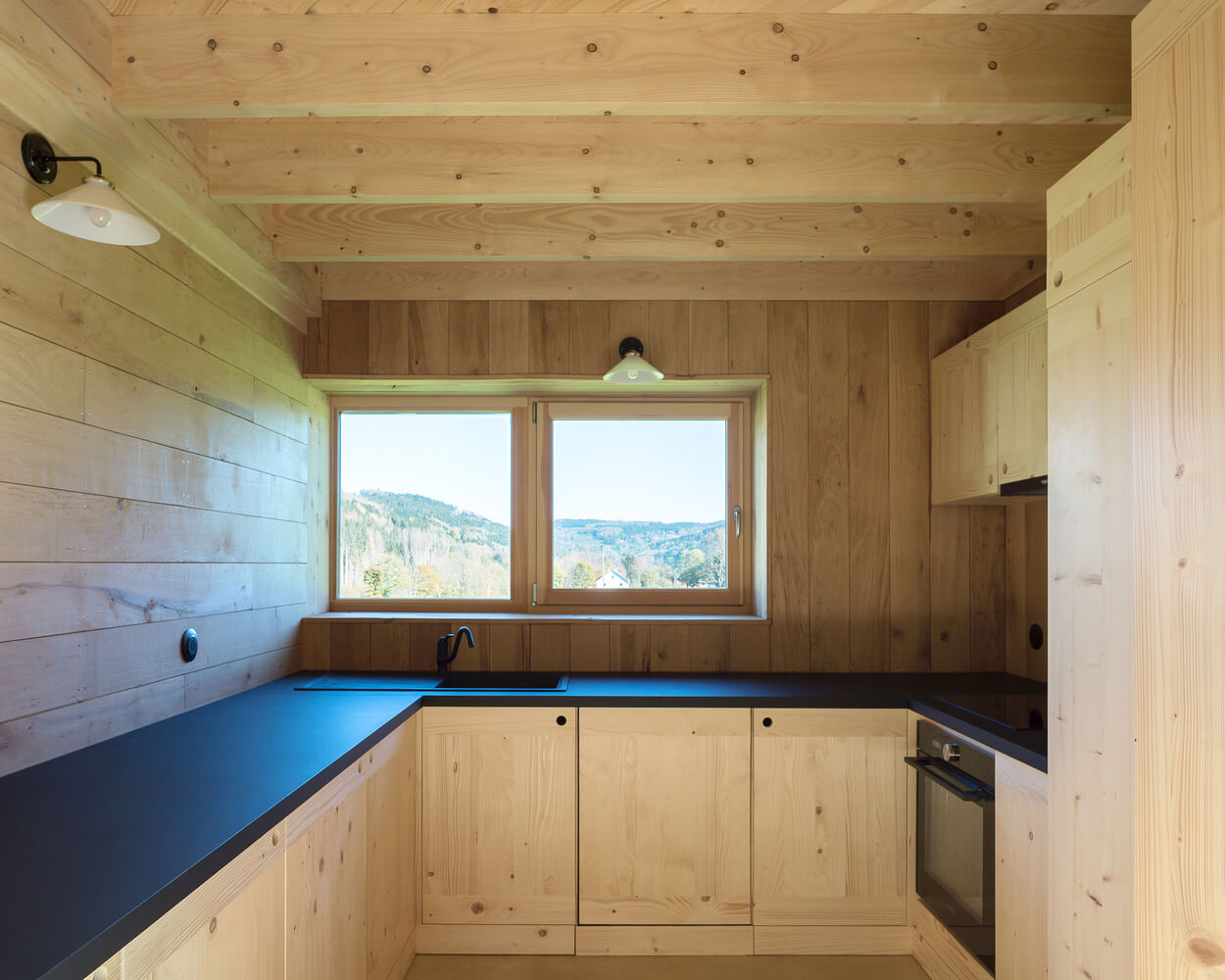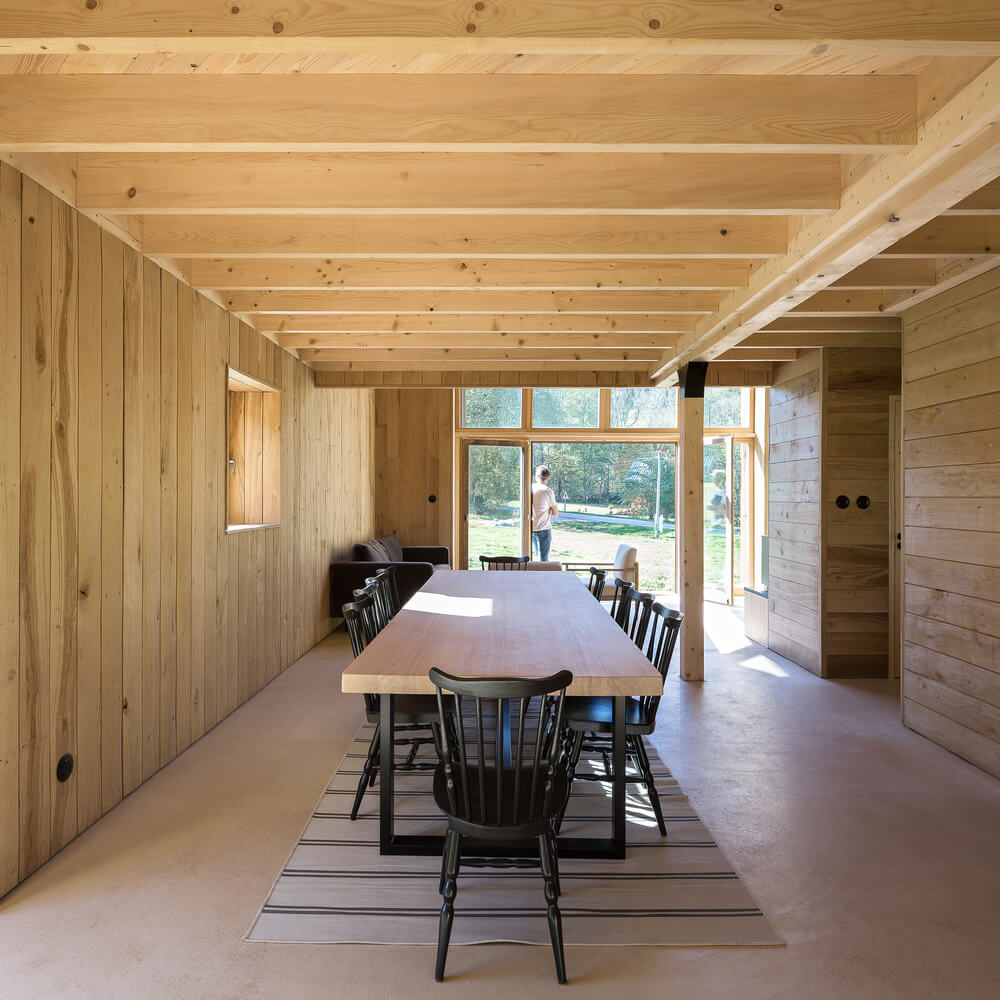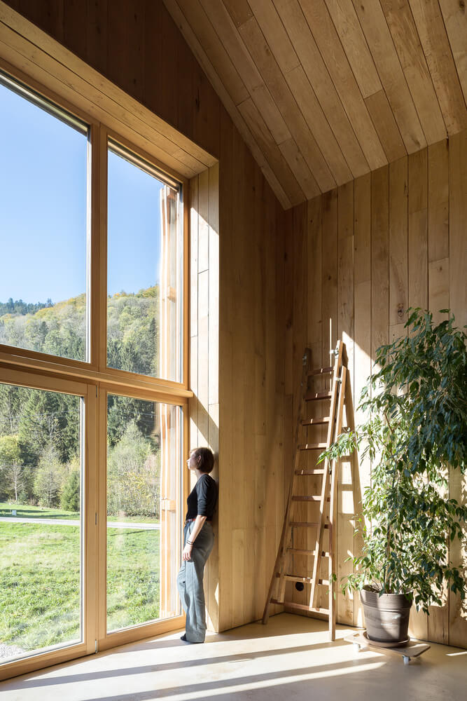Wnętrze domu zostało wykończone przy użyciu desek dębowych i świerkowych, co nadaje przestrzeni ciepły, naturalny charakter. Koncept z litego drewna zapewnia wykorzystanie lokalnych zasobów drewna, zarówno do konstrukcji, jak i do mebli. Takie podejście umożliwia zrównoważoną budowę i szanuje tradycyjne rzemiosło. Architektura tego projektu, osadzona w tym wyjątkowym kontekście, wymagała zastosowania lokalnych materiałów, tradycyjnego know-how oraz zaangażowania lokalnych rzemieślników. Projekt ten stanowi eksperyment z wykorzystaniem lokalnych zasobów i technik budowlanych, wprowadzając nowoczesne rozwiązania do tradycyjnej estetyki.