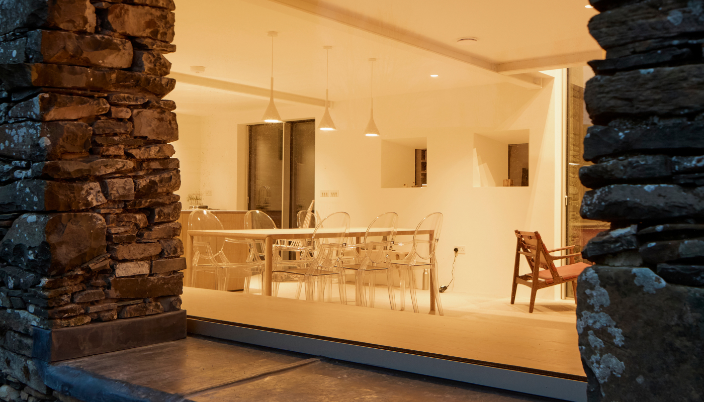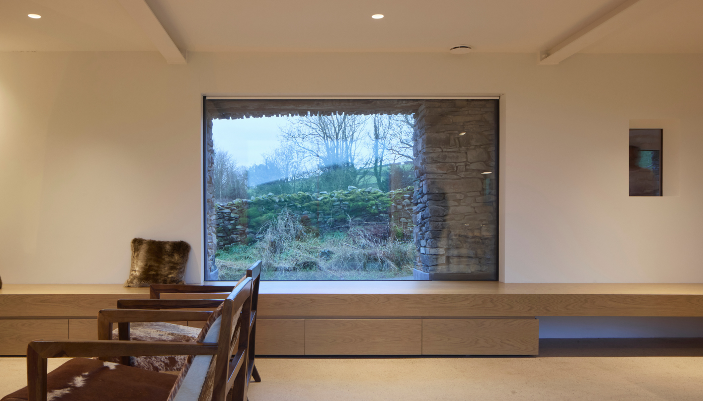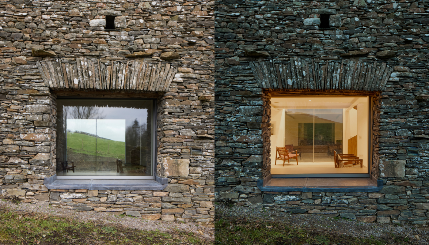 Kluczowym celem było uzyskanie wizualnej lekkości i maksymalnej efektywności energetycznej. Wprowadzono dwa systemy Keller minimal windows, oba potrójnie oszklone. Największe z nich, o wymiarach blisko 2,8 m szerokości i 3,3 m wysokości, zostało precyzyjnie zestawione z bezramowym oknem konstrukcyjnym w tylnej elewacji, tworząc przejrzystą linię widoku przez całą głębokość budynku. Dzięki temu powstało płynne połączenie wnętrza z otaczającym krajobrazem Cumbrii.