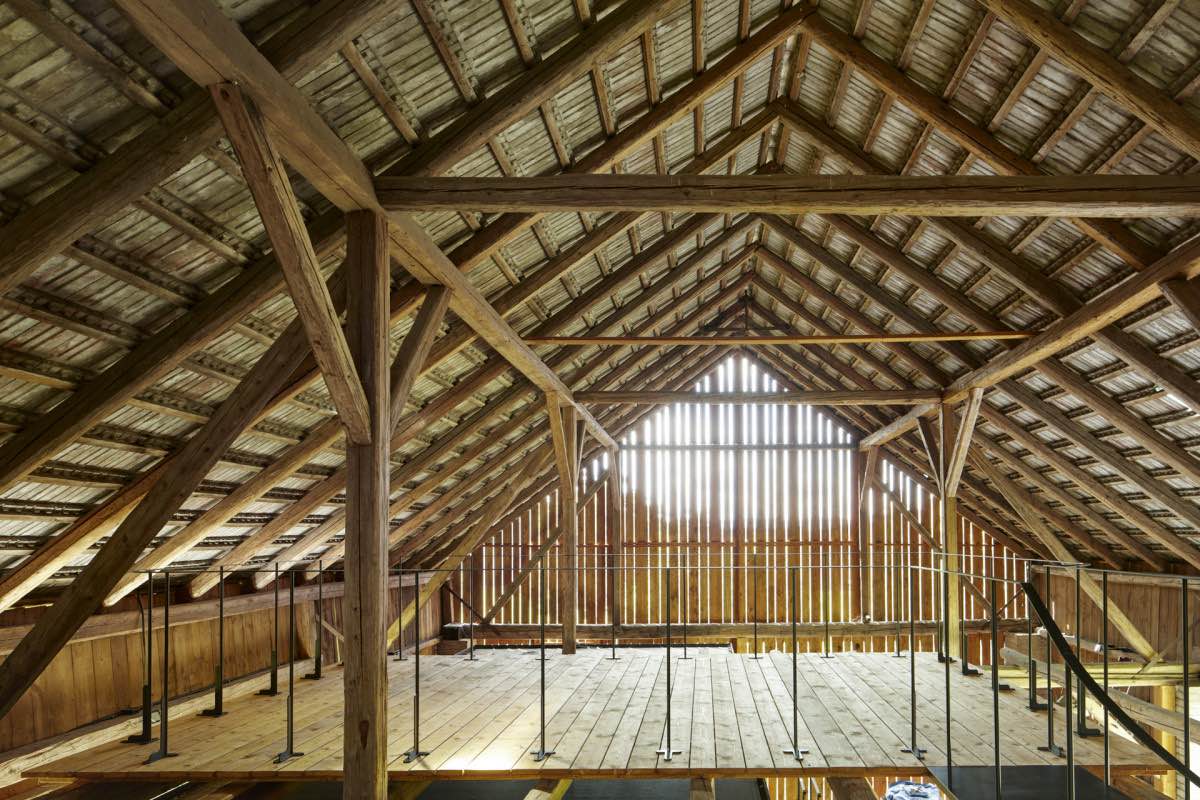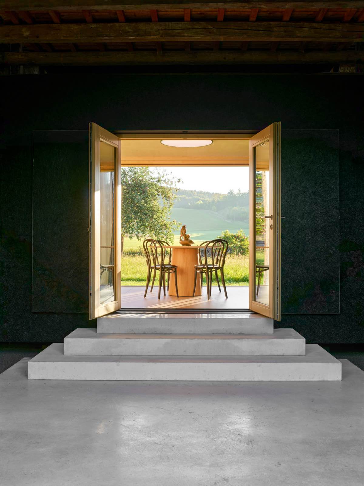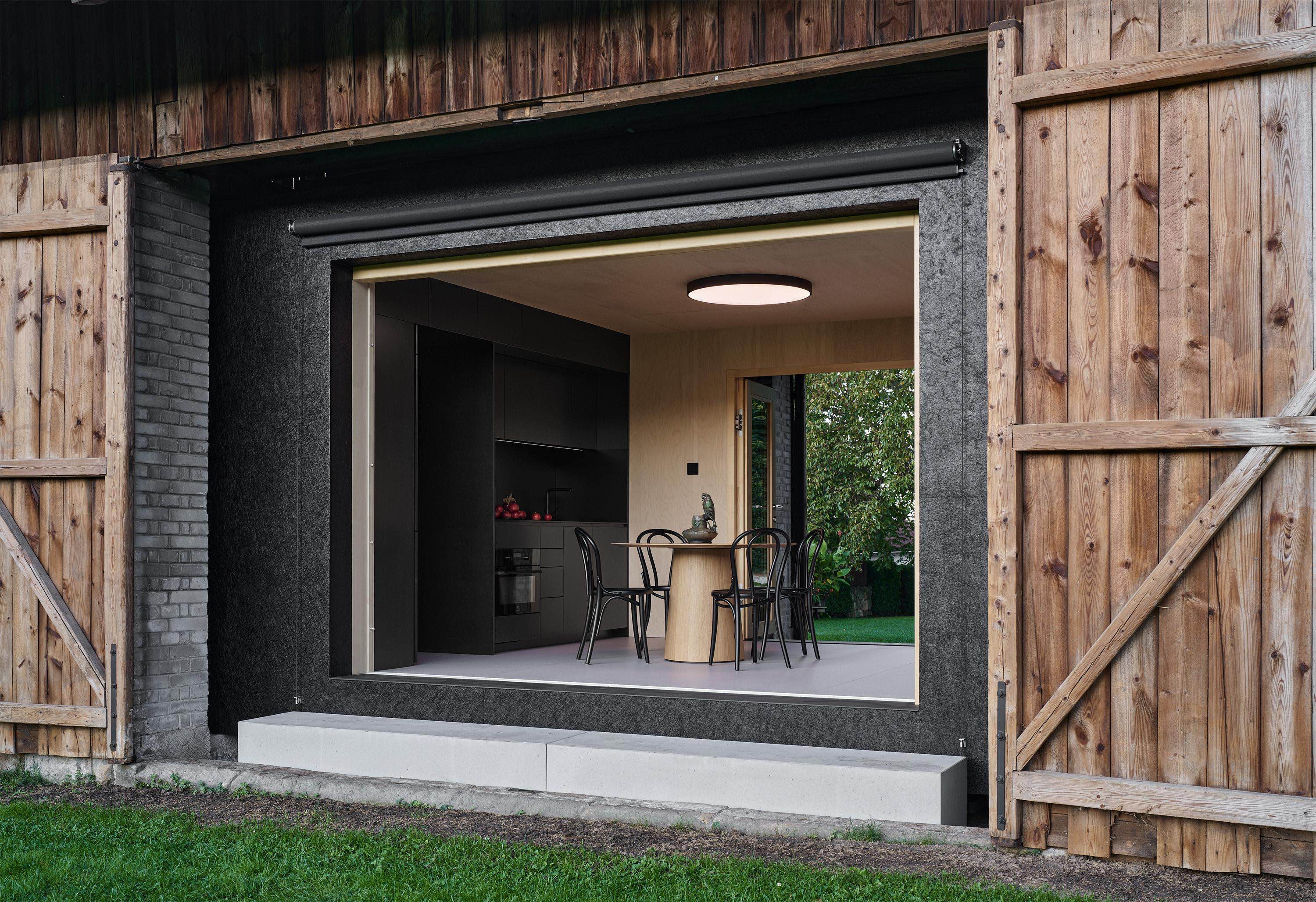 Projektanci świadomie postawili na subtelność i nienachalność ingerencji. Nowa jednostka została opakowana w czarną asfaltową membranę, co nadaje jej techniczny, współczesny charakter, jednocześnie kontrastujący z surową, drewnianą strukturą stodoły. Betonowa płyta, która wysuwa się na dziedziniec, staje się pierwszym sygnałem nowej funkcji – po otwarciu wrót tworzy przedłużenie przestrzeni, prowadząc aż do monolitycznych schodów przy wejściu.