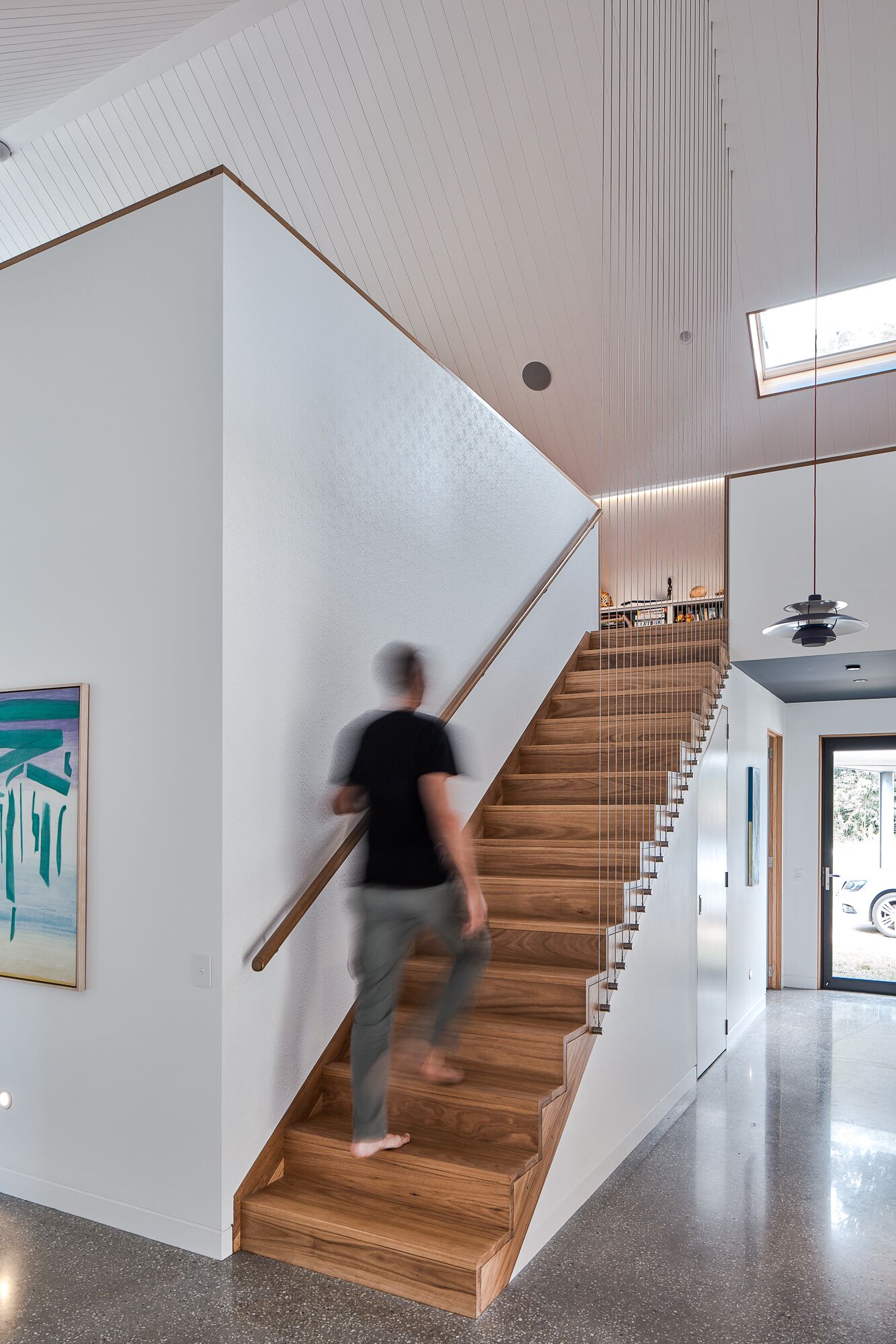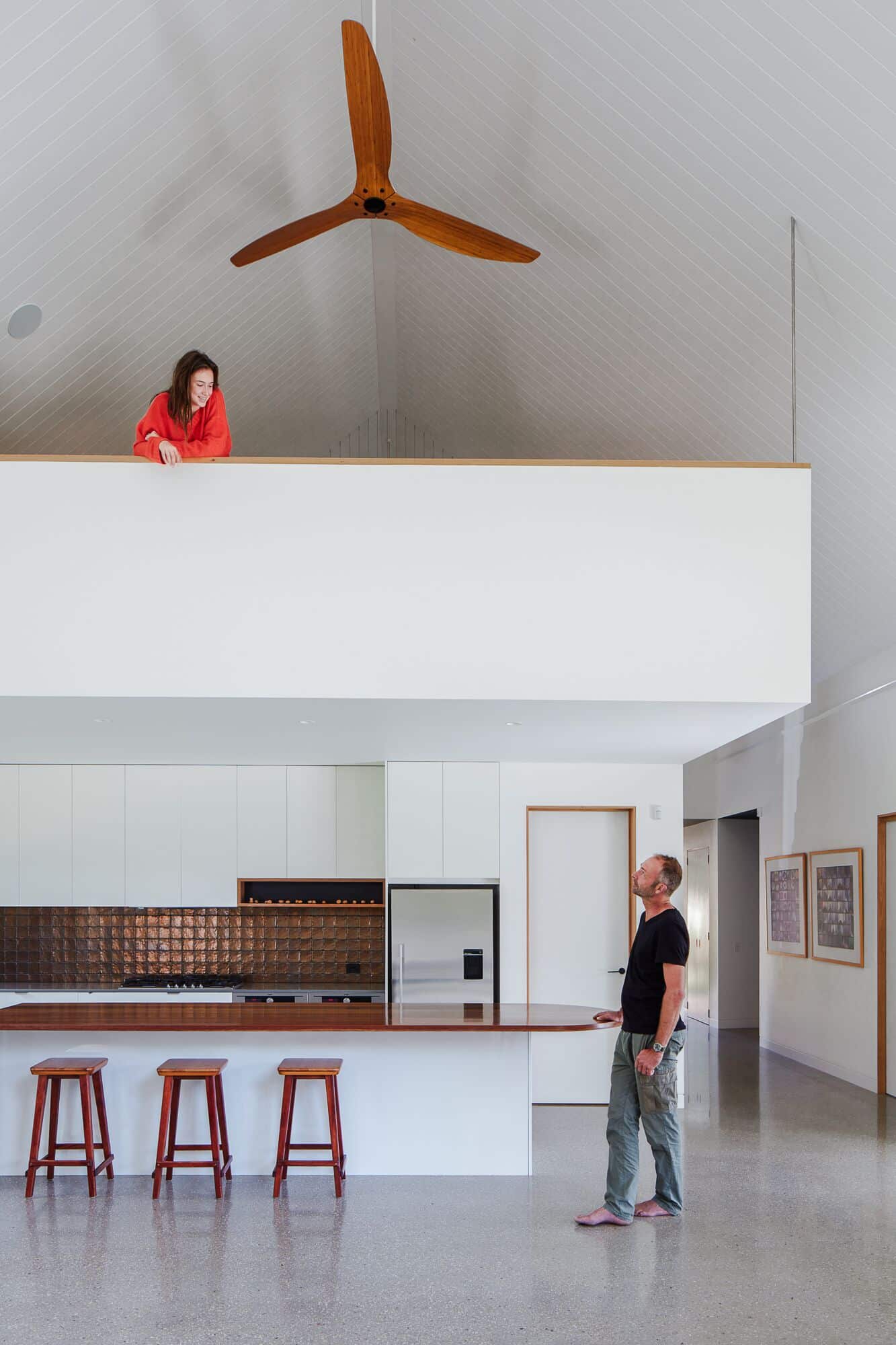 Projekt został zaplanowany z naciskiem na efektywność energetyczną, praktyczność i komfort użytkowania. Tim Sharpe zaprojektował dom jako przestrzeń dopasowaną do rytmu życia swojej rodziny – z wydzielonymi strefami prywatnymi i wspólnymi, wysoką izolacyjnością termiczną oraz systemem podłogowego ogrzewania i chłodzenia o szerokim zakresie regulacji. Każdy element, od układu pomieszczeń po wykończenia, został starannie przemyślany. „Rzeczy muszą wyglądać na to, czym są” – podkreśla Tim, wskazując na autentyczność materiałów, takich jak beton, drewno czy stal. Funkcja jest tu równa formie, a estetyka wynika z praktyczności – kluczowej zasady w nowoczesnym projektowaniu domów jednorodzinnych.
