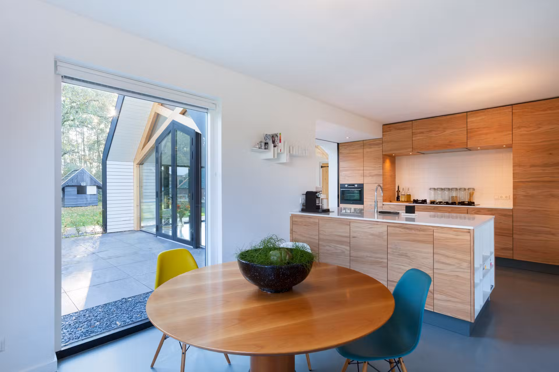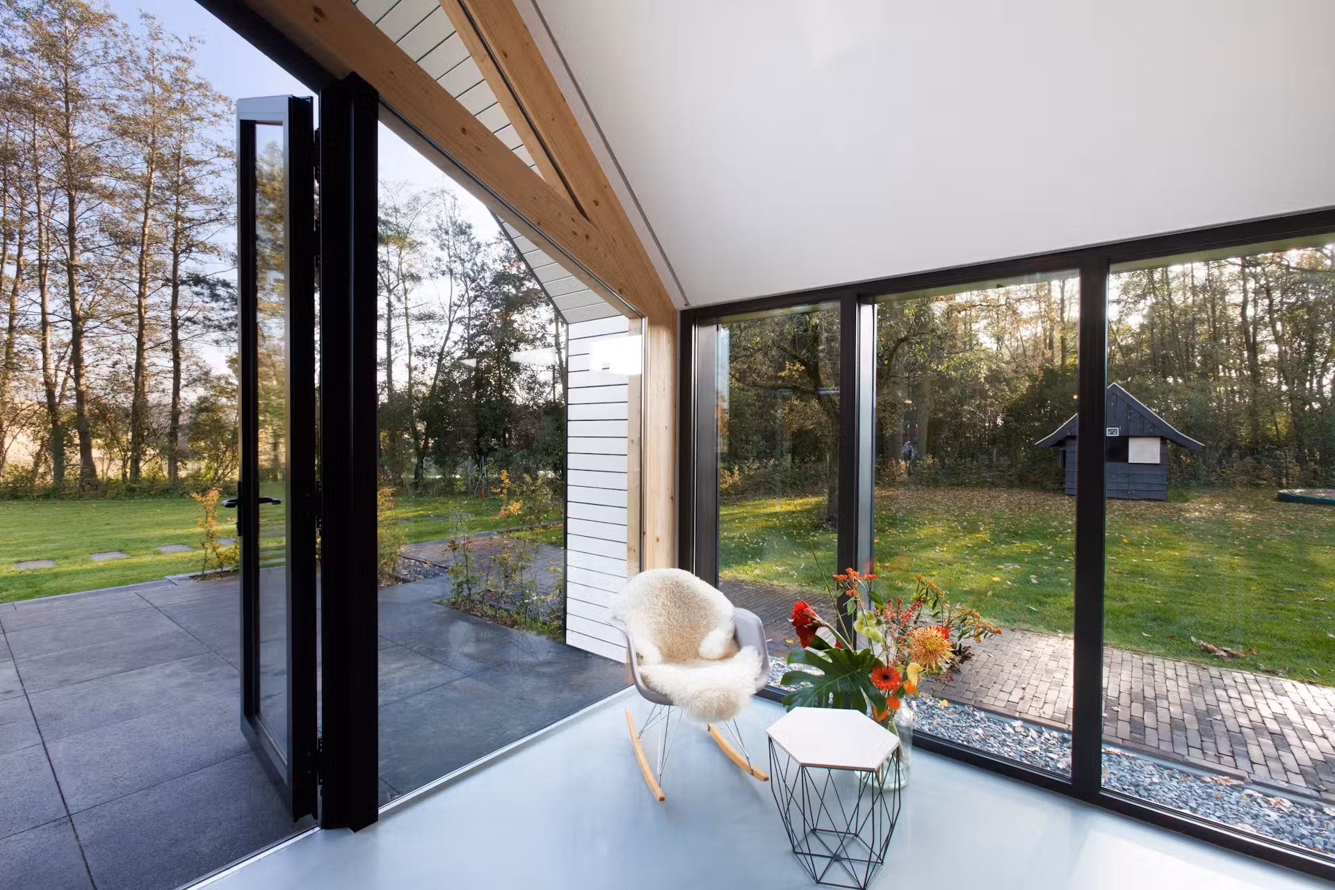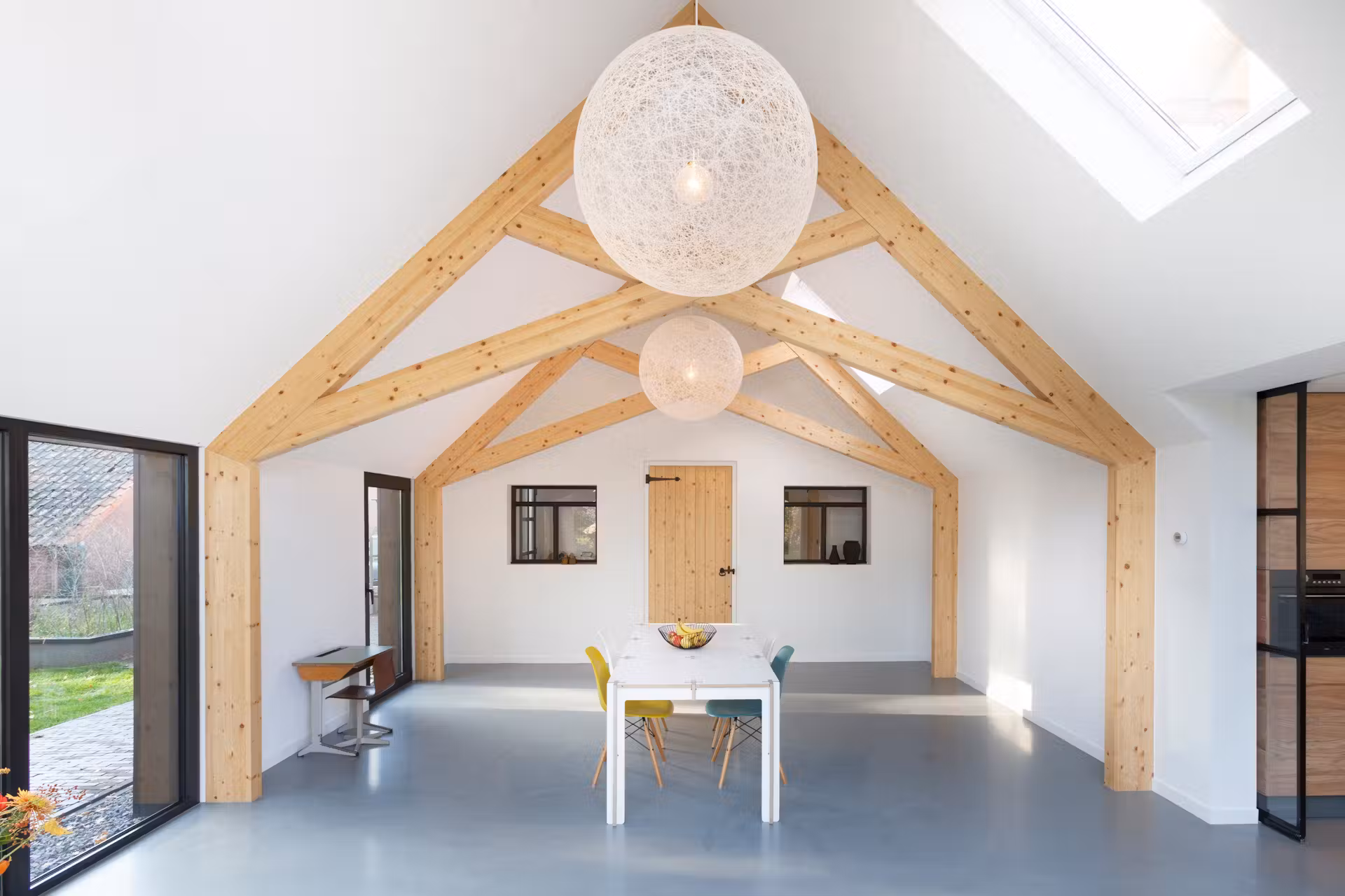 Jasne wnętrze z drewnianymi ramami nośnymi nawiązuje do historycznych konstrukcji holenderskich gospodarstw. Drewniane ramy zastosowano również jako element okien, co sprawia, że granice między wnętrzem a zewnętrzem niemal zanikają.