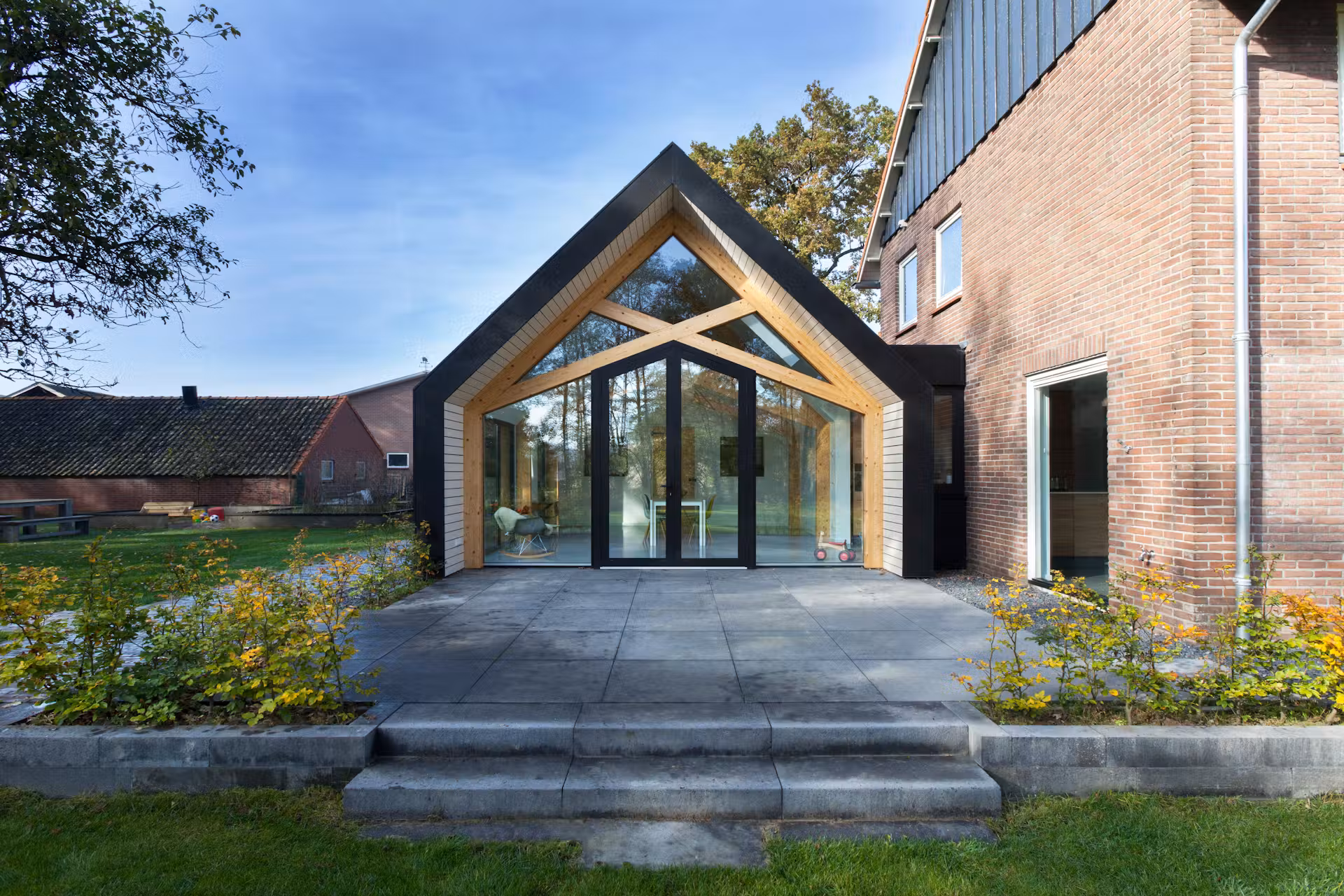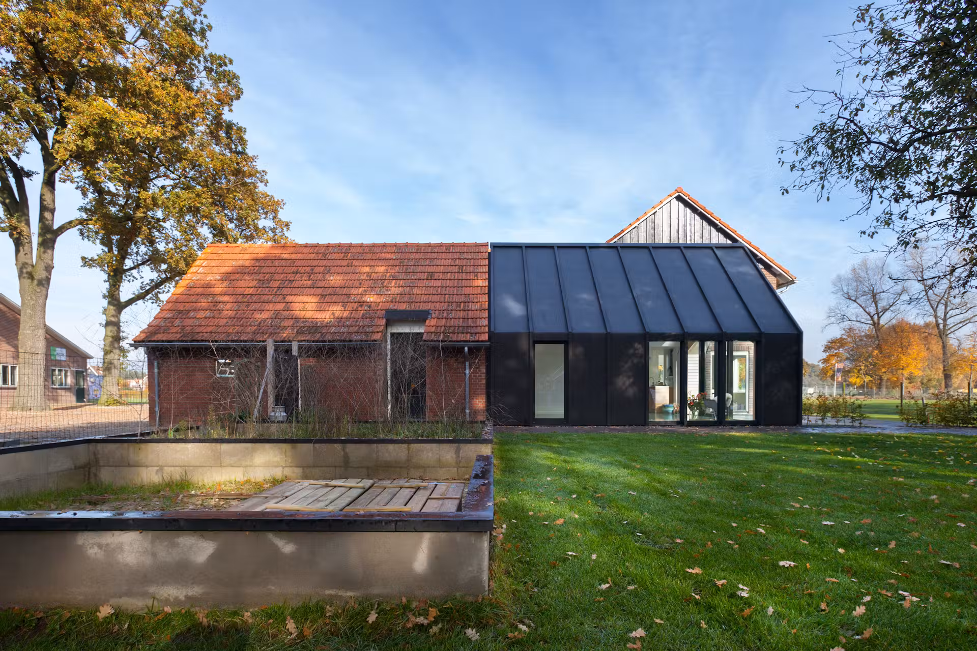 Rozbudowa opiera się na istniejącej stodole, której tradycyjne ceglane mury i ceramiczny dach zostały uzupełnione nowoczesną fasadą i dachem z czarnego cynku tytanowego. Ukryte aluminiowe ramy okienne nadają projektowi nowoczesny i wyrazisty charakter.