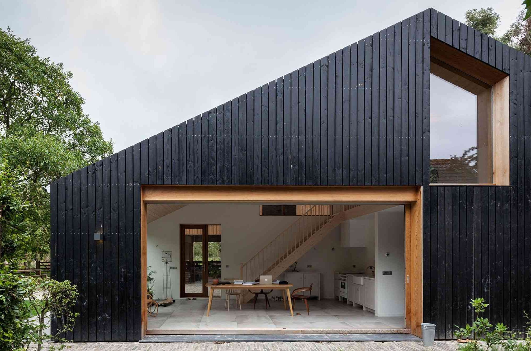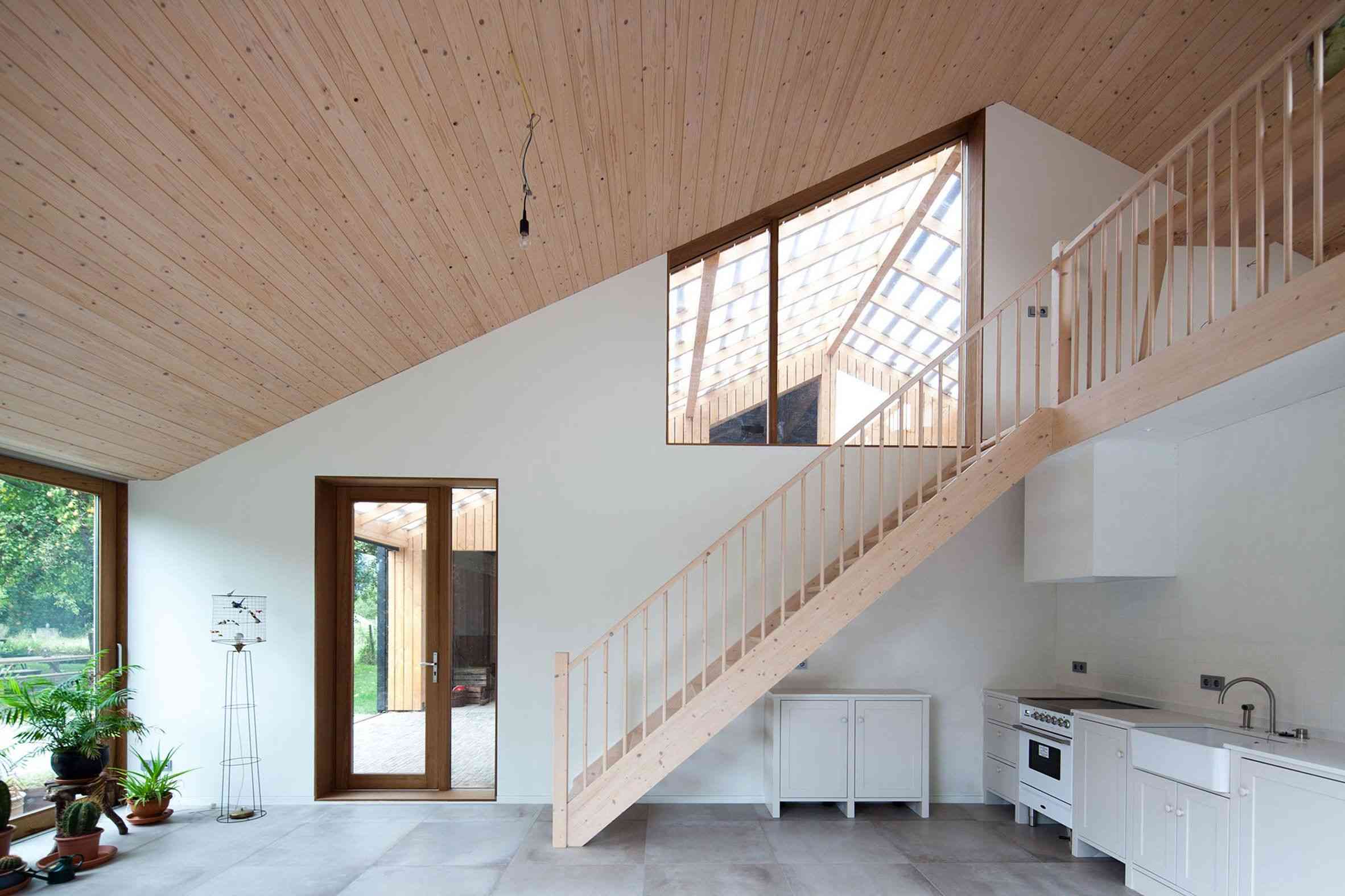 Okna umieszczone w czarnych elewacjach zostały wyraźnie zaakcentowane surowymi, drewnianymi ramami i otwierają budynek na ogród oraz podwórze. Wnętrze części mieszkalnej jest jasne i minimalistyczne – białe ściany zestawiono z jasnoszarymi płytami na podłodze parteru. Na antresolę, gdzie znajduje się m.in. drewniany stół jadalniany, prowadzą proste, drewniane schody. Barn Rijswijk to przykład architektury, która łączy funkcjonalność gospodarczą z komfortem mieszkania, zachowując szacunek dla historii i krajobrazu miejsca.