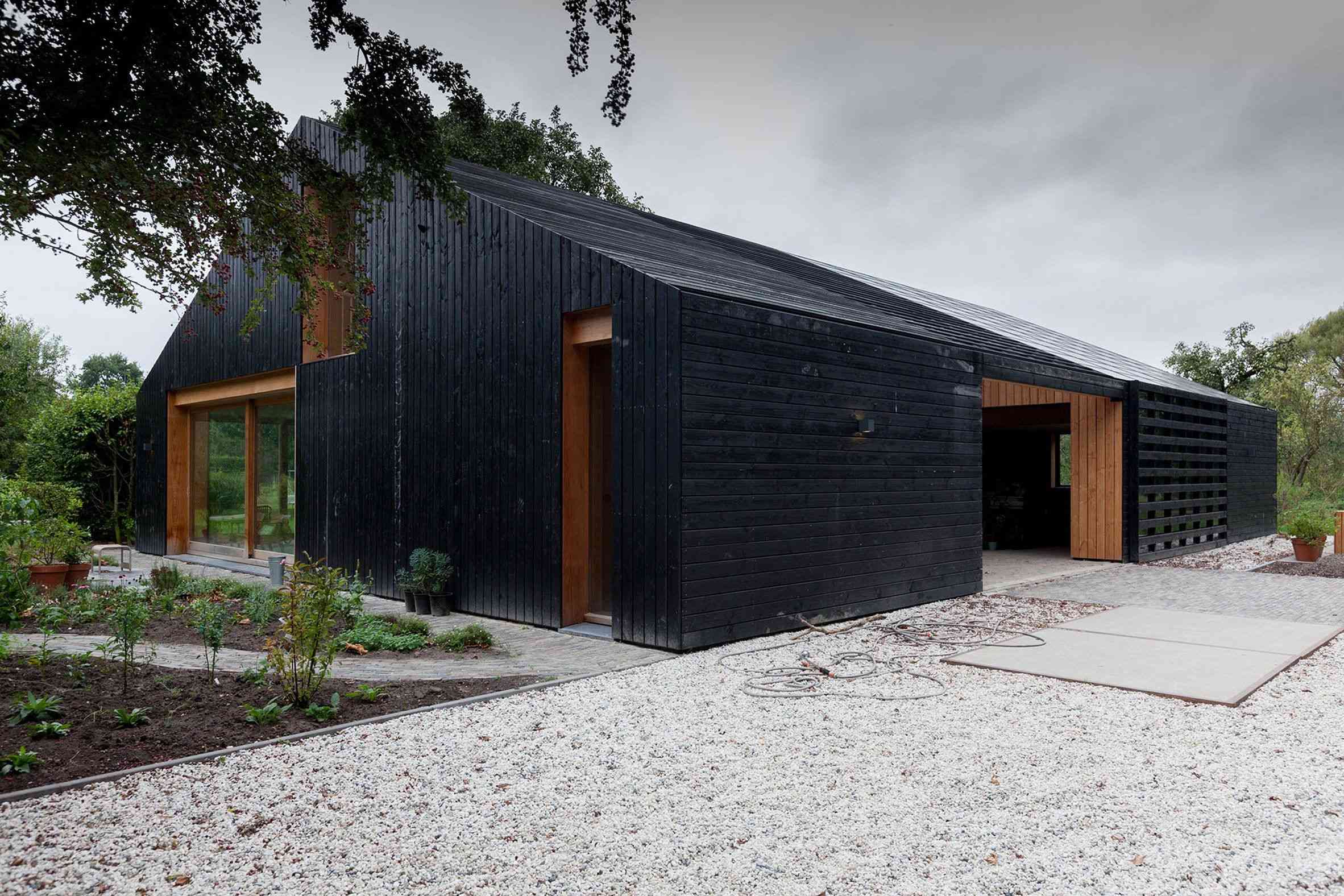Bryła budynku została obłożona długimi deskami z daglezji zielonej, barwionymi na czarno, które pokrywają zarówno ściany, jak i dwuspadowy dach. Ciemna elewacja kontrastuje z jasnym, naturalnym drewnem zastosowanym we wnętrzach, podkreślając prostotę i szczerość użytych materiałów. Konstrukcja została podzielona na trzy wyraźne strefy: część mieszkalną, stodołę oraz przestrzeń pośrednią z ażurowymi ścianami z listew. Szczególnie efektownie prezentuje się ona po zmroku, gdy światło z wnętrza przenika na zewnątrz, subtelnie doświetlając otoczenie farmy.