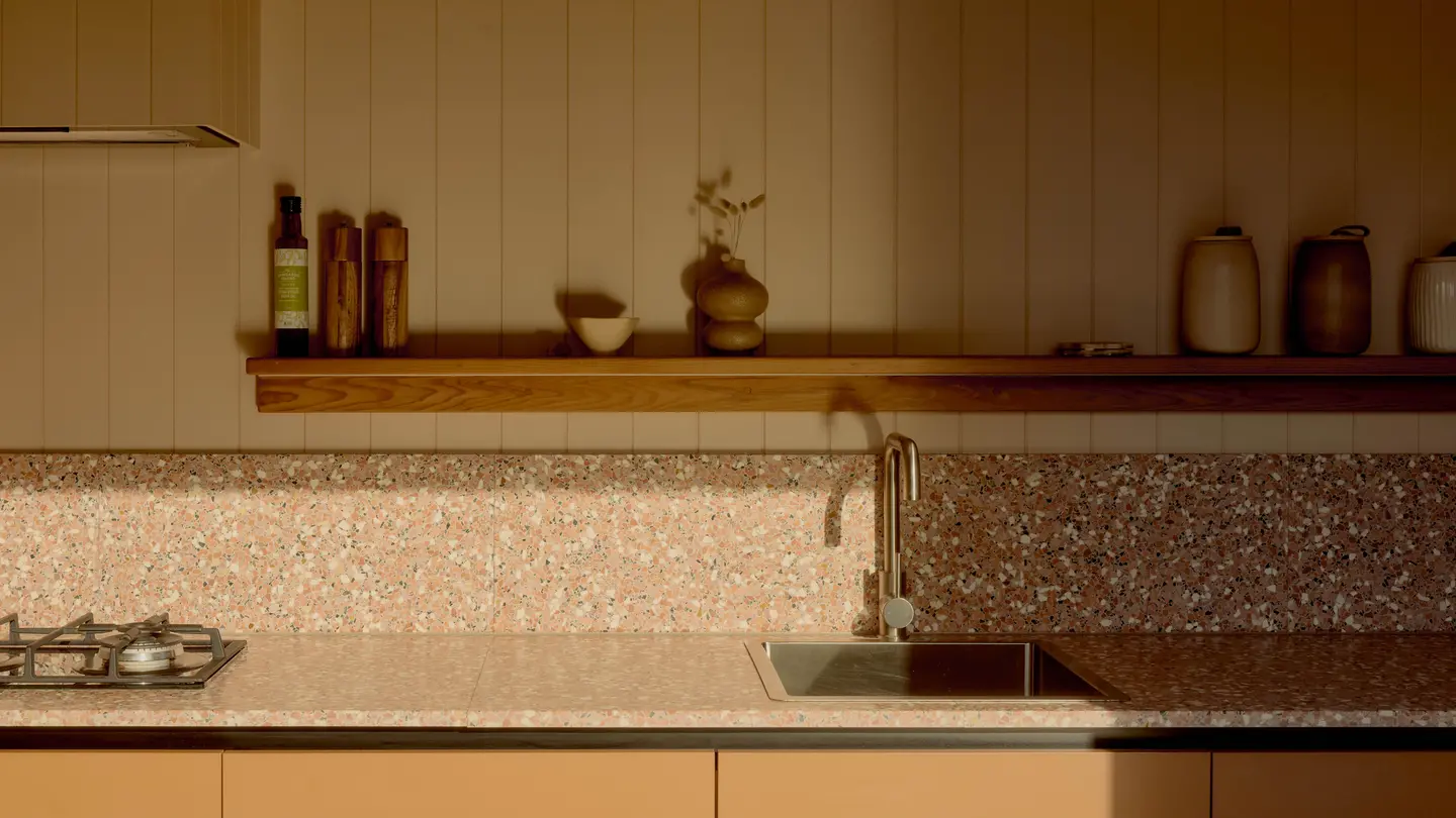 Wewnątrz architektka Kate Lawrence postawiła na maksymalne wykorzystanie pionu – wysokie sufity, duże przeszklenia i naturalne światło optycznie powiększają przestrzeń. Sprytnie wkomponowane szuflady pod łóżkiem, zabudowane siedziska oraz kompaktowa kuchnia z blatem terrazzo czynią wnętrze zarówno estetycznym, jak i ergonomicznym.