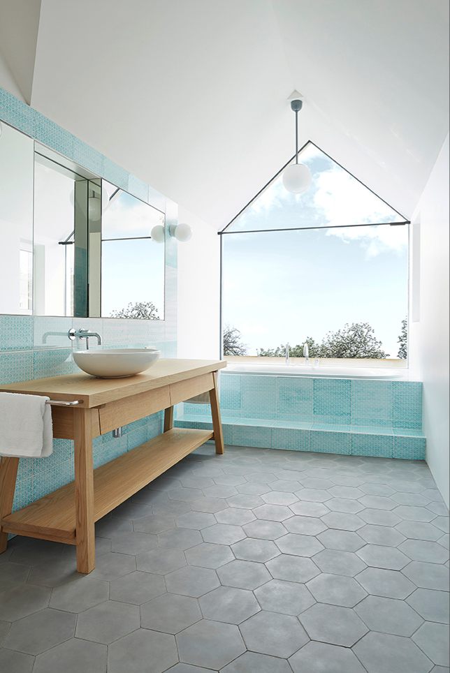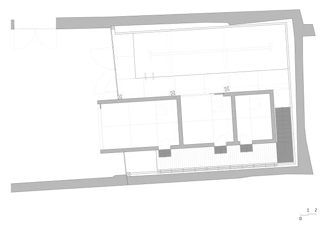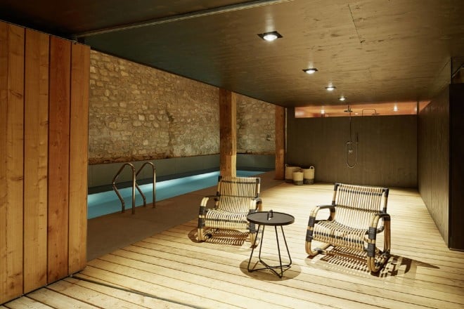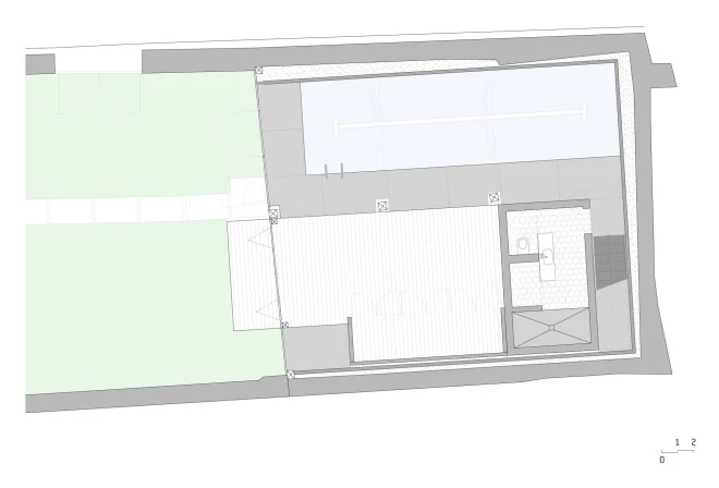 Wewnątrz znajduje się basen, strefa relaksu i dodatkowy pokój. Dzięki zastosowaniu przesuwanych okiennic i wielkich bram, przestrzeń można niemal całkowicie otworzyć na ogród. Przezroczyste dachówki z pleksiglasu, rozmieszczone nieregularnie na dachu, wpuszczają światło dzienne, tworząc magiczne refleksy na wodzie. Całość wnętrza inspirowana jest minimalizmem w stylu japońskim – z matami i naturalnymi materiałami.