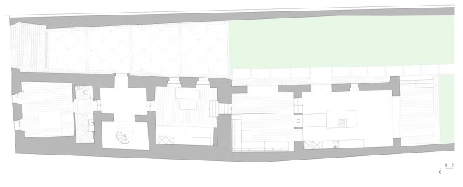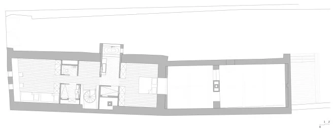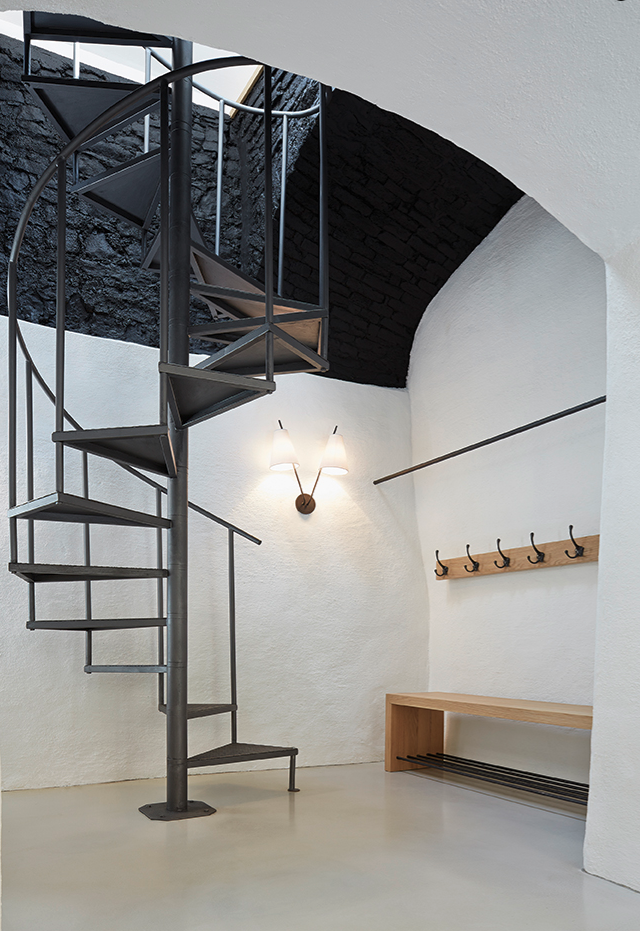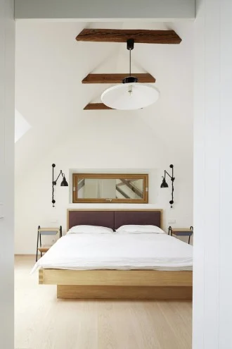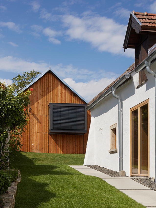 Główna część mieszkalna została zrewitalizowana z dbałością o detale. Dwie nowe lukarny dachowe, w tym jedna o wyrazistej bryle pokrytej cementową płytą włóknistą, ożywiają elewację, nie naruszając jednocześnie harmonii z historyczną zabudową. Nowoczesne drewniane okna z wąskimi ramami wkomponowano w ściany z białym tynkiem, pozwalając zachować nieregularności oryginalnych struktur.