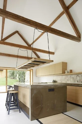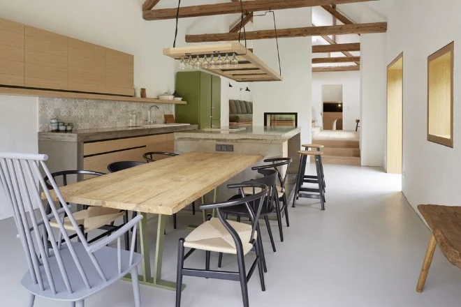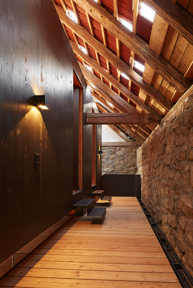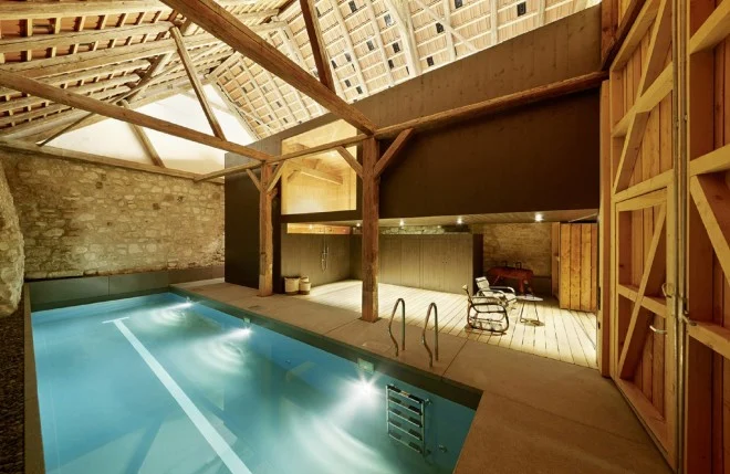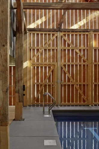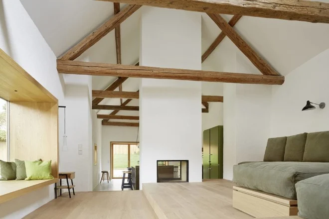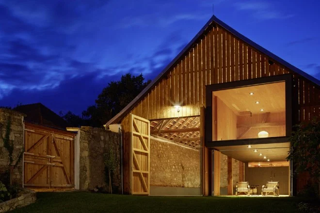 Dawna stodoła to dziś wzorcowa nowoczesna stodoła mieszkalna, pełniąca funkcję strefy rekreacyjnej. Zachowano oryginalną więźbę dachową i kamienne ściany, całkowicie otwierając przestrzeń wnętrza. Wprowadzono konstrukcję „dom w domu” – minimalistyczny moduł w konstrukcji szkieletowej, wykończony drewnem modrzewiowym i sosną Oregon.