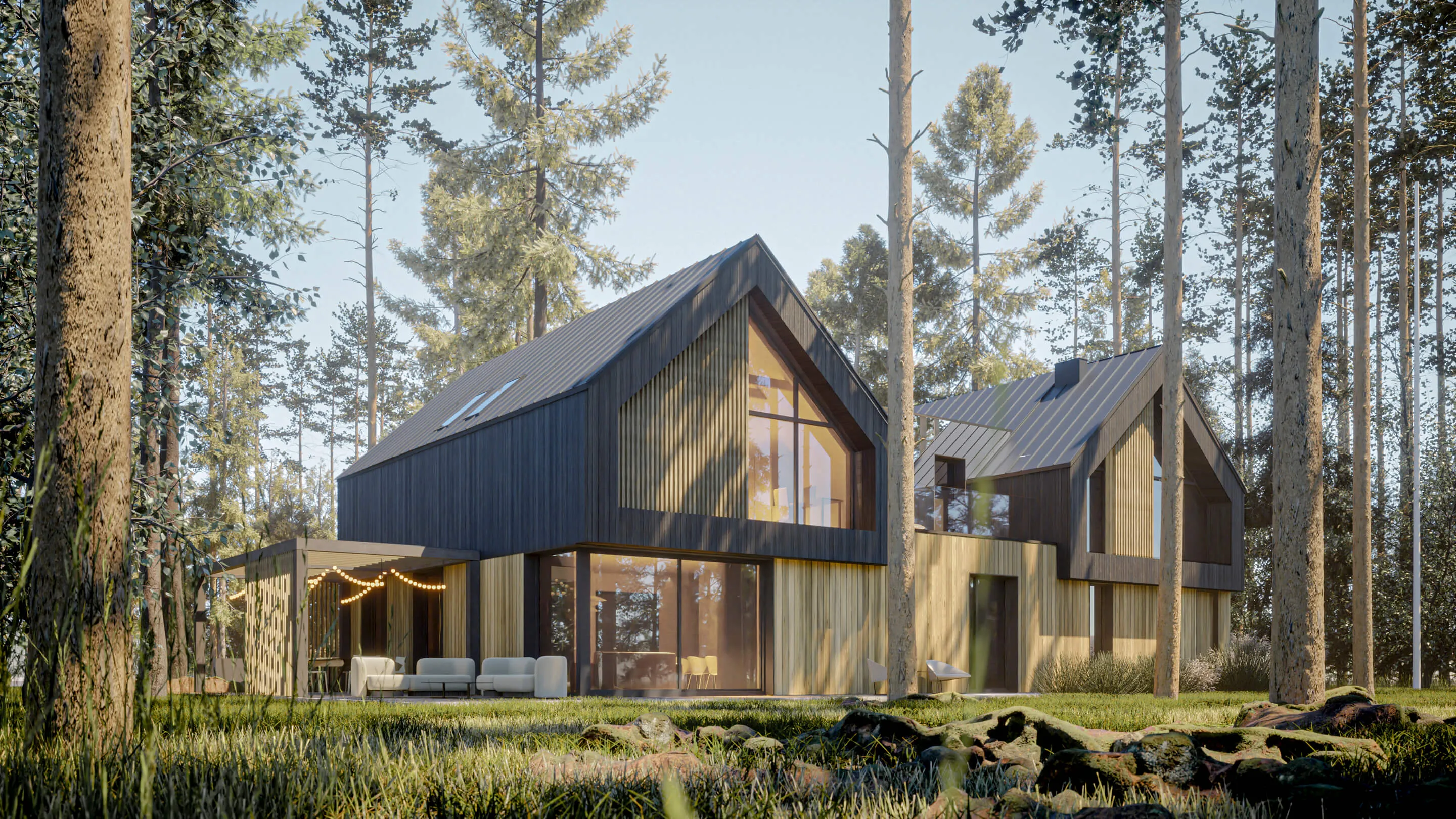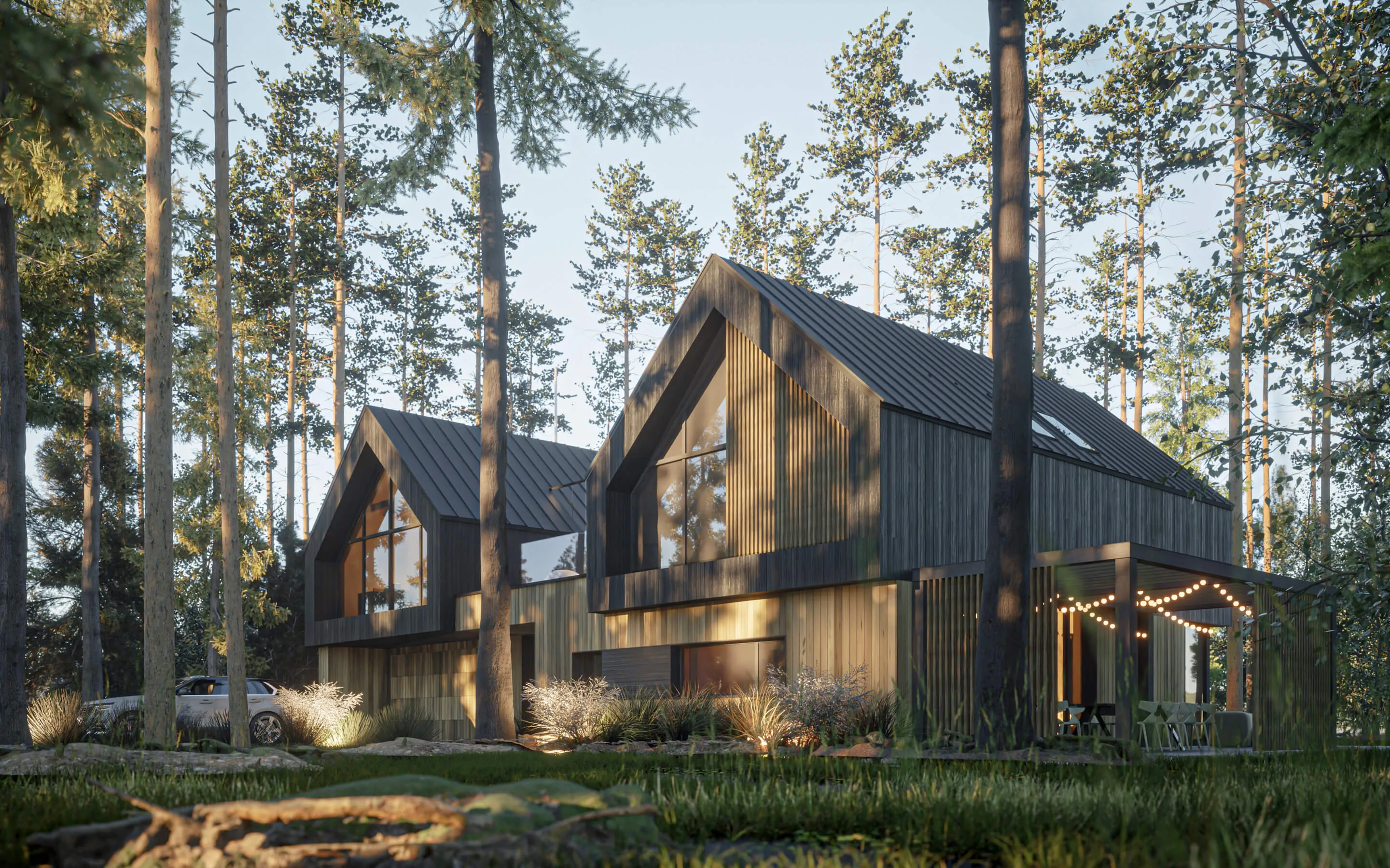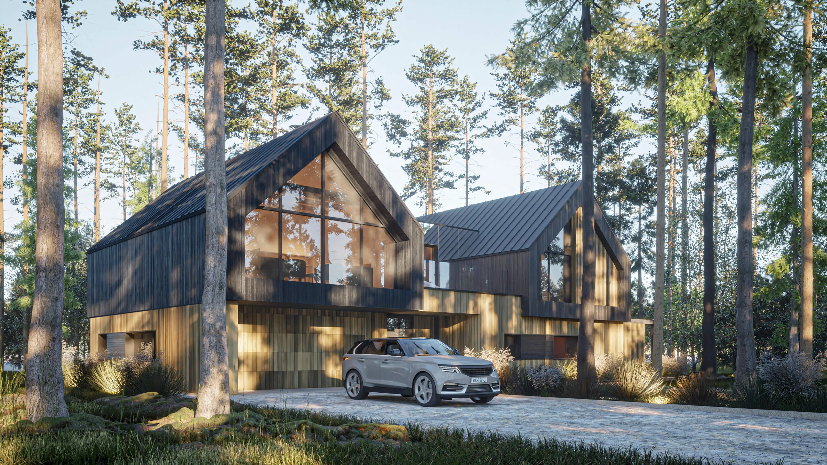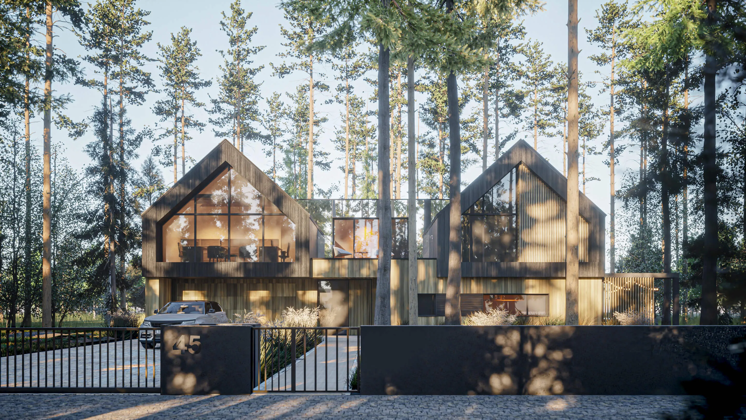 Odnalezienie właściwego miejsca na lokalizację budynku z racji na dużą ilość drzew, okazało się nie lada wyzwaniem. Z zachowaniem minimalnej ingerencji w drzewostan projektowany dom został wkomponowany centralnie na działce. Forma zabudowy opiera się na zwartym planie prostokąta, pełniącego rolę cokołu. Natomiast na piętrze wyodrębniają się dwie symetrycznie zlokalizowane, bliźniacze (twin) bryły w formie STODÓŁ z dachami dwuspadowymi o kącie nachylenia 42 stopni. Przestrzeń między nimi jest połączona krótkim łącznikiem, który jest wykończony panelami ze szkła laminowanego powlekanym powłoką metaliczną o wysokich parametrach refleksyjnych. Ten zabieg nadaje lekkości połączenia oraz zanikania jego obecności w leśnym kontekście. Widocznym zabiegiem w przyziemiu budynku jest podcięcie niszy w elewacji frontowej, które podkreśla i zadasza główne wejście do budynku oraz wjazd do garażu. Całkowita wysokość budynku do kalenicy wynosi około 8,74 m.