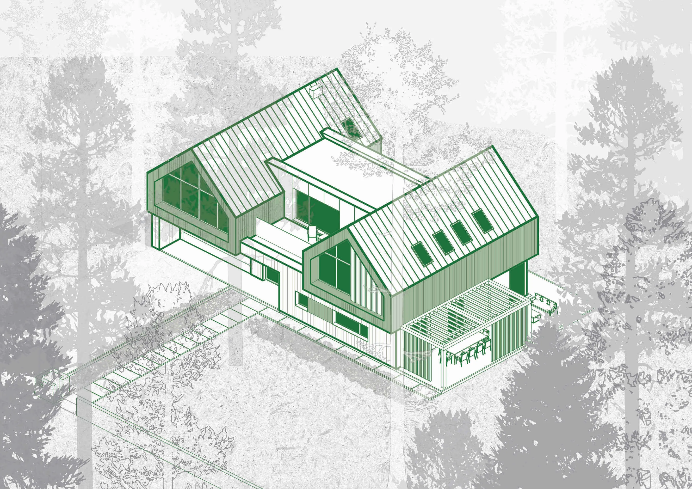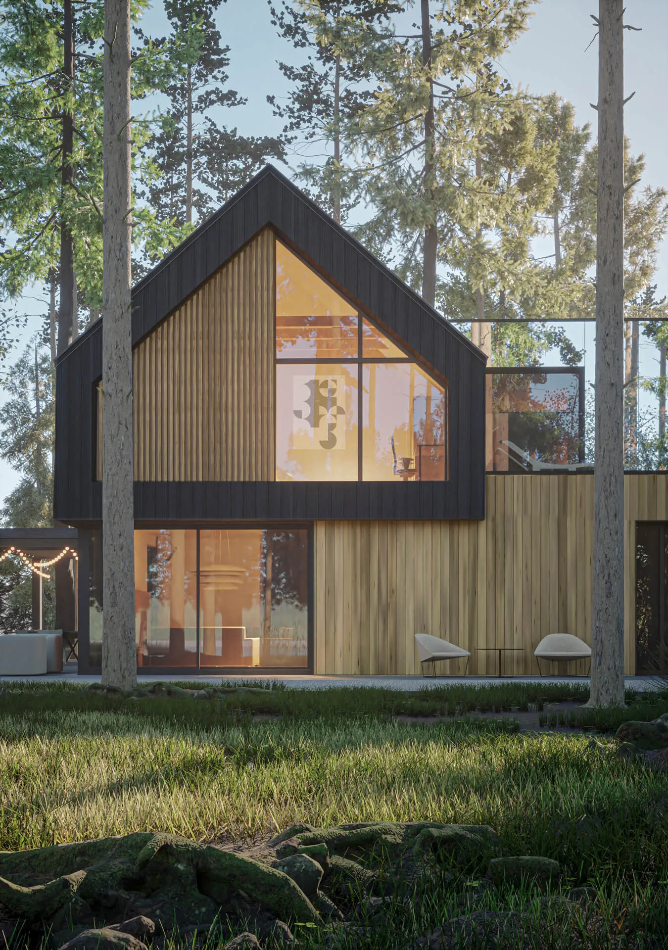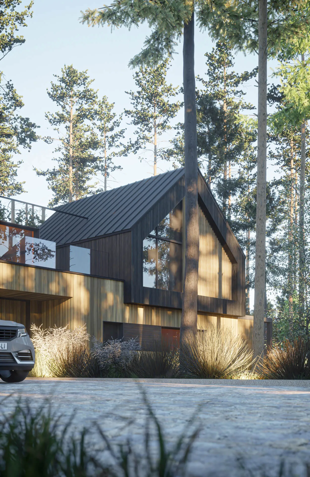 Odnalezienie właściwego miejsca na lokalizację budynku z racji na dużą ilość drzew, okazało się nie lada wyzwaniem. Z zachowaniem minimalnej ingerencji w drzewostan projektowany dom został wkomponowany centralnie na działce. Forma zabudowy opiera się na zwartym planie prostokąta, pełniącego rolę cokołu. Natomiast na piętrze wyodrębniają się dwie symetrycznie zlokalizowane, bliźniacze (twin) bryły w formie STODÓŁ z dachami dwuspadowymi o kącie nachylenia 42 stopni. Przestrzeń między nimi jest połączona krótkim łącznikiem, który jest wykończony panelami ze szkła laminowanego powlekanym powłoką metaliczną o wysokich parametrach refleksyjnych. Ten zabieg nadaje lekkości połączenia oraz zanikania jego obecności w leśnym kontekście. Widocznym zabiegiem w przyziemiu budynku jest podcięcie niszy w elewacji frontowej, które podkreśla i zadasza główne wejście do budynku oraz wjazd do garażu. Całkowita wysokość budynku do kalenicy wynosi około 8,74 m.