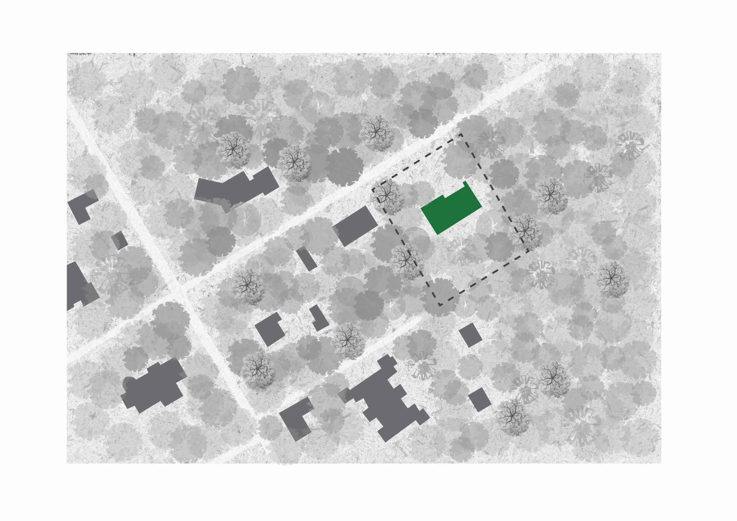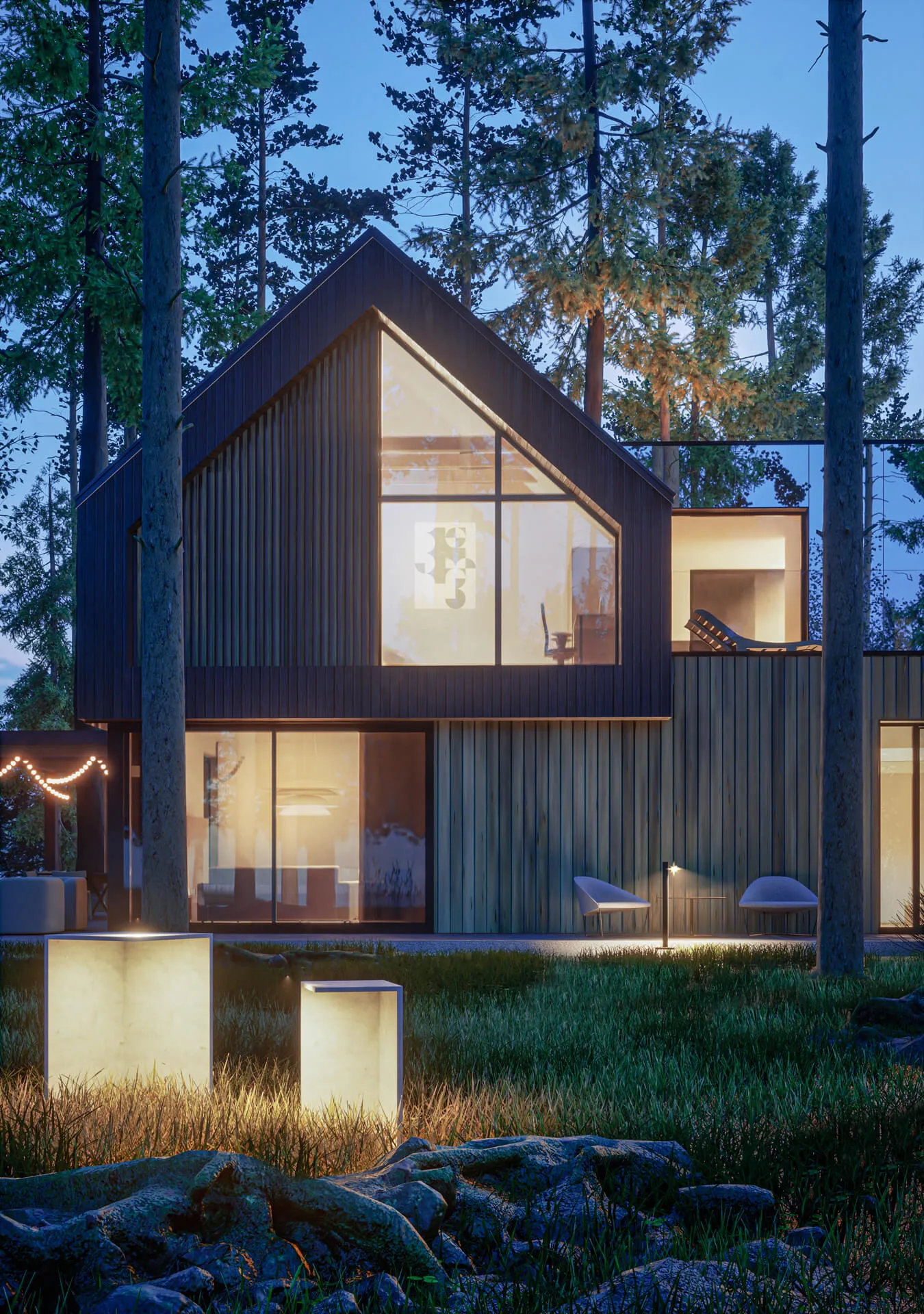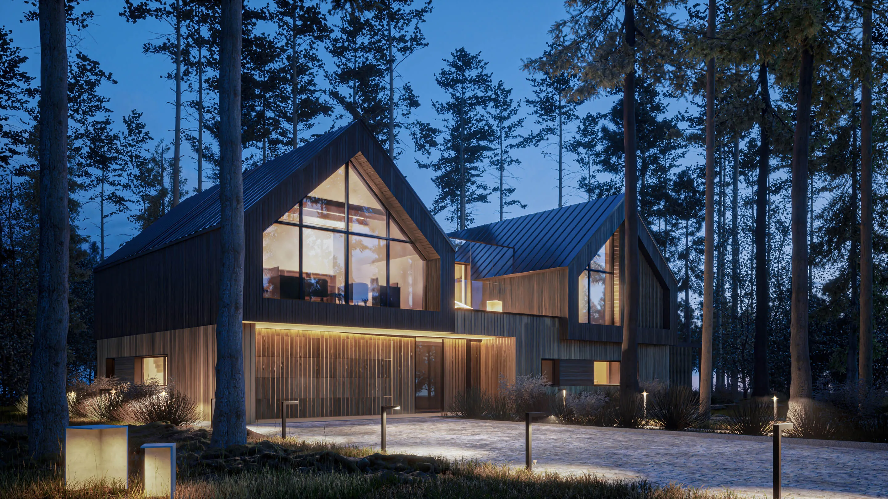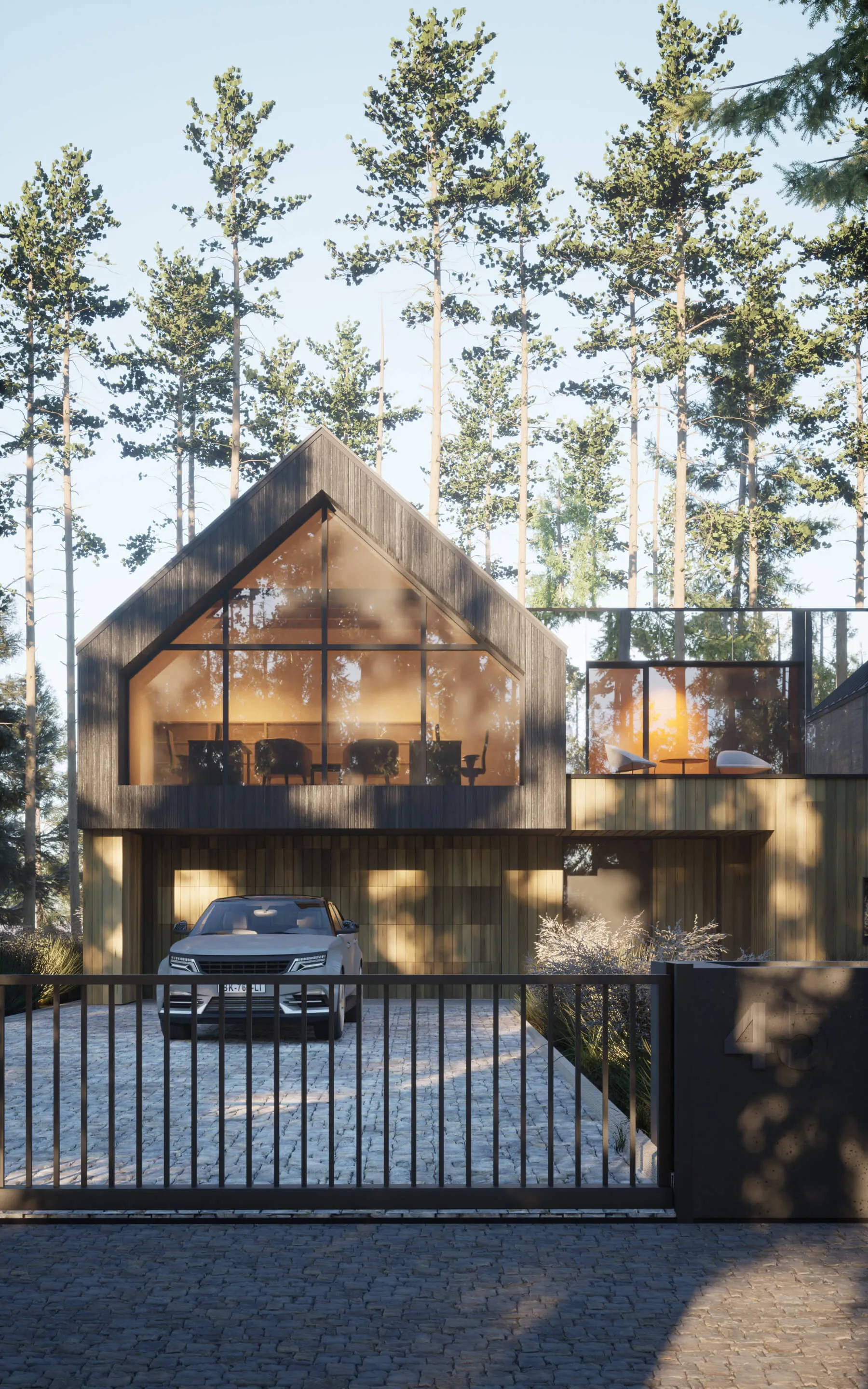 Odnalezienie właściwego miejsca na lokalizację budynku z racji na dużą ilość drzew, okazało się nie lada wyzwaniem. Z zachowaniem minimalnej ingerencji w drzewostan projektowany dom został wkomponowany centralnie na działce. Forma zabudowy opiera się na zwartym planie prostokąta, pełniącego rolę cokołu. Natomiast na piętrze wyodrębniają się dwie symetrycznie zlokalizowane, bliźniacze (twin) bryły w formie STODÓŁ z dachami dwuspadowymi o kącie nachylenia 42 stopni. Przestrzeń między nimi jest połączona krótkim łącznikiem, który jest wykończony panelami ze szkła laminowanego powlekanym powłoką metaliczną o wysokich parametrach refleksyjnych. Ten zabieg nadaje lekkości połączenia oraz zanikania jego obecności w leśnym kontekście. Widocznym zabiegiem w przyziemiu budynku jest podcięcie niszy w elewacji frontowej, które podkreśla i zadasza główne wejście do budynku oraz wjazd do garażu. Całkowita wysokość budynku do kalenicy wynosi około 8,74 m.