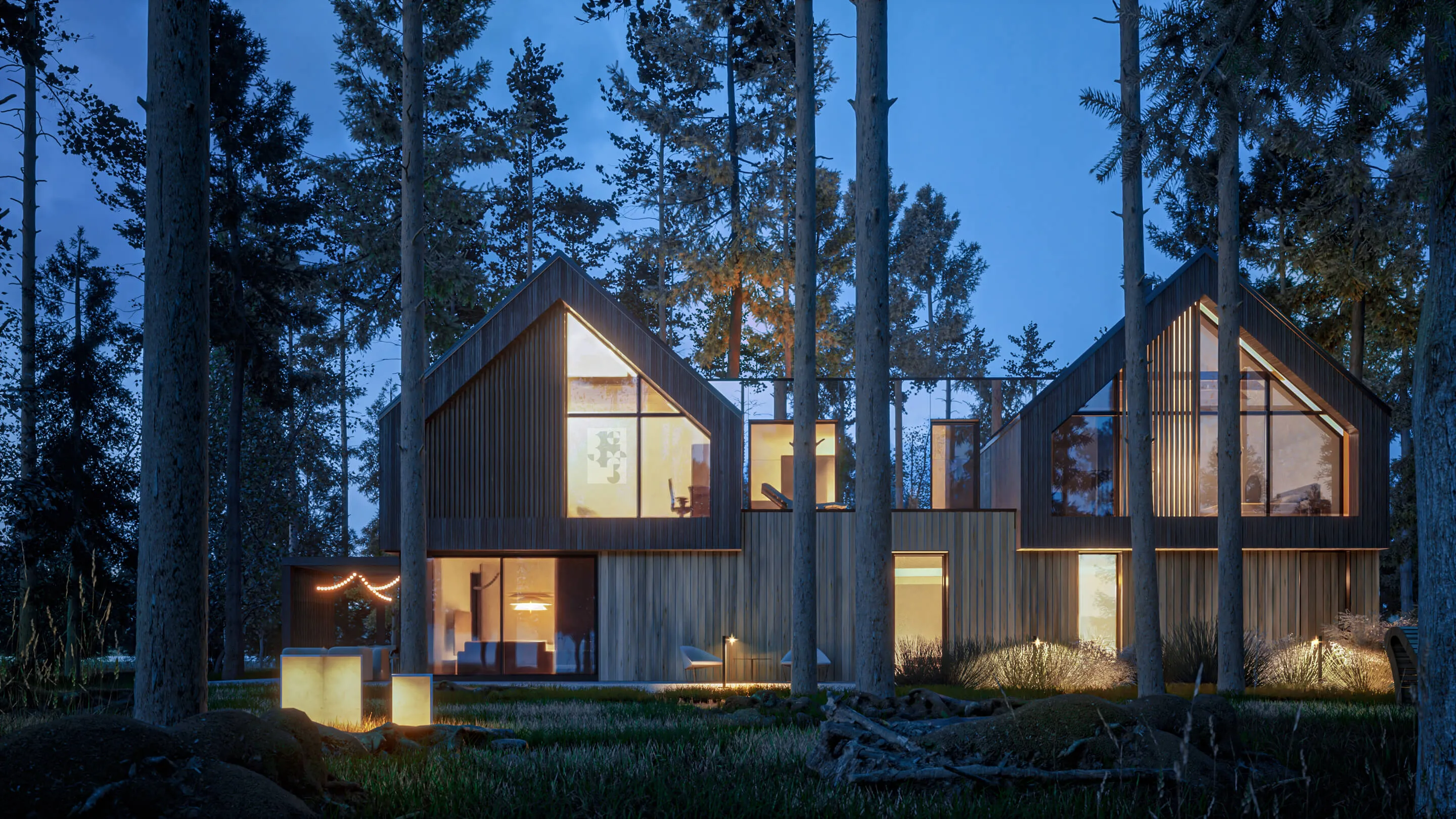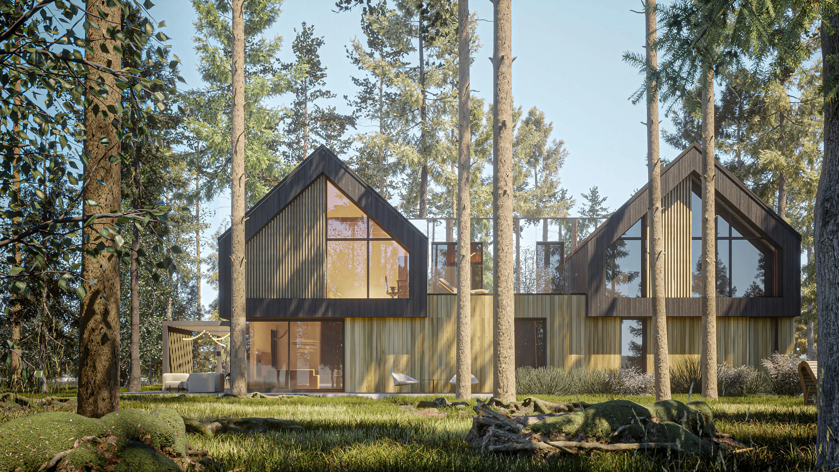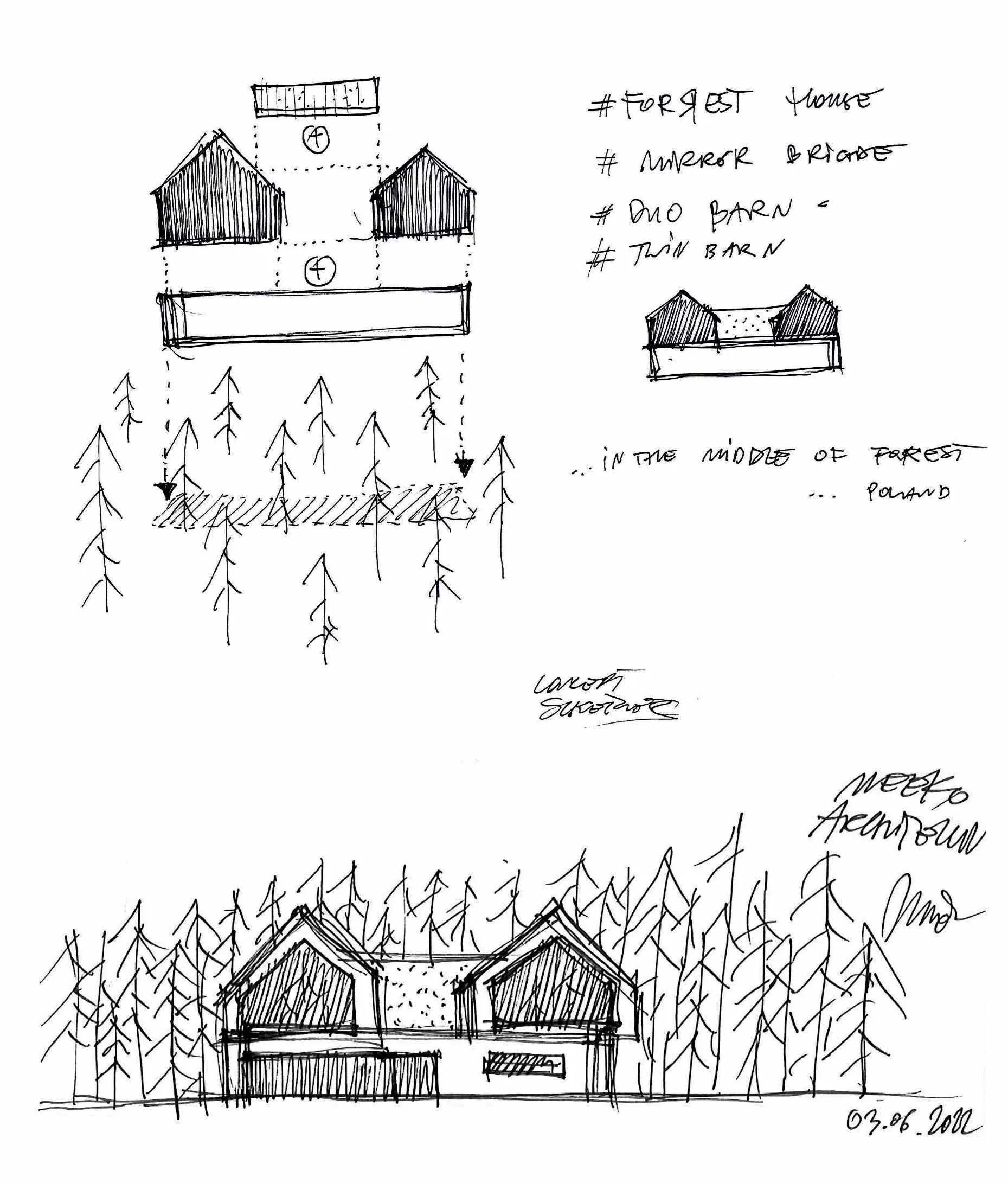 Niedaleko Warszawy, po prawej stronie Wisły, rozpościera się Mazowiecki Park Krajobrazowy, którego niewątpliwą zaletą jest bliskość stołecznego miasta. Gęsto zalesione tereny składają się głównie z borów sosnowych, a meandrująca pośród nich rzeka Świder to charakterystyczny element krajobrazu Ziemi Otwockiej. To w tym rejonie powstała koncepcja domu mieszkalnego opartego na formie bliźniaczych stodół wpisanych w leśny krajobraz. Historyczne sanatoria jak i domy letniskowe tym rejonie utrzymane są stylu nadświdrzańskim, które charakteryzują się lekką drewnianą konstrukcją, bogatymi ornamentami snycerskimi oraz wielopłaszczyznowymi werandami zwróconymi w stronę lasu. To właśnie na nich wypoczywali kuracjusze i wdychali zdrowe, sosnowe powietrze w okolicznych uzdrowiskach. Ten drewniany styl w architekturze potocznie został nazwany „świdermajer” i jest czymś wyjątkowym w skali Mazowsza. Dla nas stał się pretekstem do stworzenia koncepcji Be.Twin House pod Warszawą.