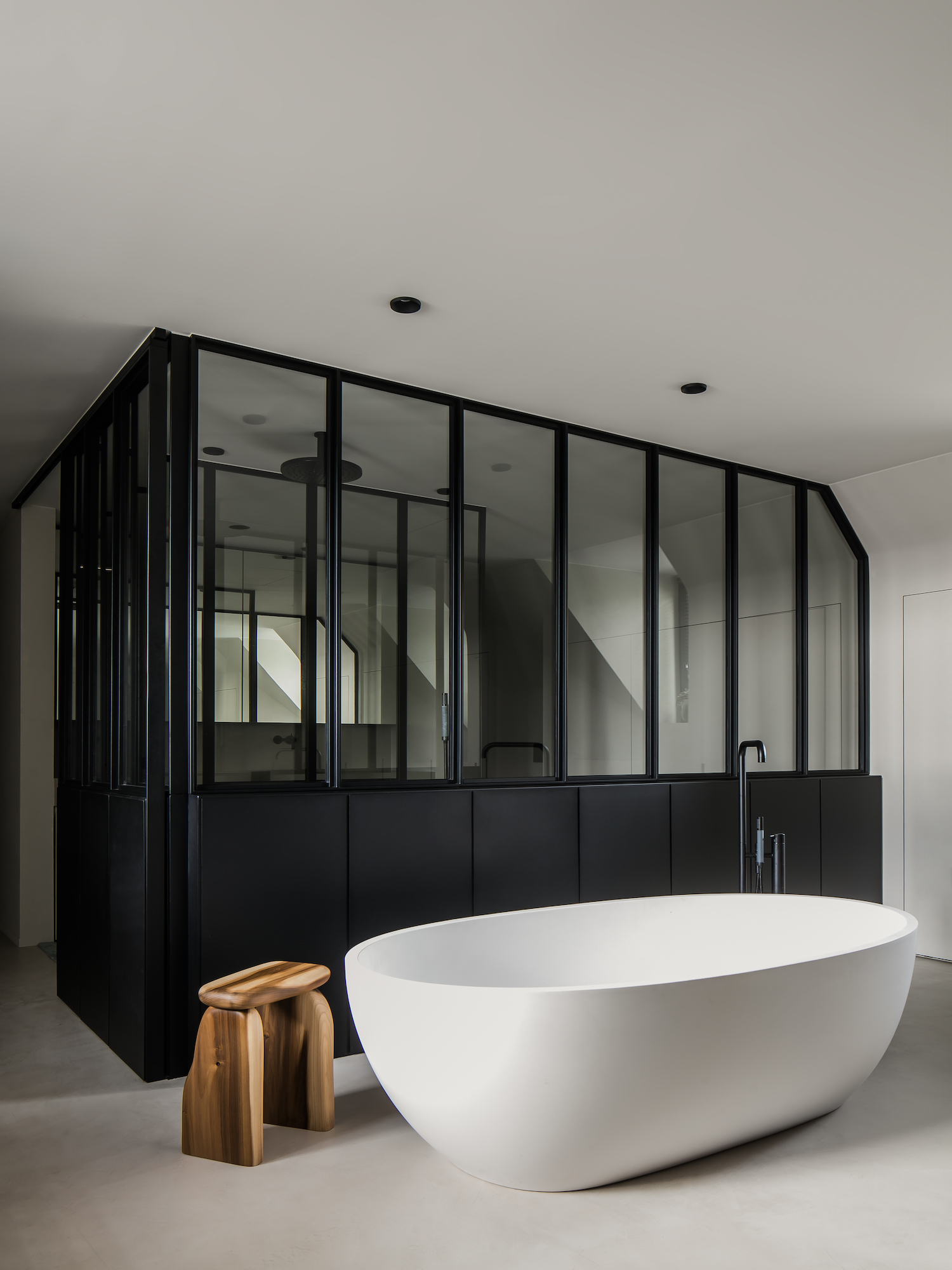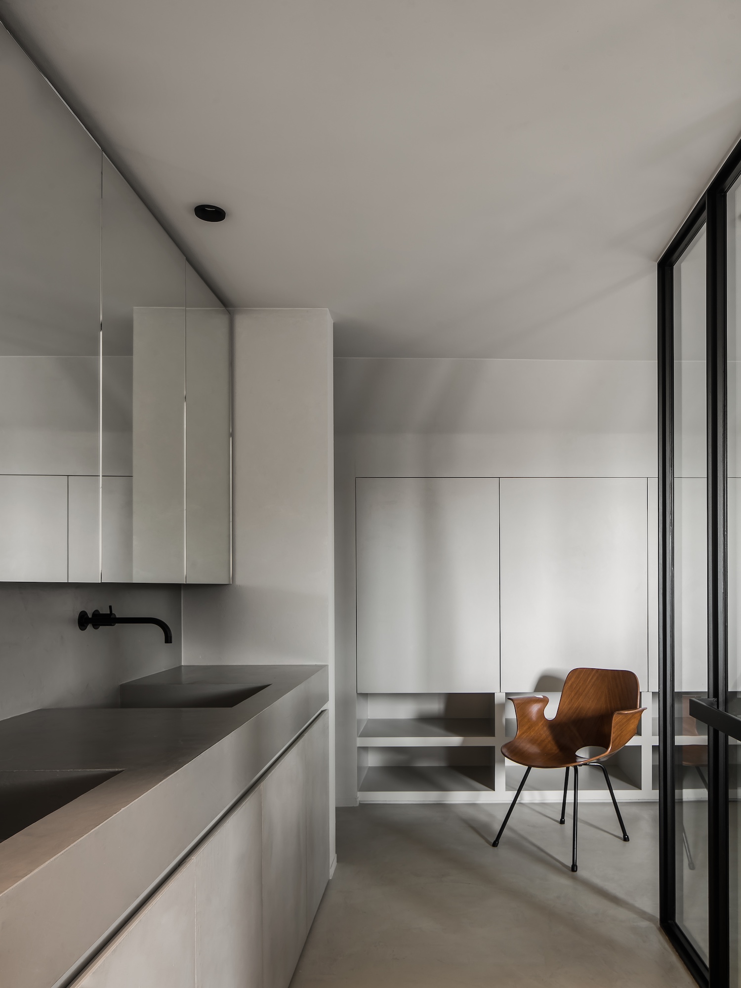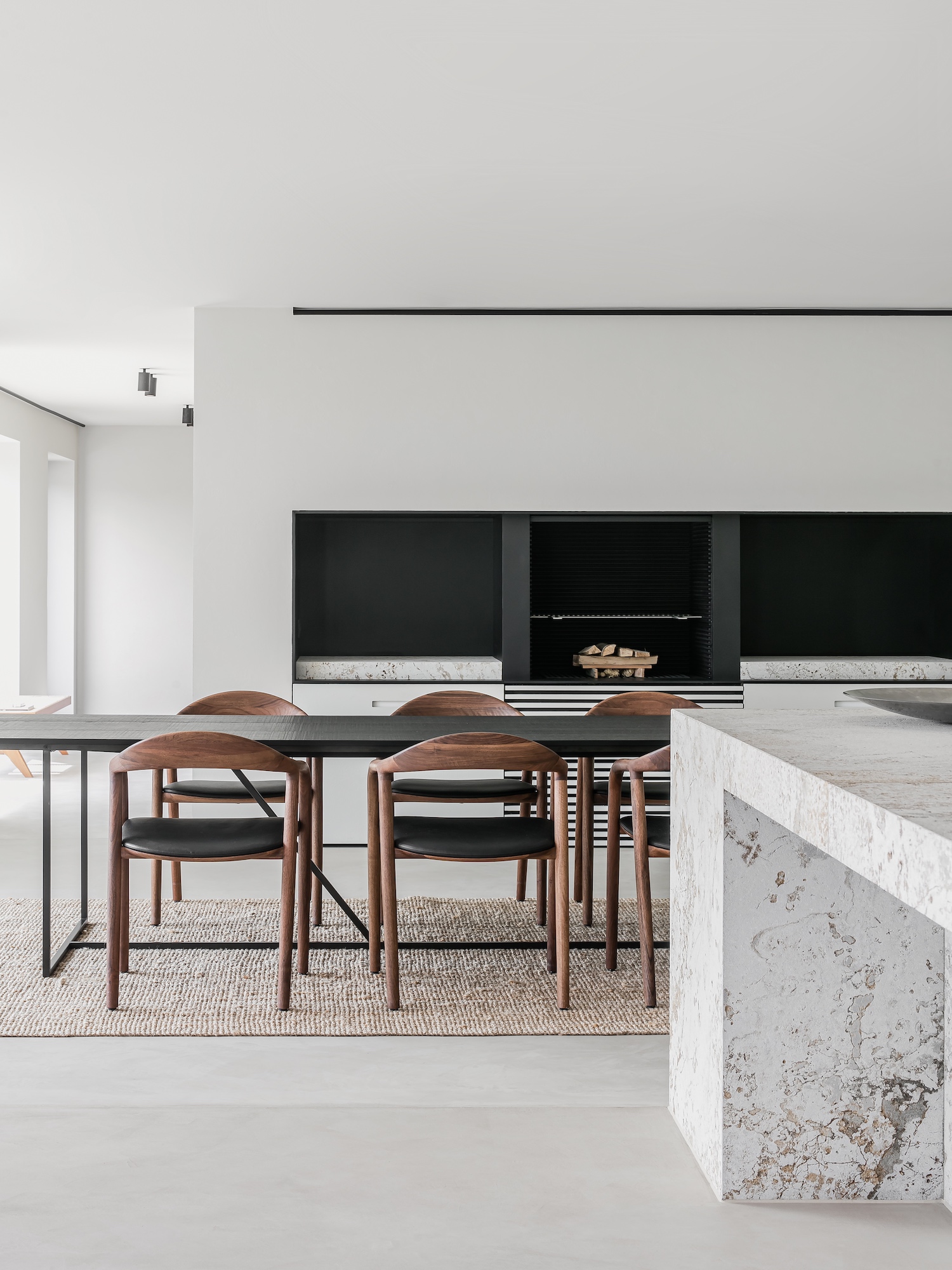 Salon, jadalnia i kuchnia na otwartym planie w głównym budynku tworzą przytulną przestrzeń, w której można spędzać czas przy kominku, w otoczeniu ikonicznych elementów designu. Wnętrza są naszpikowane unikalnymi meblami i akcesoriami, które łączą tradycję z nowoczesnym podejściem. Wśród wyróżniających się elementów znajdują się sofa Togo Michela Ducaroya dla Ligne Roset, fotel Easy Chair Pierre’a Jeannereta oraz fotel PK22 Poula Kjærholma dla Fritza Hansena, a także lampa Austere Floor autorstwa Hansa Verstuyfta dla Trizo21. Całość projektu jest hołdem dla minimalizmu, ale także dla flamandzkiej tradycji budowania domów, tworząc unikalne miejsce, które jednocześnie jest funkcjonalne, ciepłe i pełne charakteru.
