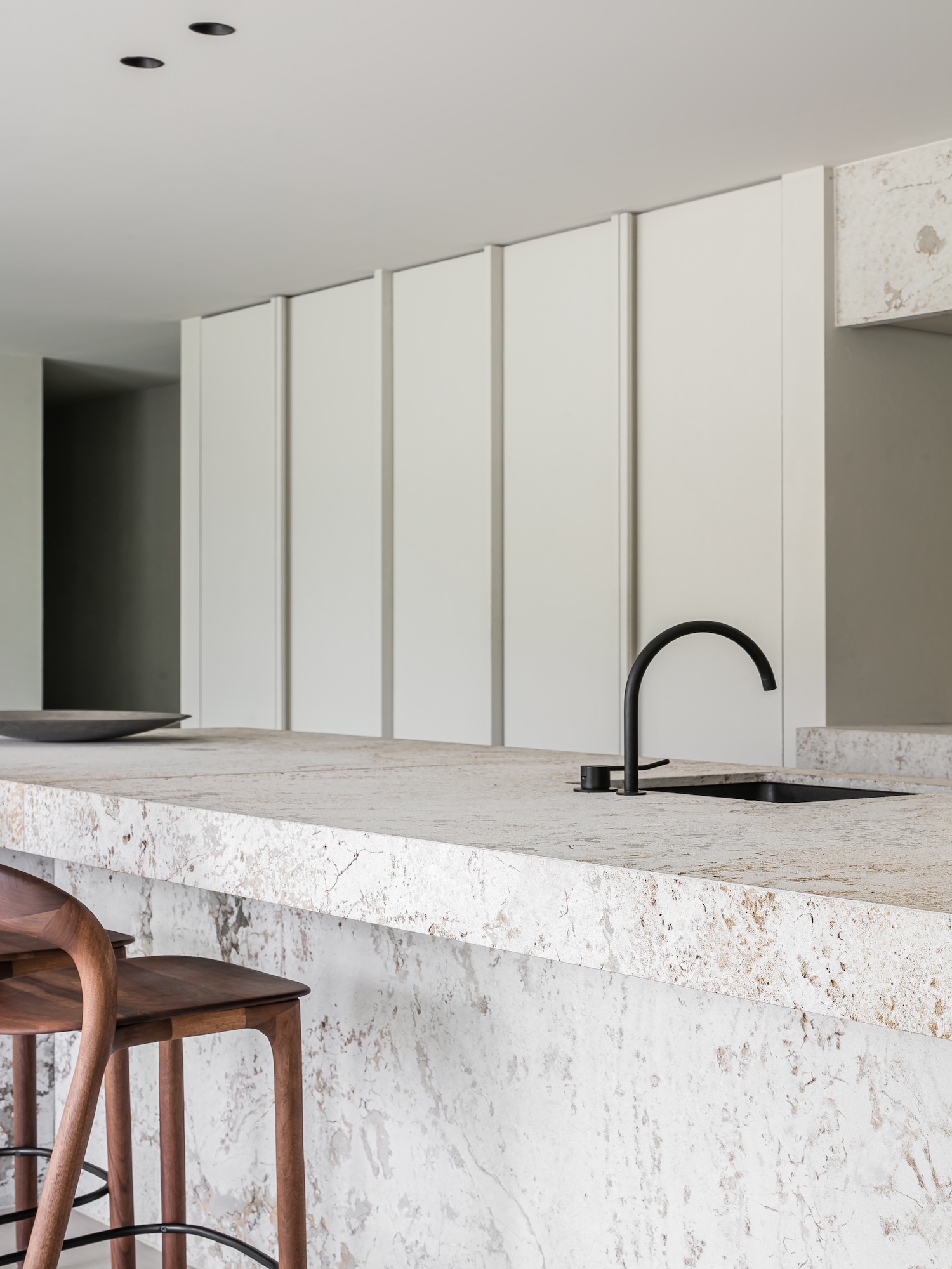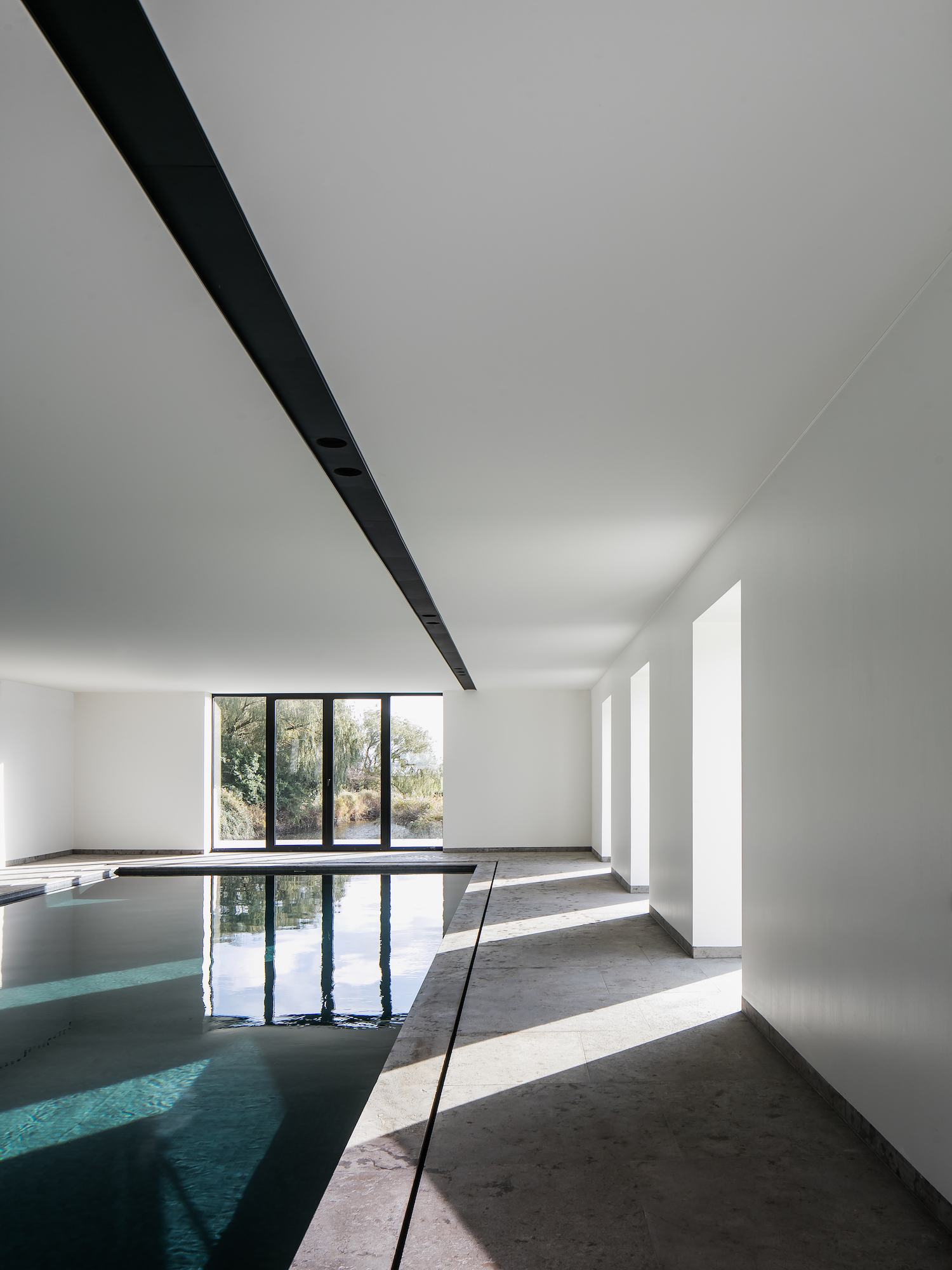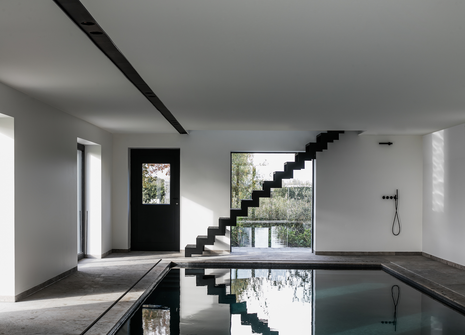 W tworzeniu prawdziwego miejsca ucieczki, Pieter przekształcił czwarty budynek w przestronną strefę fitness z krytym basenem, a piąty budynek stał się wydzieloną przestrzenią na imprezy. Wnętrza wszystkich pięciu budynków oddają najlepsze tradycje belgijskiego designu wnętrz, w którym zastosowanie naturalnych materiałów stanowi kluczowy element. Właściciele poszukiwali przestrzeni „łatwej do zamieszkania”, wyróżniającej się ciepłem i wyczuciem dotykowym, uzyskanym dzięki starannemu doborowi naturalnych materiałów. Kamień naturalny Agripa Fine Muzillac Veine w kuchni, trawertyn oraz marokańskie tynki wapienne Tadelakt w głównym domu – wszystkie pochodzą od belgijskiego dostawcy kamienia Hullebusch. Podłogi w głównym budynku zostały wyłożone marokańskim tynkiem Tadelakt, uzupełnionym o dywaniki sizalowe i stolarkę z drewna orzechowego, charakterystyczną dla stylu Pietera.