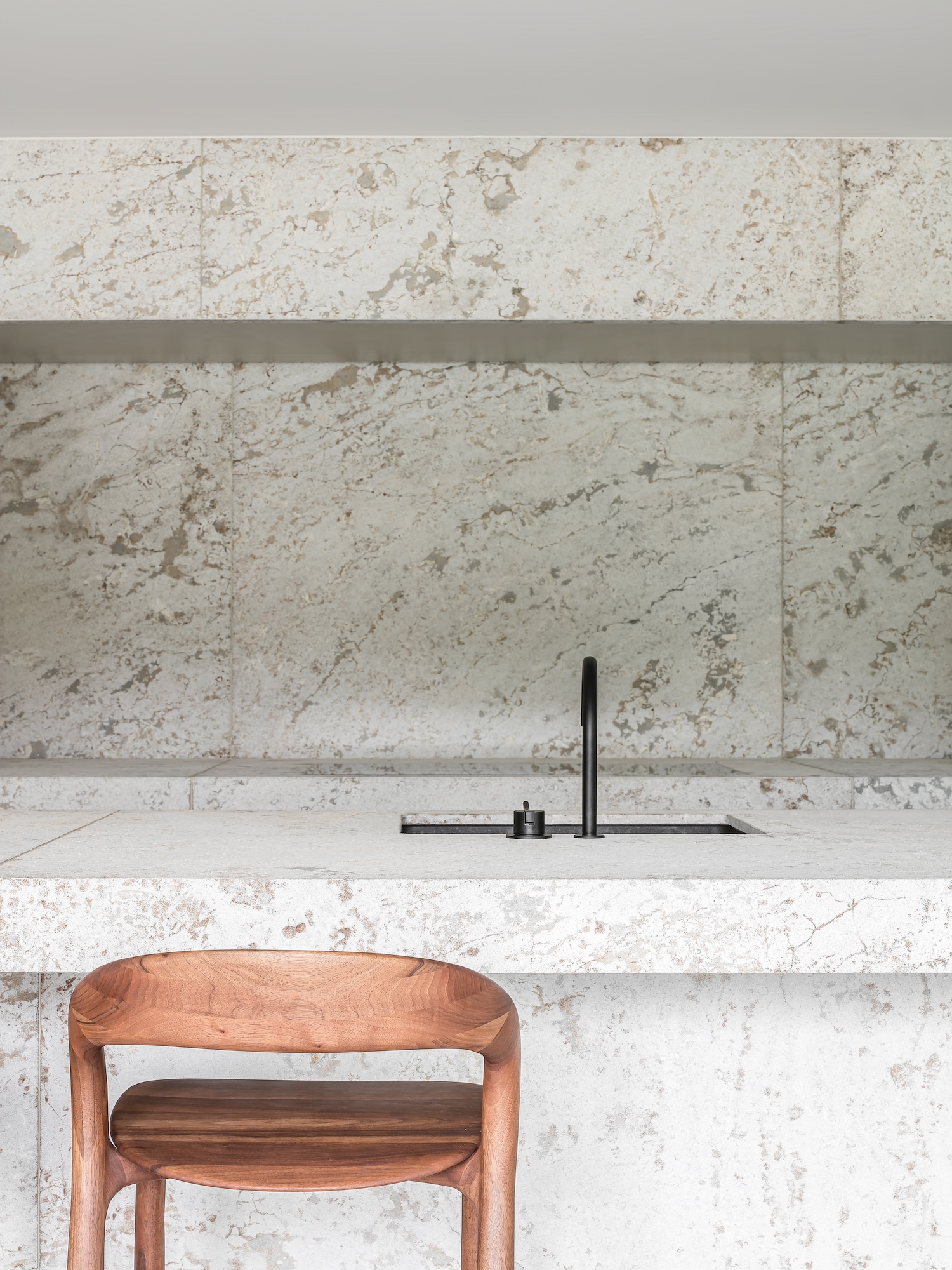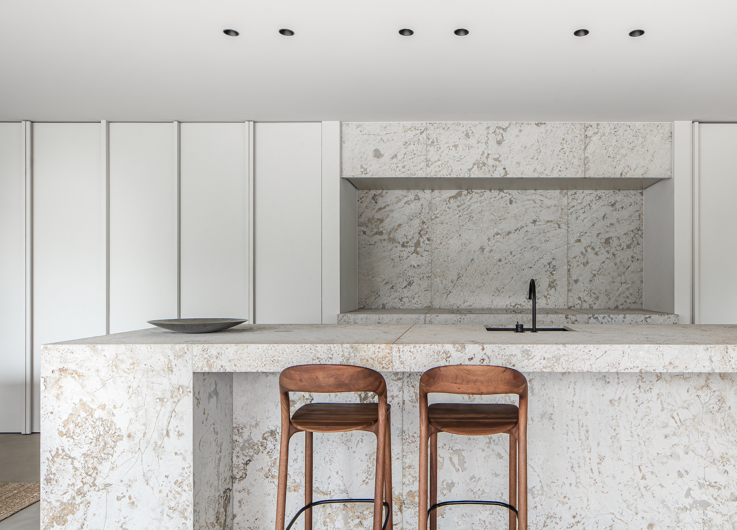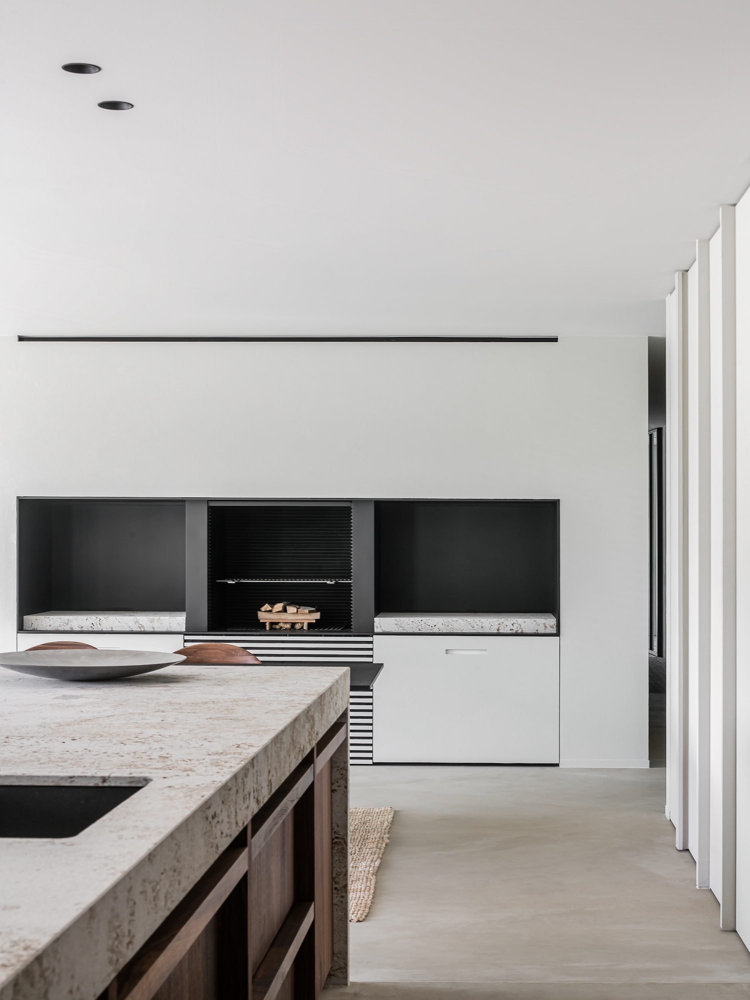 W tworzeniu prawdziwego miejsca ucieczki, Pieter przekształcił czwarty budynek w przestronną strefę fitness z krytym basenem, a piąty budynek stał się wydzieloną przestrzenią na imprezy. Wnętrza wszystkich pięciu budynków oddają najlepsze tradycje belgijskiego designu wnętrz, w którym zastosowanie naturalnych materiałów stanowi kluczowy element. Właściciele poszukiwali przestrzeni „łatwej do zamieszkania”, wyróżniającej się ciepłem i wyczuciem dotykowym, uzyskanym dzięki starannemu doborowi naturalnych materiałów. Kamień naturalny Agripa Fine Muzillac Veine w kuchni, trawertyn oraz marokańskie tynki wapienne Tadelakt w głównym domu – wszystkie pochodzą od belgijskiego dostawcy kamienia Hullebusch. Podłogi w głównym budynku zostały wyłożone marokańskim tynkiem Tadelakt, uzupełnionym o dywaniki sizalowe i stolarkę z drewna orzechowego, charakterystyczną dla stylu Pietera.