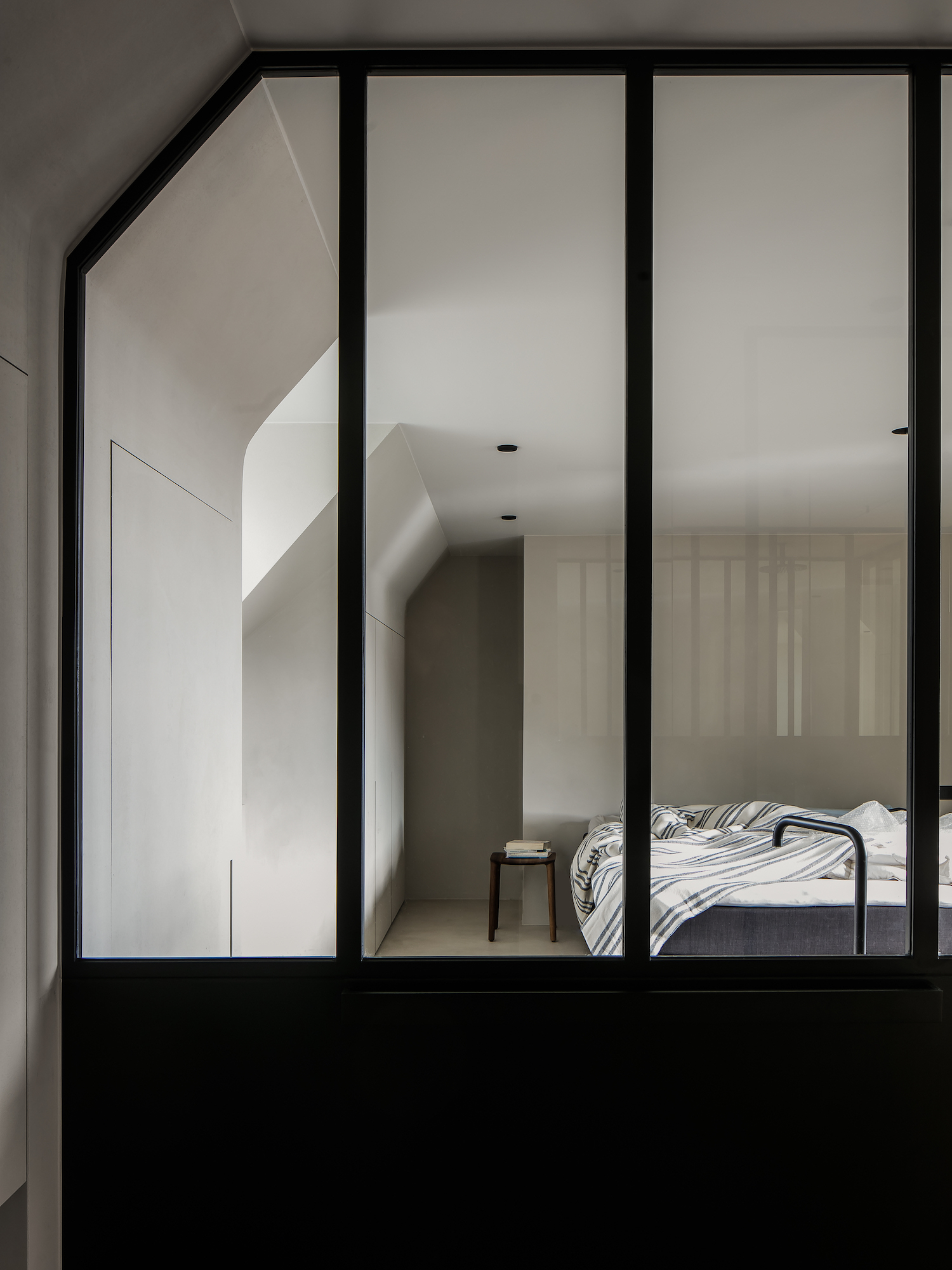 Do przestrzeni imprezowej Vanrenterghem wybrał podłogę w jodełkę z ciemnego dębu, która doskonale kontrastuje z odrestaurowanymi odsłoniętymi drewnianymi belkami stropowymi. „Wnętrza są bardzo czyste, minimalistyczne i charakteryzują się określonymi aranżacjami” – mówi Pieter. „Naturalne materiały łagodzą te linie, sprawiając, że przestrzenie wydają się bardziej ludzkie”.
