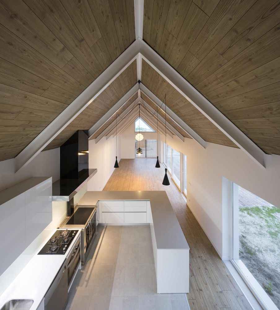 Jedną z kluczowych cech domu jest pełne wykorzystanie sufitów pod pochyłym dachem oraz duże przeszklenia, które wpuszczają naturalne światło do wnętrza. Otwarte przestrzenie i panoramiczne widoki sprawiają, że dom harmonijnie łączy tradycję lokalnej architektury z nowoczesnymi elementami. Dzięki temu projekt stał się przykładem minimalistycznej, funkcjonalnej i estetycznej zabudowy, idealnie wpisującej się w nadmorską scenerię Praia da Vagueira.