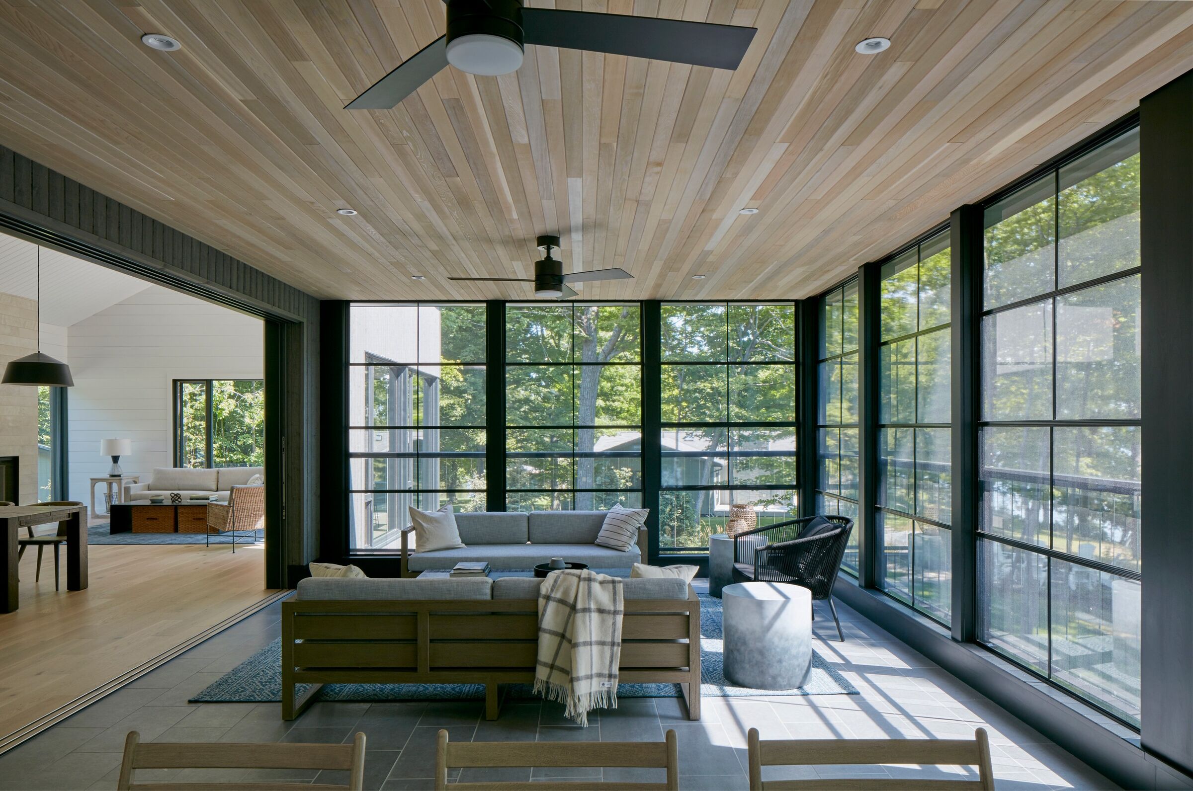Kamienny taras, ulokowany niżej względem salonu i jadalni, nie zakłóca widoku i wzmacnia relację z jeziorem. Kluczowym elementem projektu była duża weranda, która poprzez wielkopowierzchniowe przesuwne drzwi płynnie łączy się z wnętrzem, tworząc przestrzeń do życia na świeżym powietrzu. Ponad czterometrowy otwór otwiera salon na ganek – „pokój wśród drzew”, unoszący się nad tarasem dzięki lekkim, okrągłym kolumnom.