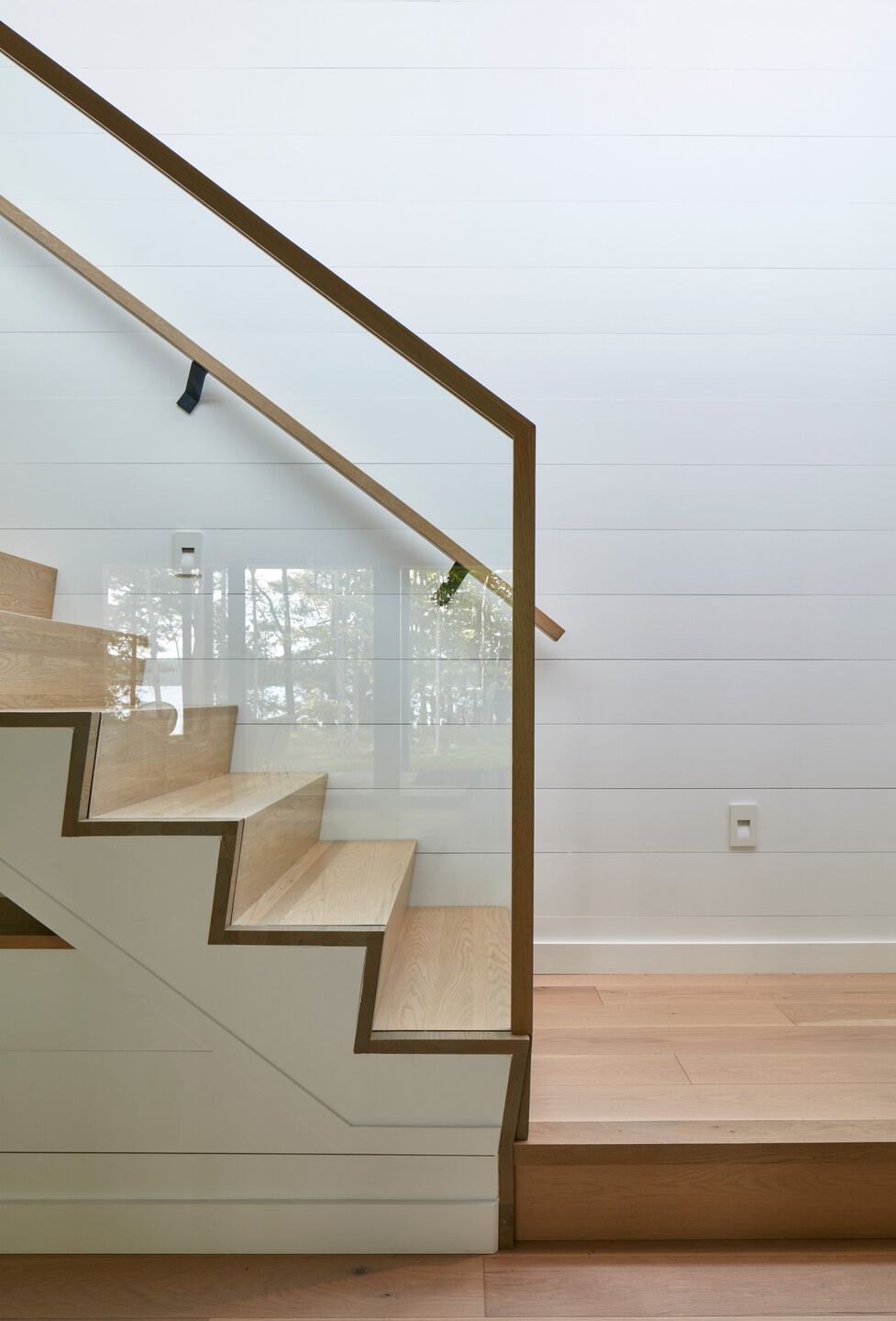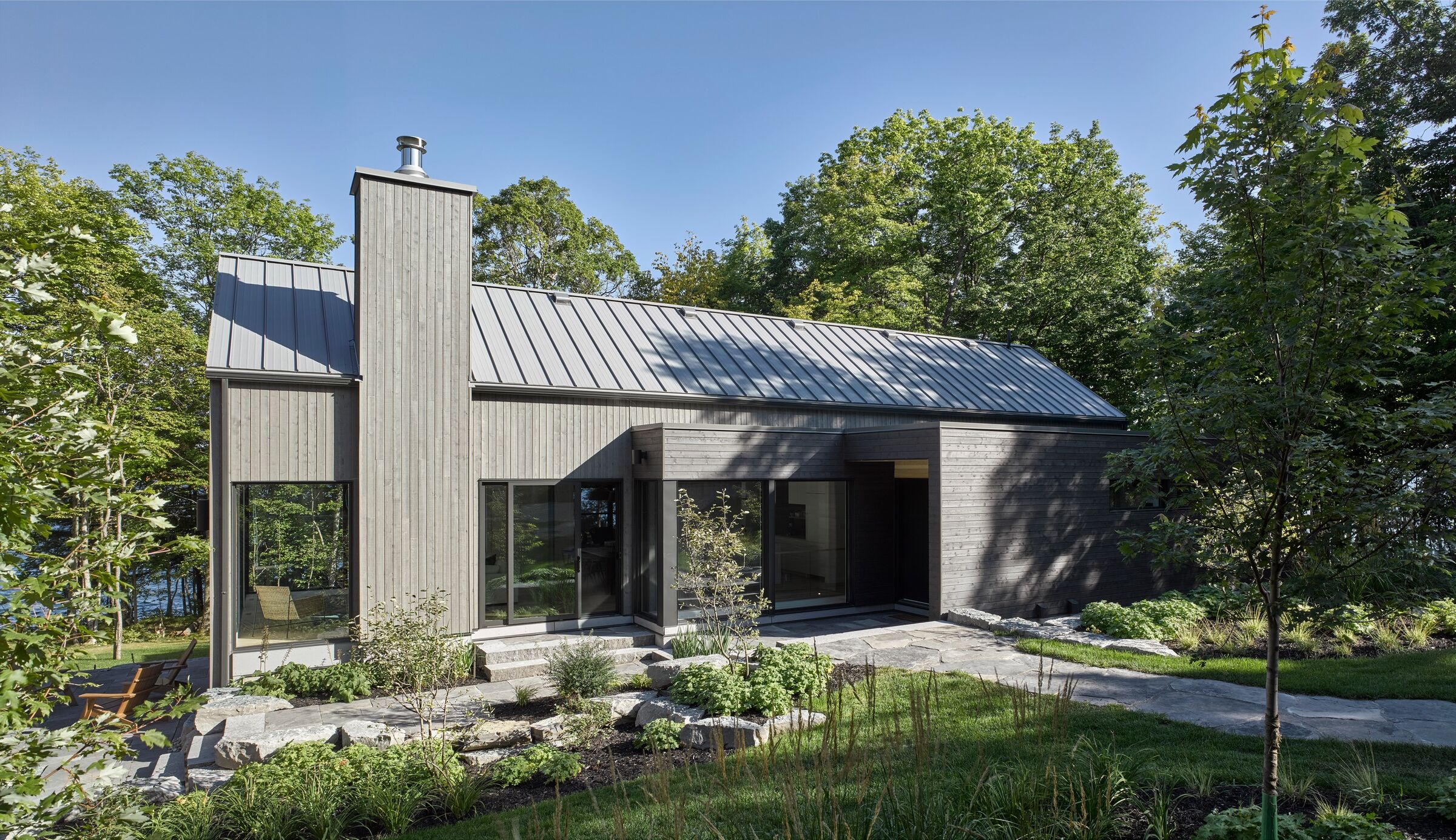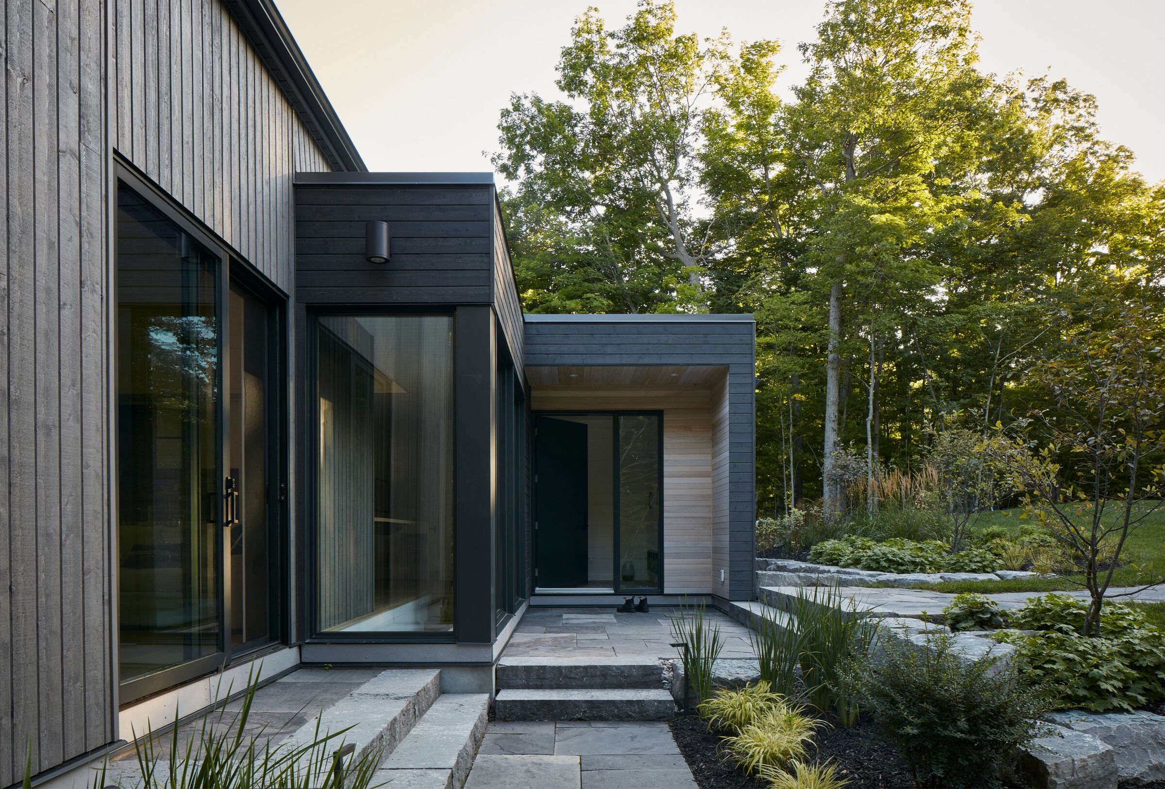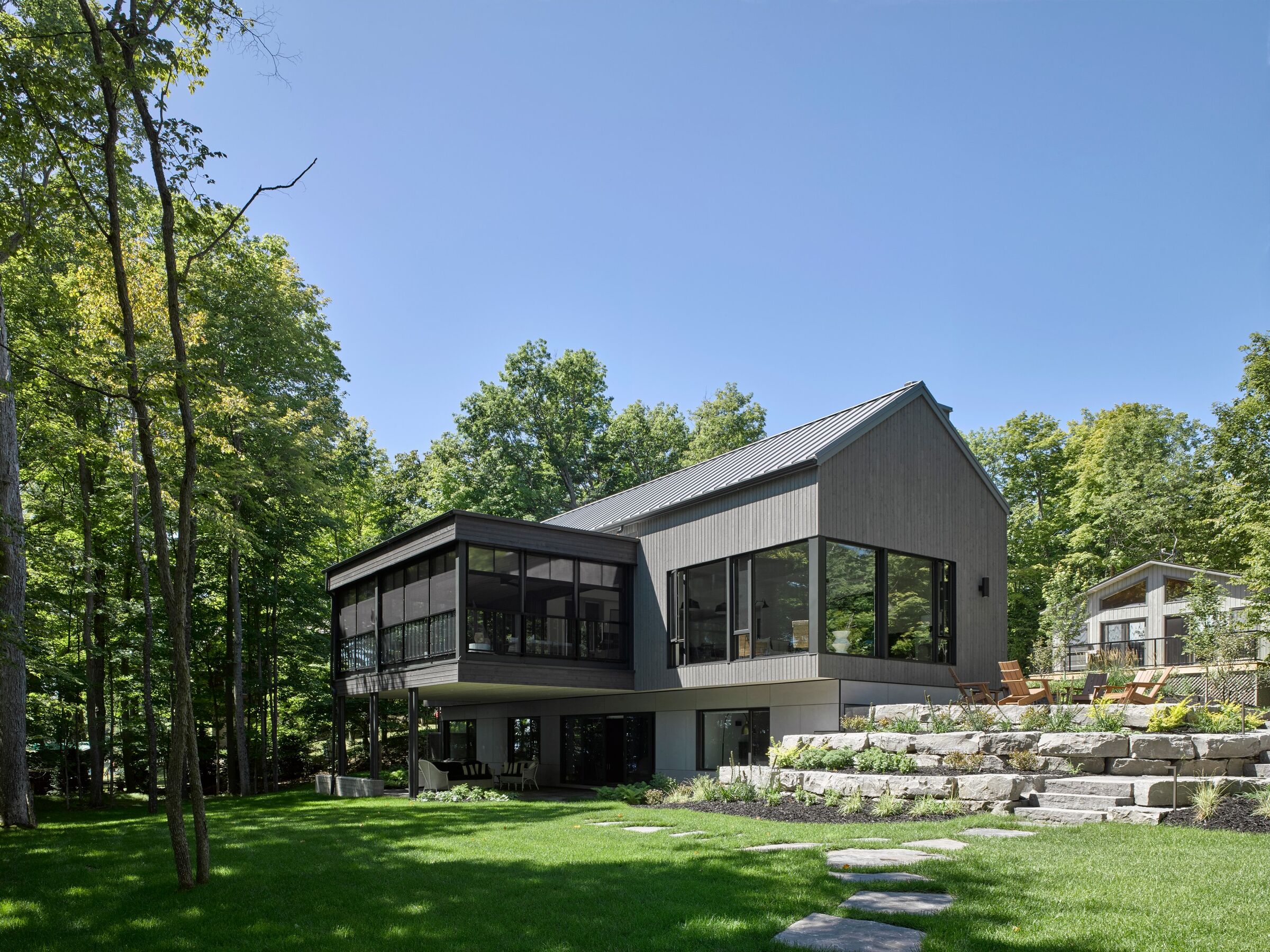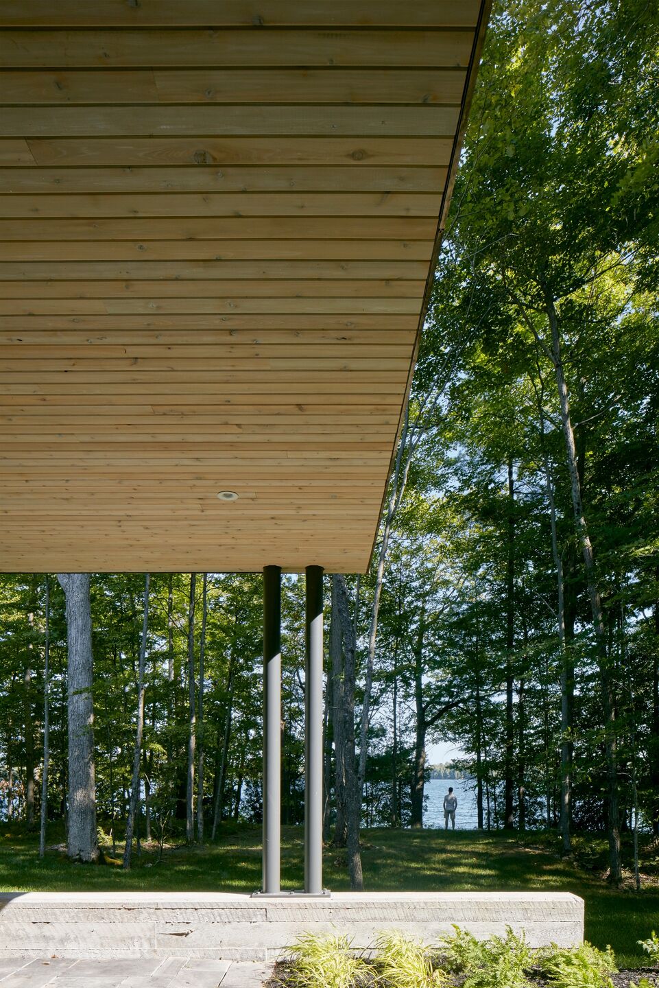 Zlokalizowany na zboczu wzgórza, dom został zaprojektowany jako niska, parterowa konstrukcja, której linia harmonijnie wtapia się w teren. Gości wita podest prowadzący obok przeszklonej ściany, która oferuje widok na jezioro Big Rideau i wnętrze domu. Dyskretne wejście, ukryte pod płaskim dachem, prowadzi do przestrzeni dziennej otwartej na naturę.