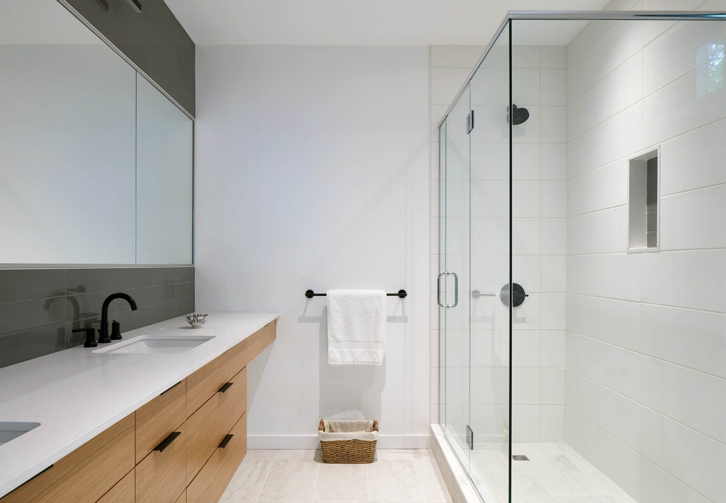 Wnętrze zaprojektowano w duchu minimalizmu i naturalnego światła – białe ściany i sufity, neutralna podłoga z białego dębu, a także czarne akcenty, które nadają całości nowoczesnego charakteru. Elewacja z sidingu w kolorze węgla drzewnego współgra z dachem z cynkowanego metalu, tworząc spójną paletę materiałową z wyrazistym kontrastem.