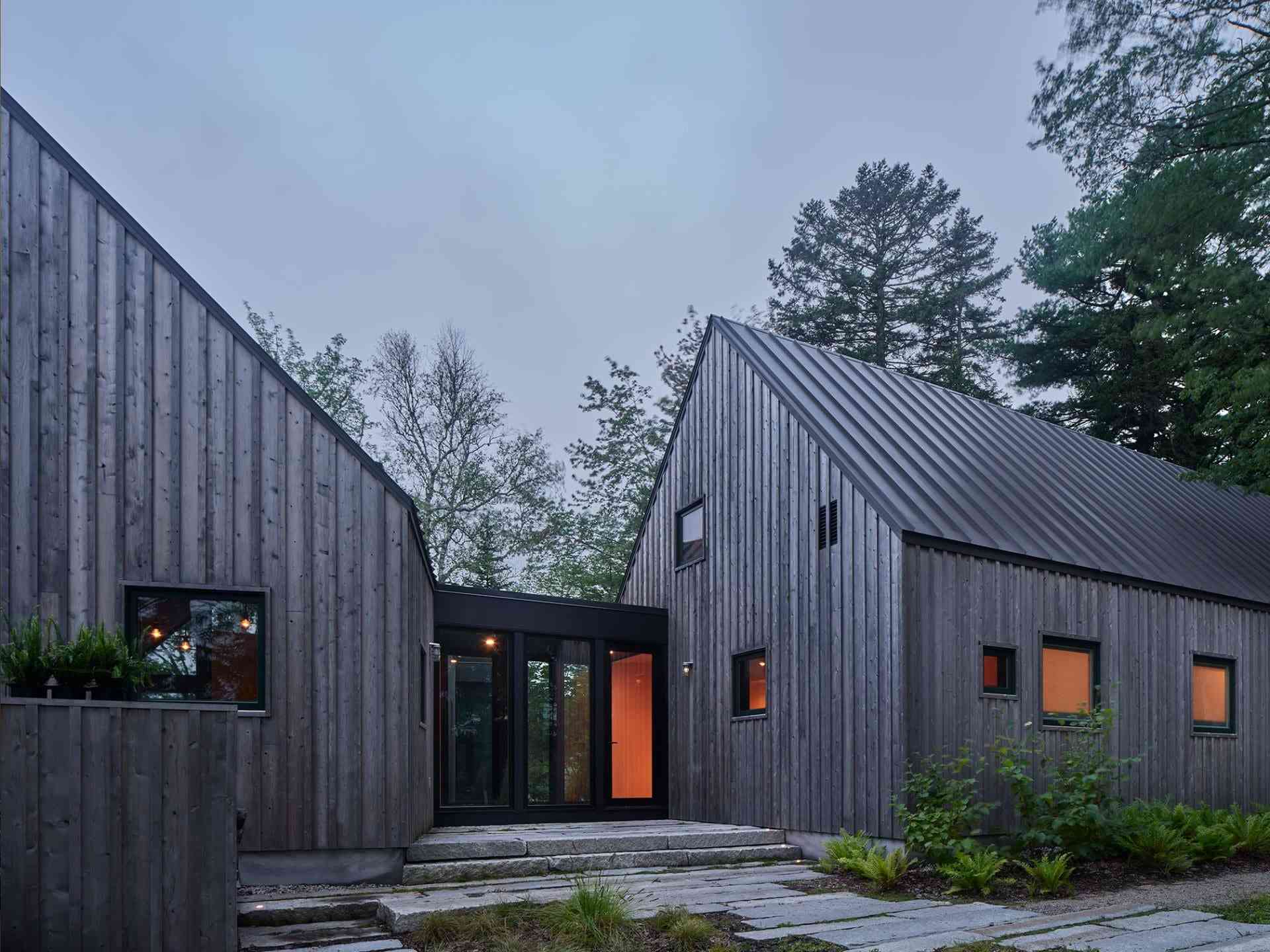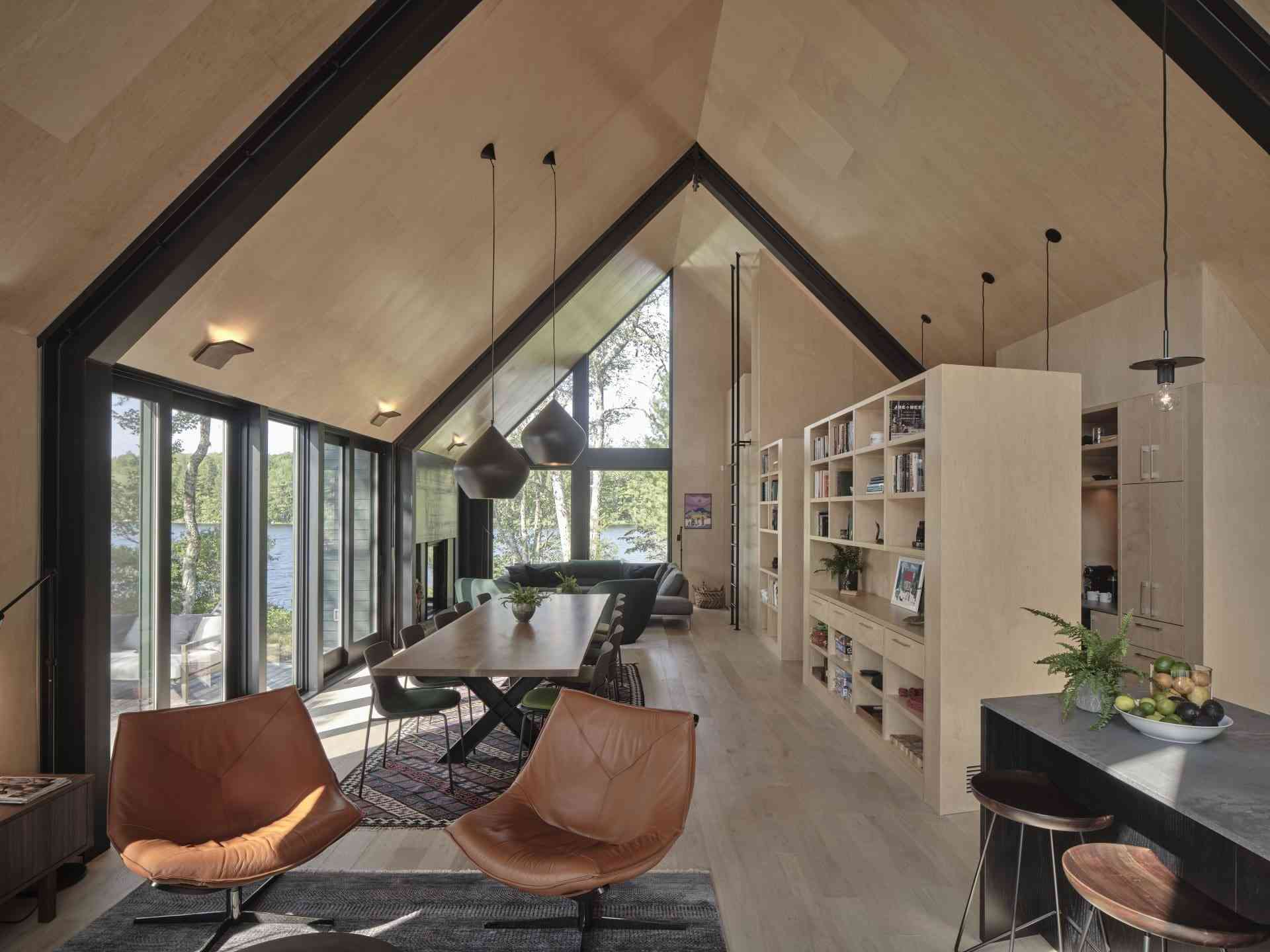 Projekt Birch Point to wyjątkowa realizacja autorstwa studia The Acre, której głównym założeniem było stworzenie przestrzeni przywołującej wspomnienia rodzinnych wakacji nad jeziorem. Architekci postawili na koncepcję nowoczesnej stodoły, łącząc prostotę formy z przytulnym klimatem i szacunkiem dla otaczającej przyrody. Dom składa się z dwóch brył ustawionych pod kątem i połączonych przeszklonym łącznikiem. Zewnętrzny taras zachęca do spędzania czasu na świeżym powietrzu i czerpania pełnymi garściami z uroków natury.