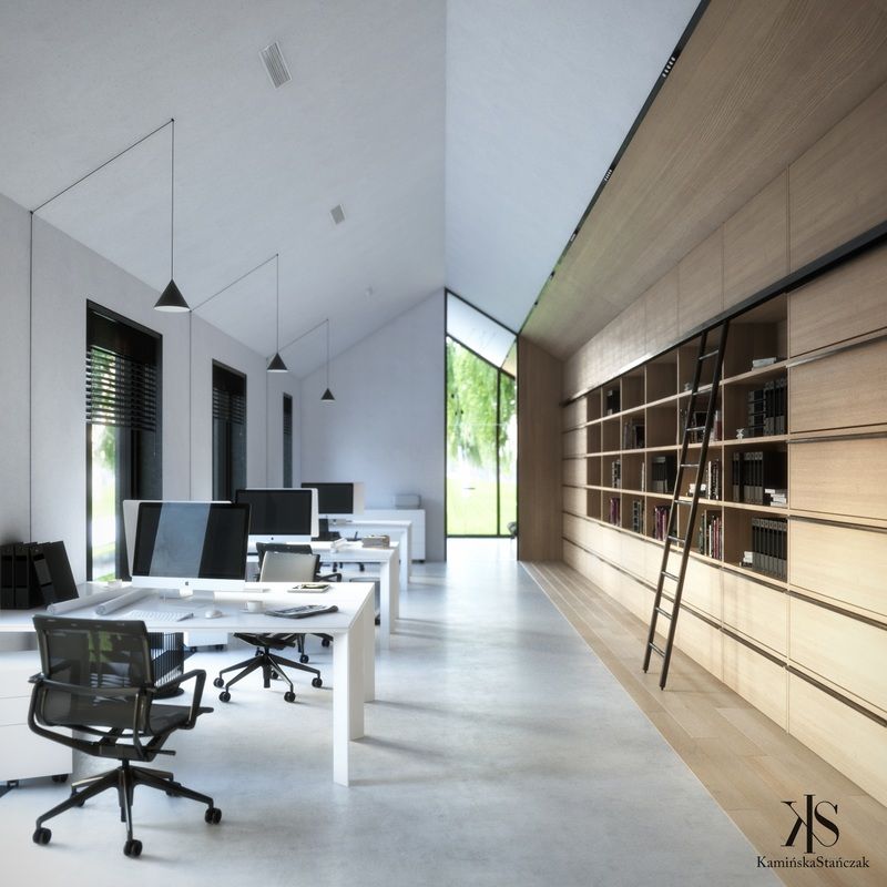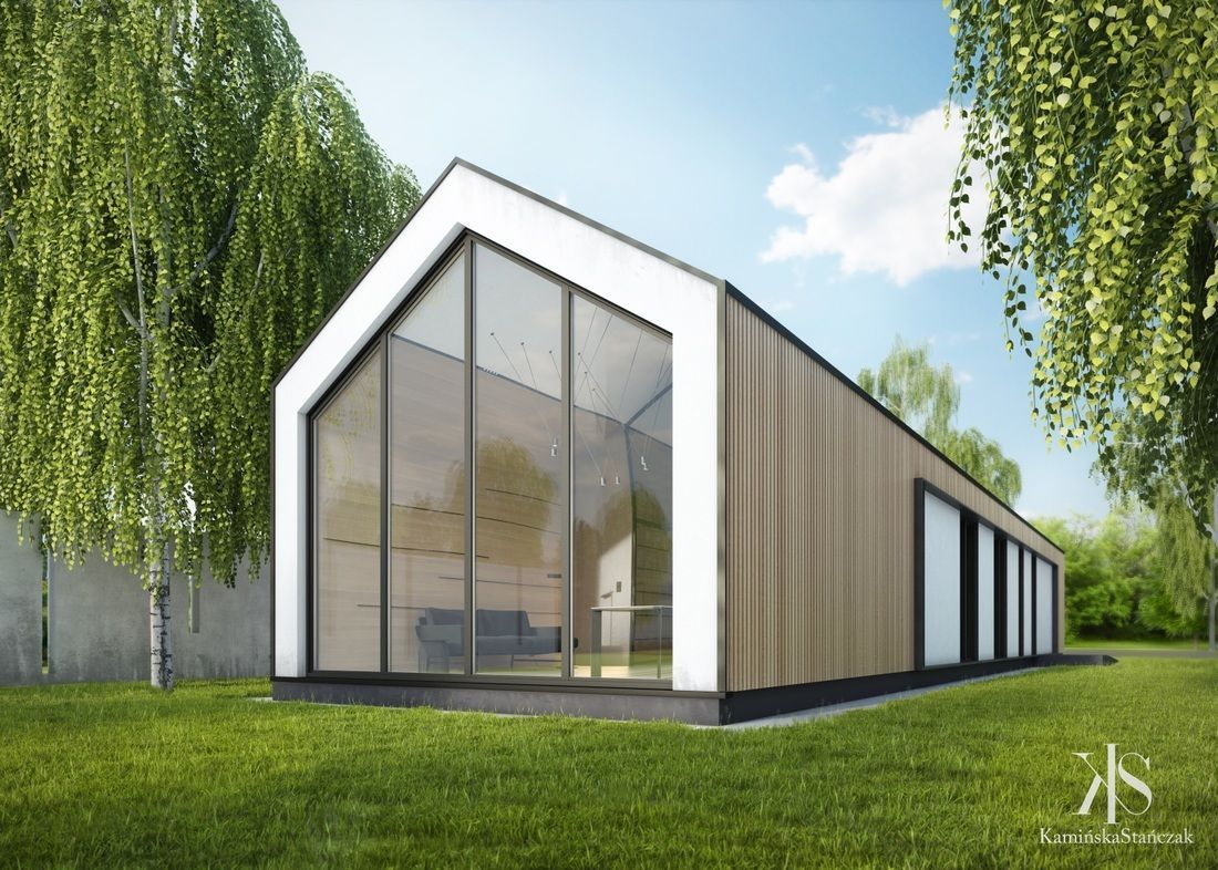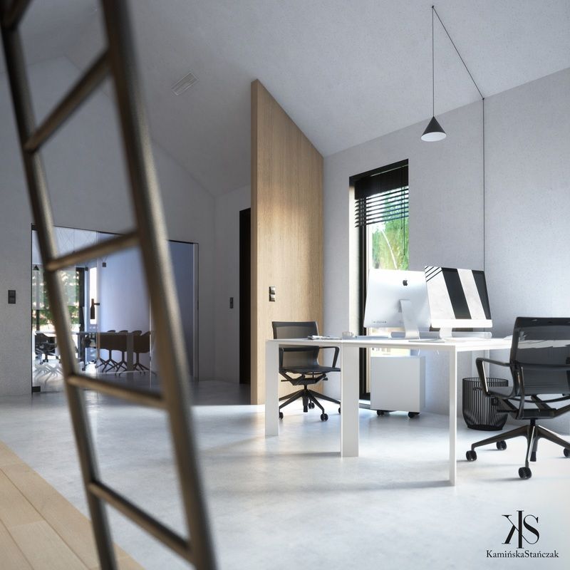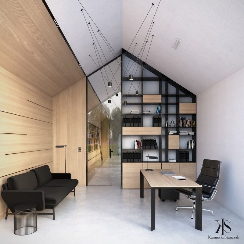 Projekt pracowni architektonicznej w Bibicach pod Krakowem został zaprojektowany w ścisłej odpowiedzi na warunki lokalne oraz nietypowy, wąski kształt działki. Rzut budynku wpisuje się w jej wydłużoną formę, co przełożyło się na prostą i czytelną bryłę z dwuspadowym dachem, nawiązującą do sąsiedniej zabudowy zagrodowej. Minimalistyczna architektura obiektu, inspirowana nurtem takim jak nowoczesna stodoła, została podkreślona przez duże przeszklenia, które otwierają wnętrza na otoczenie i zapewniają dostęp do naturalnego światła. Elewację wykończono materiałami kolorystycznie korespondującymi z rosnącymi na działce brzozami – bielą, czernią oraz naturalnym drewnem, nadając bryle nowoczesny, a jednocześnie spokojny charakter.
