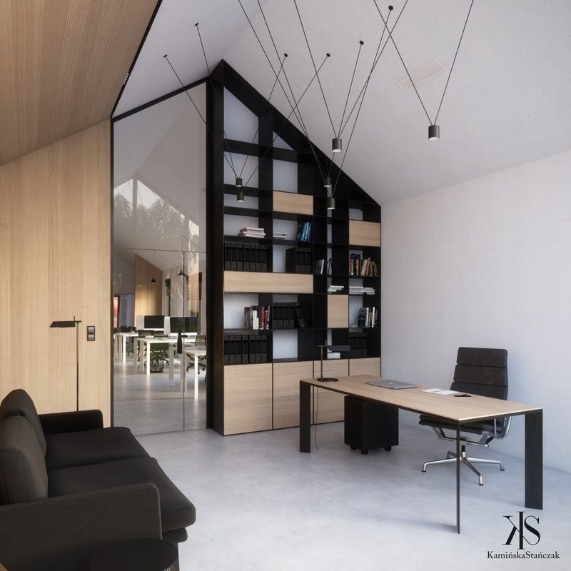 Wnętrze biura architektonicznego utrzymano w spójnej, minimalistycznej stylistyce, eliminującej zbędne elementy i sprzyjającej koncentracji oraz pracy twórczej. Powtórzenie materiałów z elewacji – drewna oraz czarno-białych akcentów – pozwoliło stworzyć harmonijną i funkcjonalną przestrzeń pracy. Dzięki dużym przeszkleniom do wnętrza wpada obfita ilość światła dziennego, a po zmroku klimat dopełniają starannie dobrane lampy sufitowe. Układ funkcjonalny biura oparto na jednej głównej przestrzeni typu open space z wydzielonym gabinetem szefa, uzupełnionej o strefę wejściową z salą konferencyjną, zapleczem sanitarnym oraz aneksem kuchennym w zabudowie.