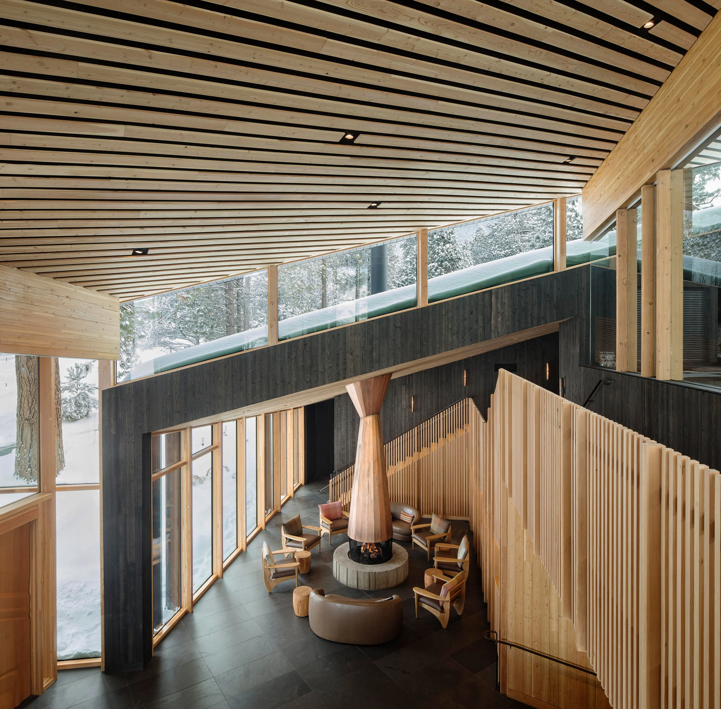 Dwukrotnie większy od pierwotnego lodge, nowy budynek mieści trzy główne strefy publiczne. Centralnym punktem jest kamienny kominek w barze i restauracji, której stoły wykonano z ponderozy pozyskanej z terenu. W południowo-wschodniej części znajdują się przestrzenie eventowe z tarasem, a na piętrze lounge z barem i widokiem na parter. Wnętrza, dzięki ciepłym tonacjom drewna i nowoczesnym rozwiązaniom, tworzą atmosferę otwartości i komfortu.