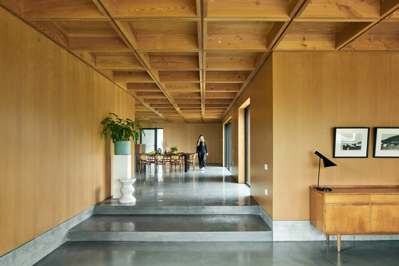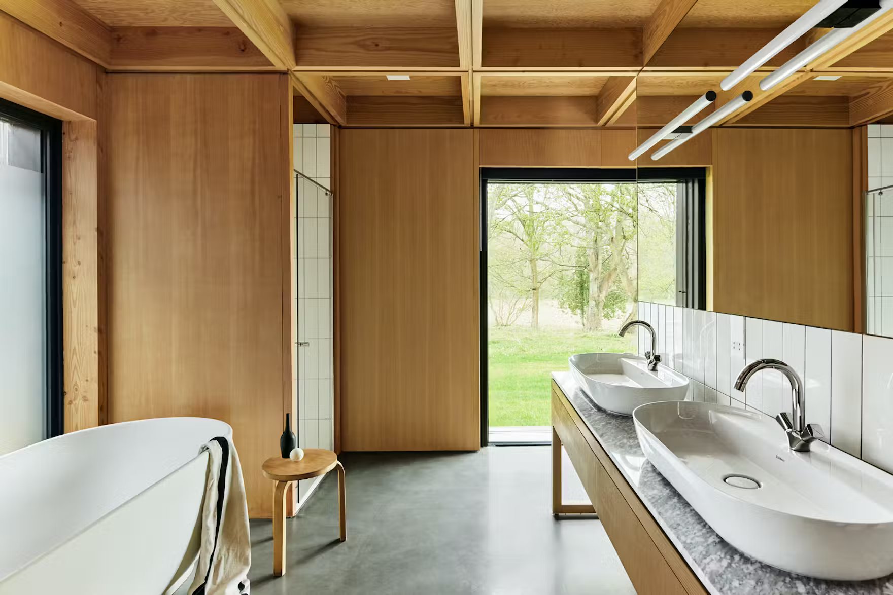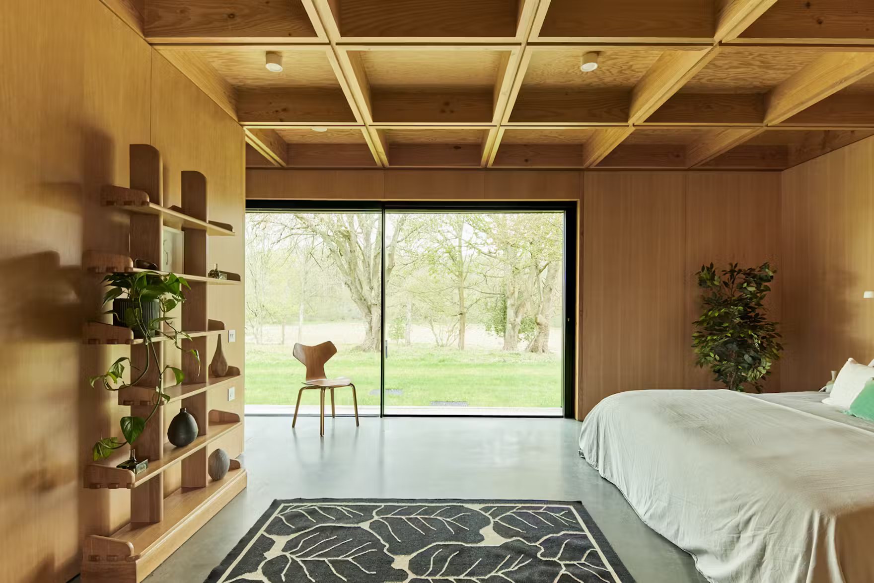 Nowo wybudowana część Black House Farm jest inspirowana konstrukcją stodoły, jednak z bardziej współczesnym podejściem do przestrzeni. Otwarte przestrzenie mieszkalne, z dużymi kasetonami z daglezji, umożliwiają uzyskanie dużych rozpiętości, co daje swobodę w aranżacji wnętrz. Dach w tej części budynku jest poziomy, w przeciwieństwie do klasycznego, stromo nachylonego dachu stodoły, co pozwala na lepsze połączenie funkcji mieszkalnych. Zewnętrzne deski zostały ułożone pionowo, a duże przesuwane okiennice umożliwiają całkowite zamknięcie przestrzeni, kiedy dom nie jest używany.
