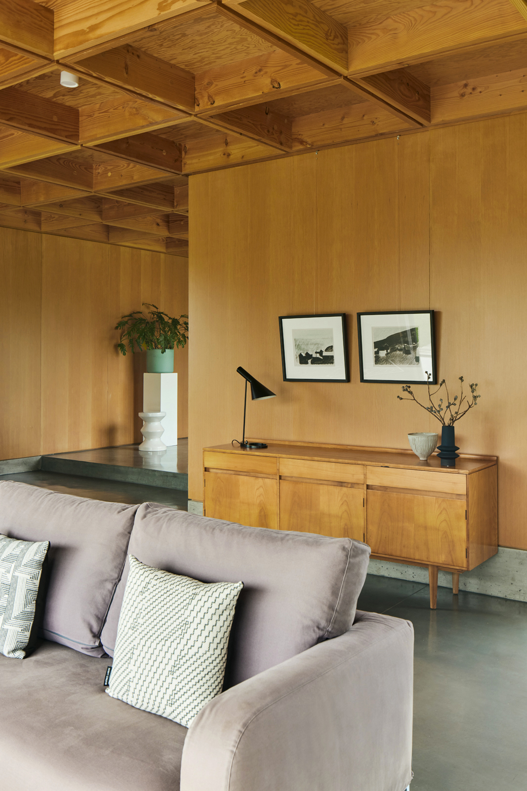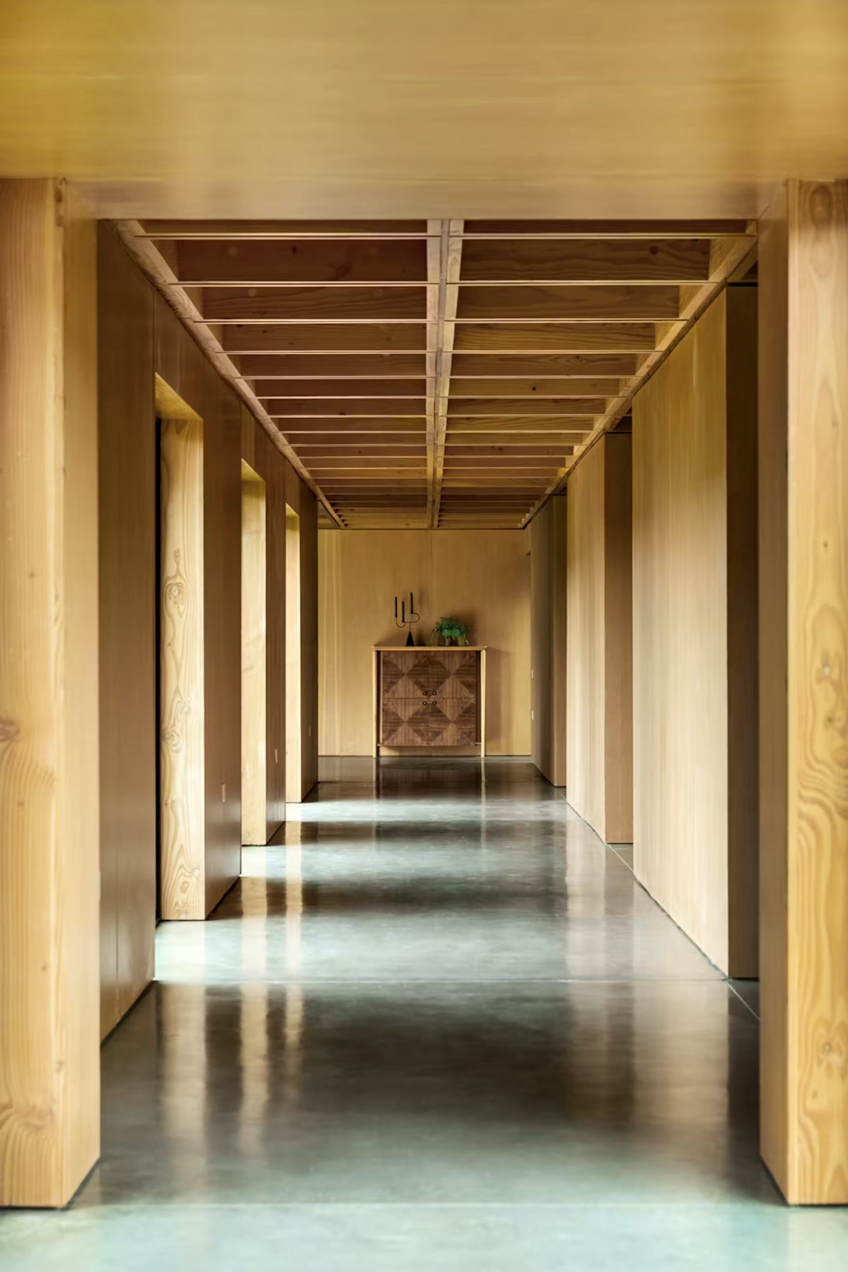 Całość budynku została zaprojektowana w taki sposób, aby zewnętrzne wykończenia, takie jak drewniane elementy stodoły oraz nowoczesne akcenty, były pokryte naturalną czarną bejcą. Taki zabieg pozwala zachować jednorodny wygląd całego kompleksu, który wyraźnie kontrastuje z historycznym domem wiejskim. Wnętrza są pokryte przezroczystą powłoką, co pozwala na uzyskanie subtelnych, naturalnych odcieni w przestrzeni. Drewno jest głównym bohaterem zarówno wewnątrz, jak i na zewnątrz, nadając całemu obiektowi spójny, organiczny charakter.