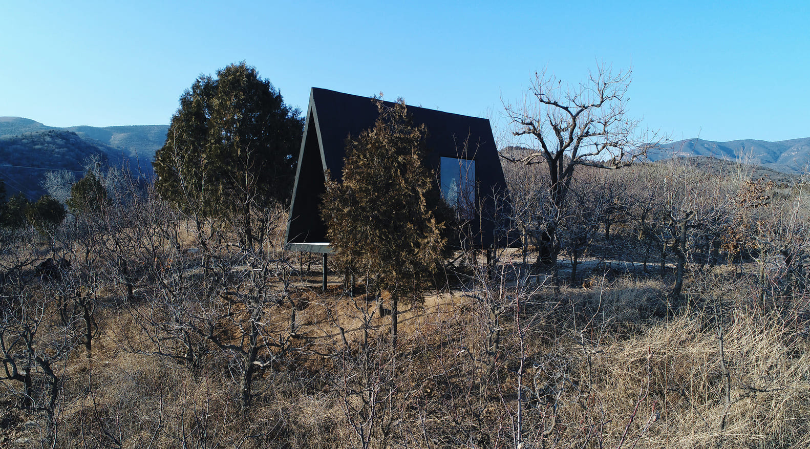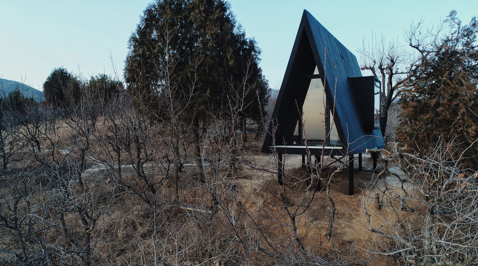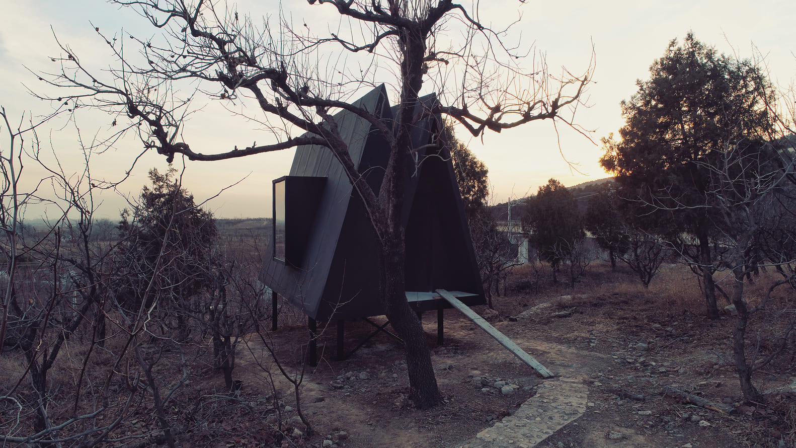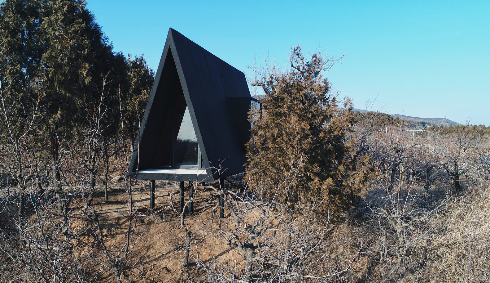 Ten kompaktowy dom o powierzchni 16 m² pełni funkcję tymczasowego schronienia dla pracowników opiekujących się sadem, a także miejsca noclegowego dla turystów. Głównym celem architektów było zminimalizowanie wpływu na środowisko oraz uproszczenie procesu budowy. Górna część konstrukcji to szaro-czarny trójkątny blok pokryty wodoodpornym linoleum, ustawiony na palach, co ogranicza ingerencję w teren. Kształt trapezu wzbogacono o dwa przenikające się trójkąty, tworząc ciekawą formę architektoniczną. Do wejścia prowadzi drewniana kładka biegnąca od stuletniego drzewa kaki.