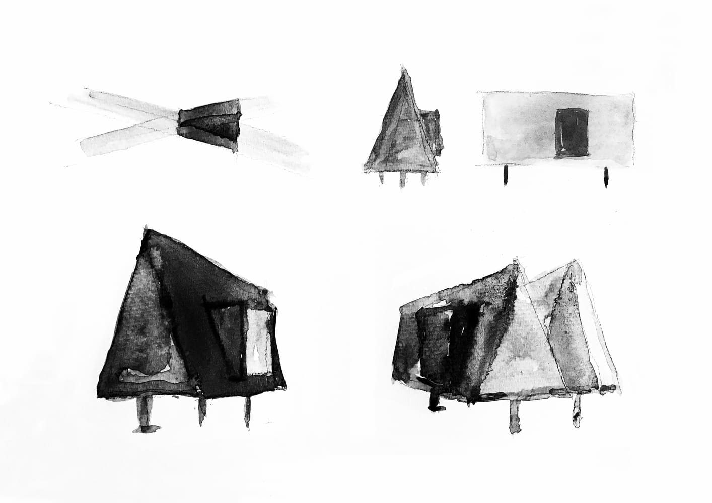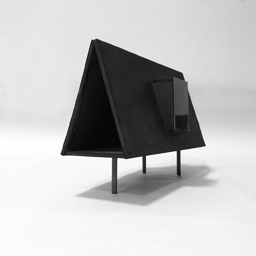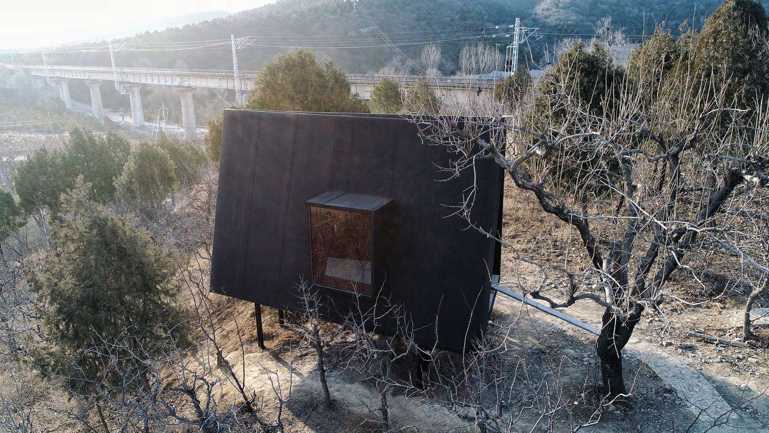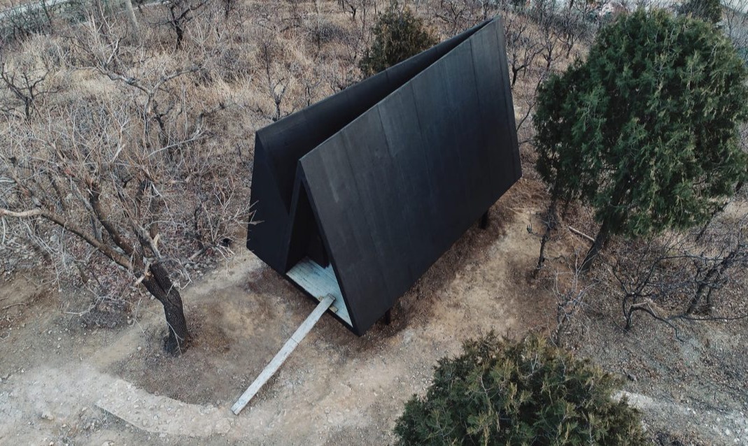 Ten kompaktowy dom o powierzchni 16 m² pełni funkcję tymczasowego schronienia dla pracowników opiekujących się sadem, a także miejsca noclegowego dla turystów. Głównym celem architektów było zminimalizowanie wpływu na środowisko oraz uproszczenie procesu budowy. Górna część konstrukcji to szaro-czarny trójkątny blok pokryty wodoodpornym linoleum, ustawiony na palach, co ogranicza ingerencję w teren. Kształt trapezu wzbogacono o dwa przenikające się trójkąty, tworząc ciekawą formę architektoniczną. Do wejścia prowadzi drewniana kładka biegnąca od stuletniego drzewa kaki.