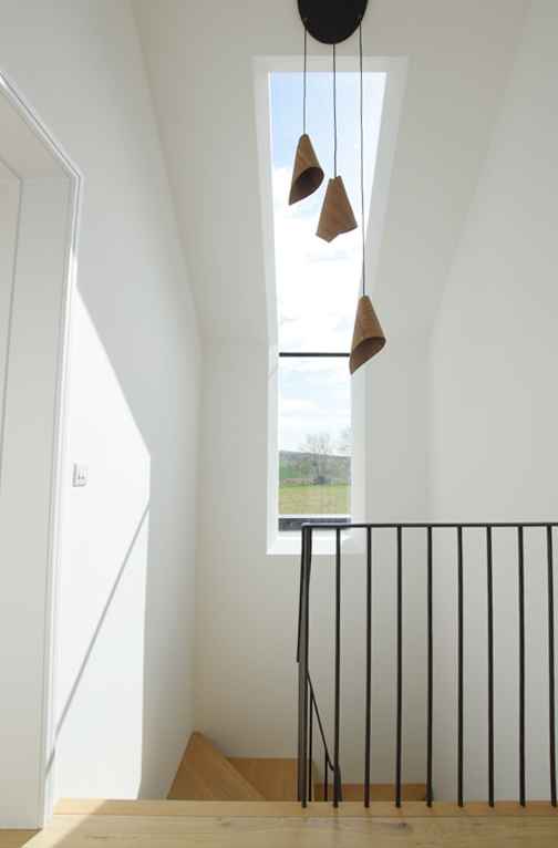 Wnętrza wykorzystują pełną wysokość dachu, tworząc miejscami imponująco wysokie przestrzenie wypełnione naturalnym światłem. Długie przeszklenie nad schodami wprowadza do wnętrza grę światła i cienia, podkreślając minimalistyczny charakter domu. W projekcie zastosowano naturalne materiały – palone modrzewiowe deski i naturalny łupek na całej powierzchni dachu – co nadaje bryle jednocześnie surowy i elegancki wygląd. Pomimo ciemnej elewacji, wnętrze zaskakuje jasnością, przestrzenią oraz spokojną, współczesną estetyką.
