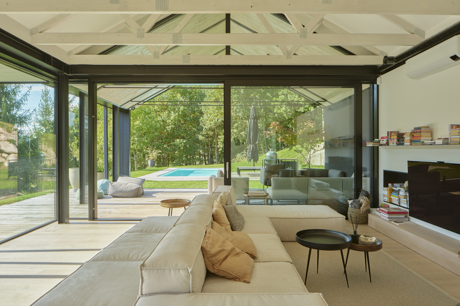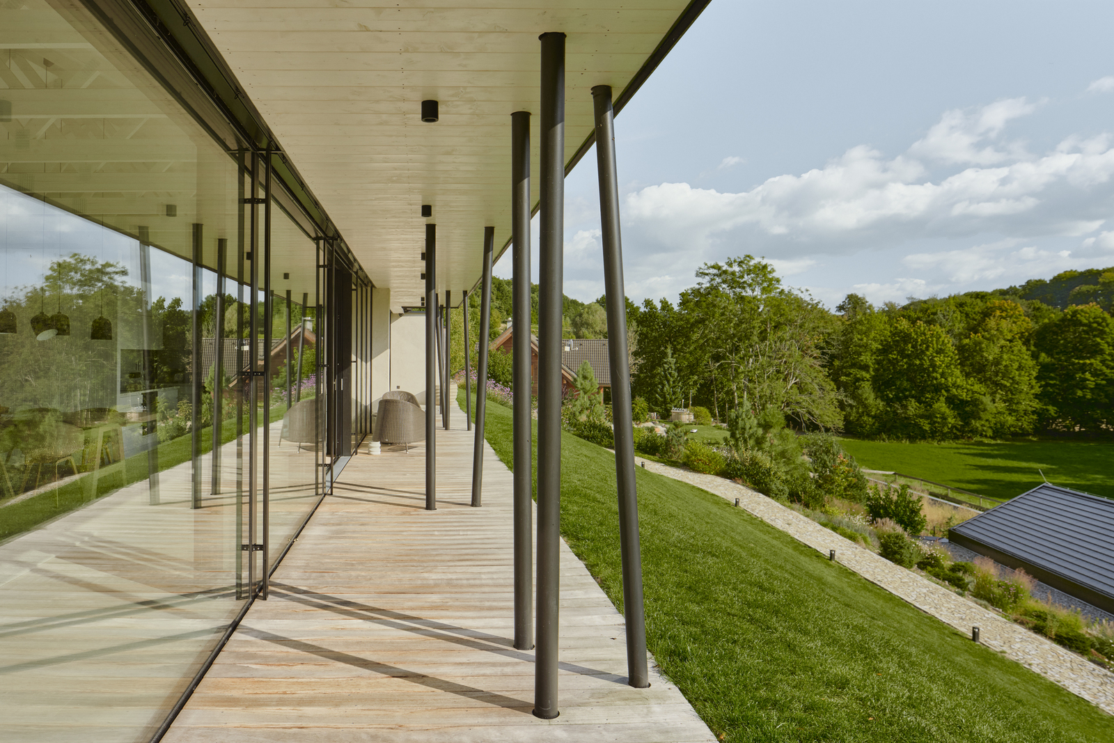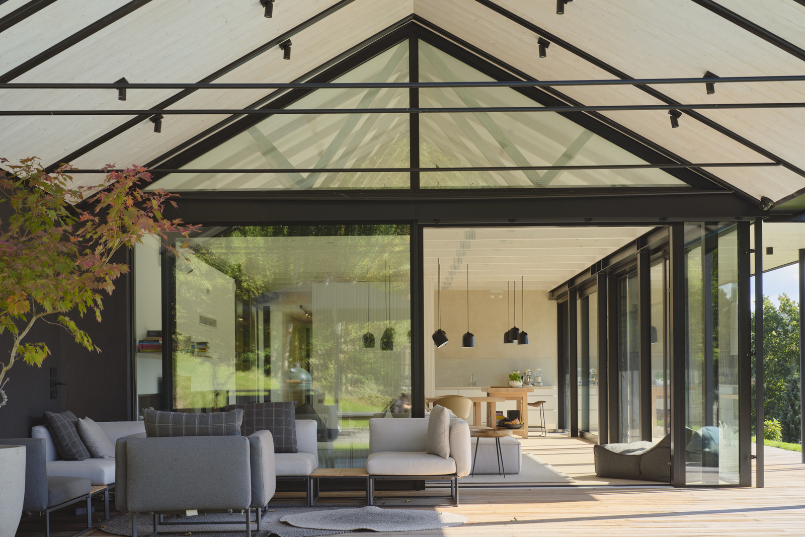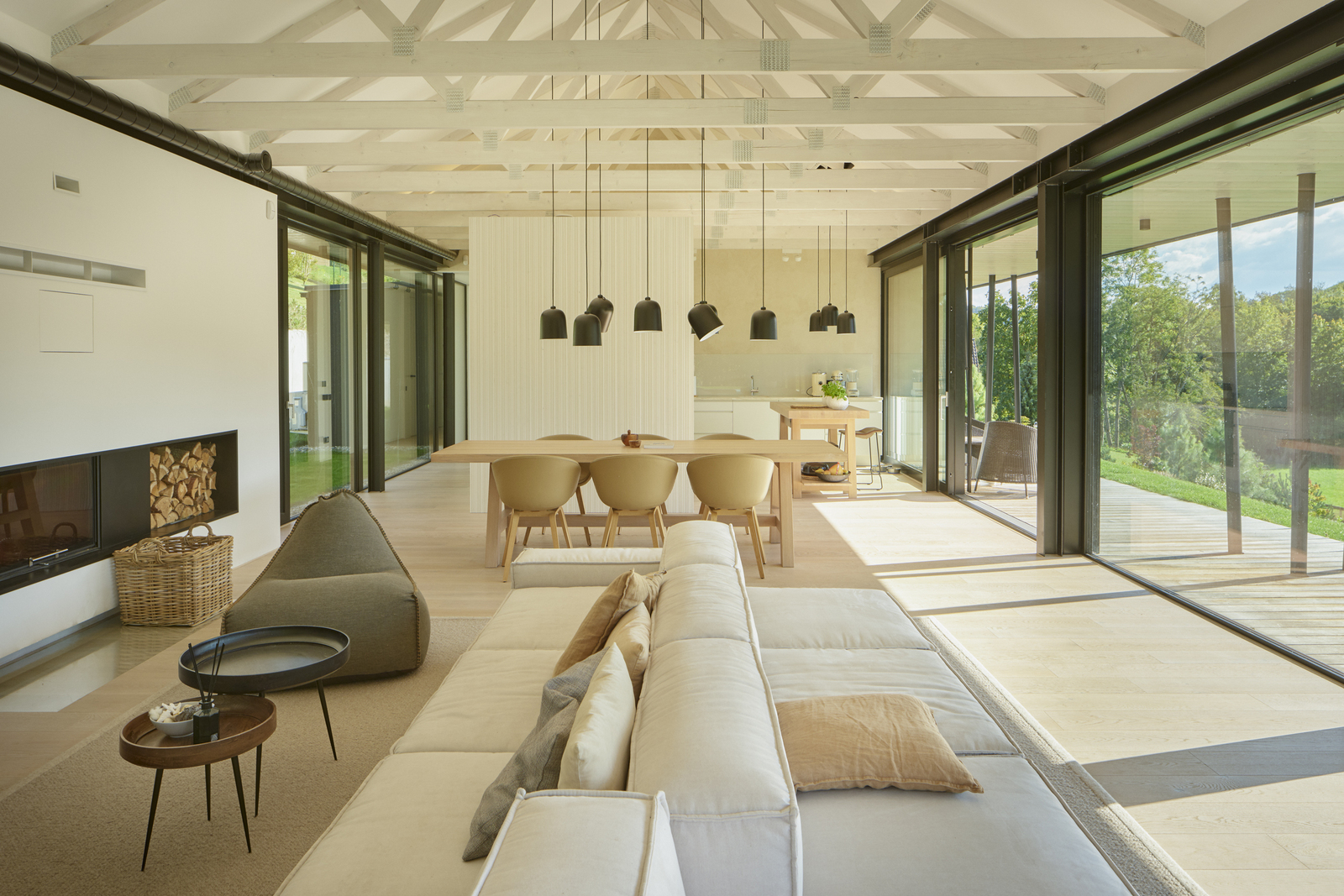 Najważniejszym elementem projektu jest otwarcie domu na widok. Jedna z elewacji została niemal w całości przeszklona, co pozwala na pełne połączenie wnętrza z ogrodem i krajobrazem. Dzięki temu dom „żyje” naturą – zmienia się wraz ze światłem, porami roku i rytmem dnia, a granica między wnętrzem a zewnętrzem zostaje niemal całkowicie zatarta.