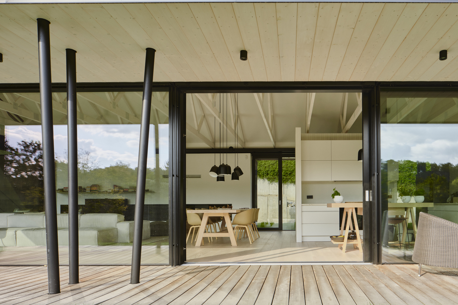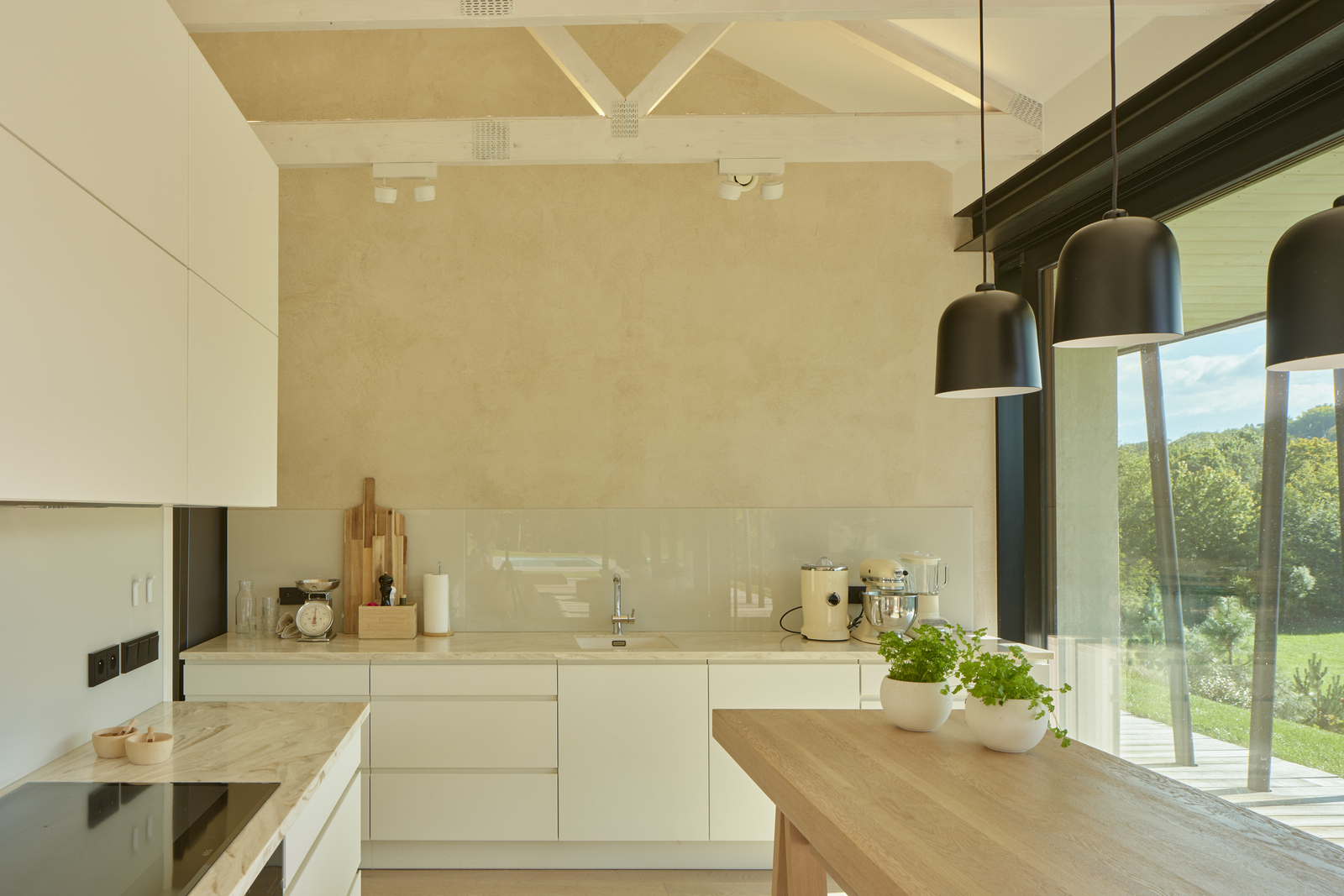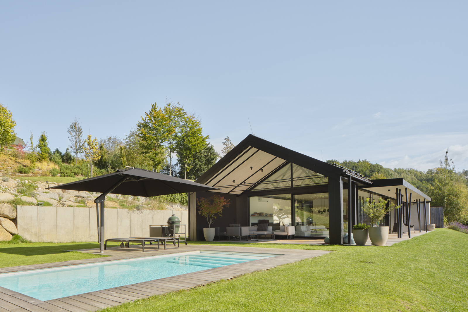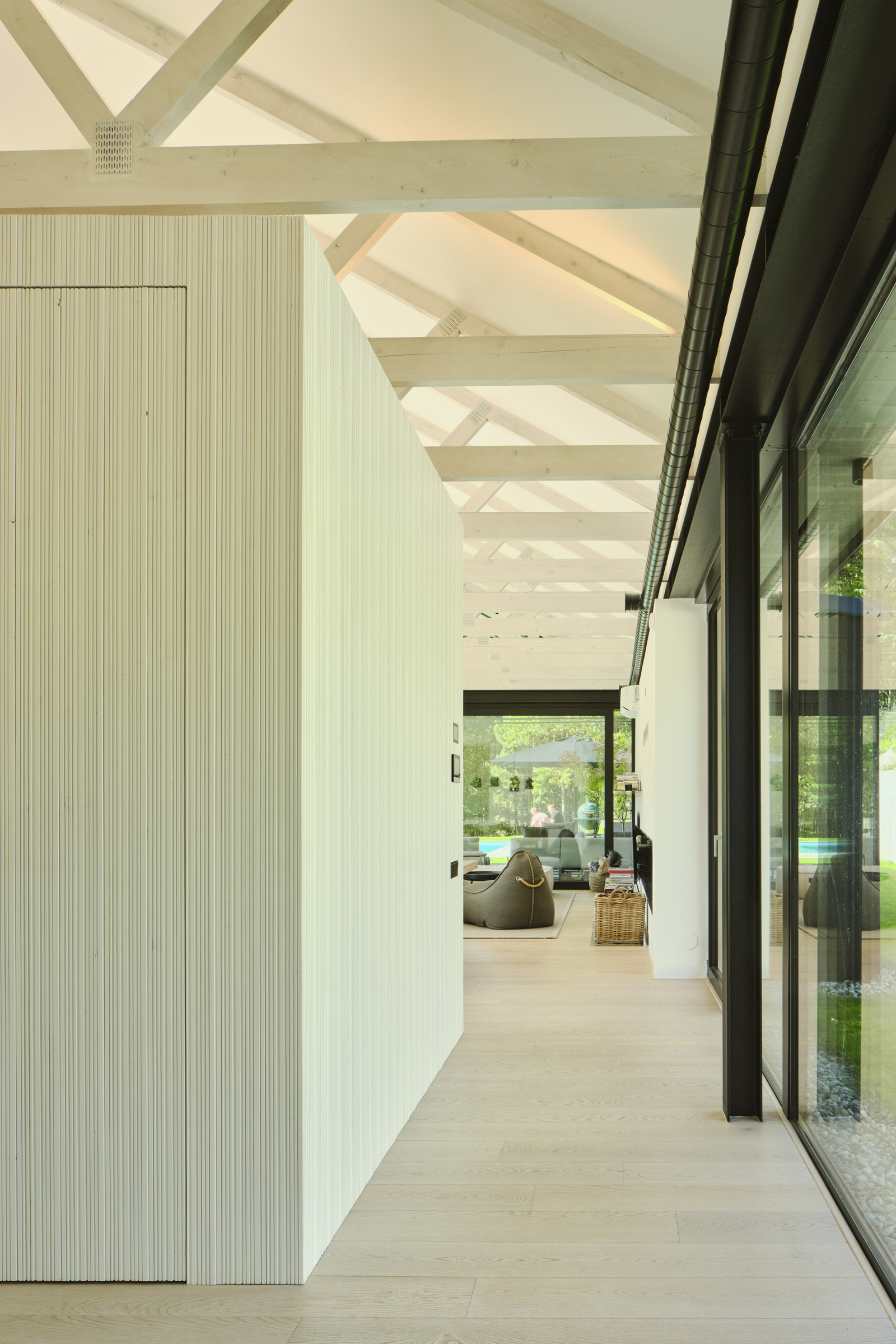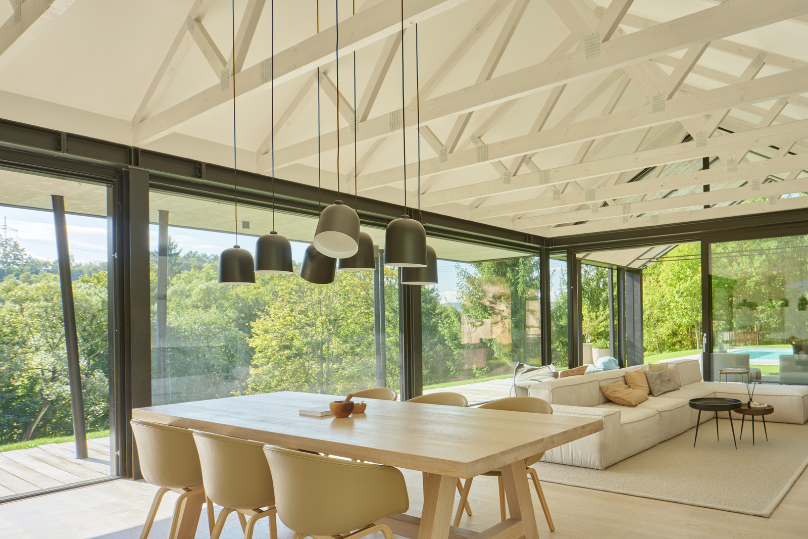 Najważniejszym elementem projektu jest otwarcie domu na widok. Jedna z elewacji została niemal w całości przeszklona, co pozwala na pełne połączenie wnętrza z ogrodem i krajobrazem. Dzięki temu dom „żyje” naturą – zmienia się wraz ze światłem, porami roku i rytmem dnia, a granica między wnętrzem a zewnętrzem zostaje niemal całkowicie zatarta.