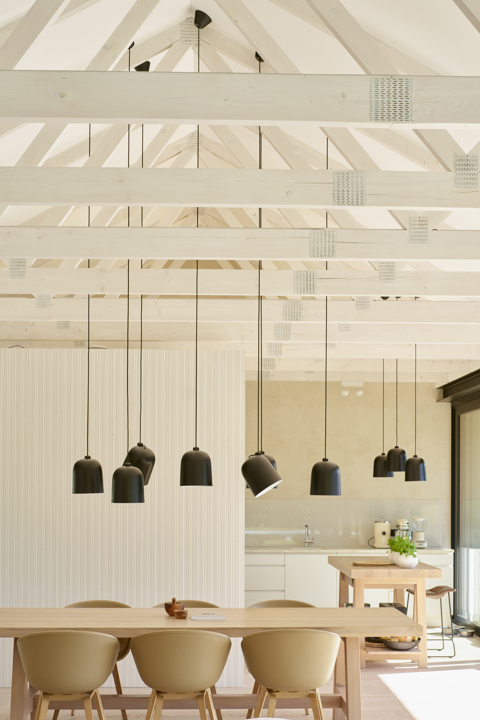 Wnętrze domu utrzymane jest w jasnej, spokojnej estetyce inspirowanej stylem nordyckim. Białe ściany, naturalne drewno i subtelne kontrasty z czarnymi detalami tworzą przestrzeń lekką i harmonijną. Otwarta strefa dzienna z centralnie umieszczoną kuchnią i kominkiem stanowi serce domu – miejsce codziennego życia i spotkań.