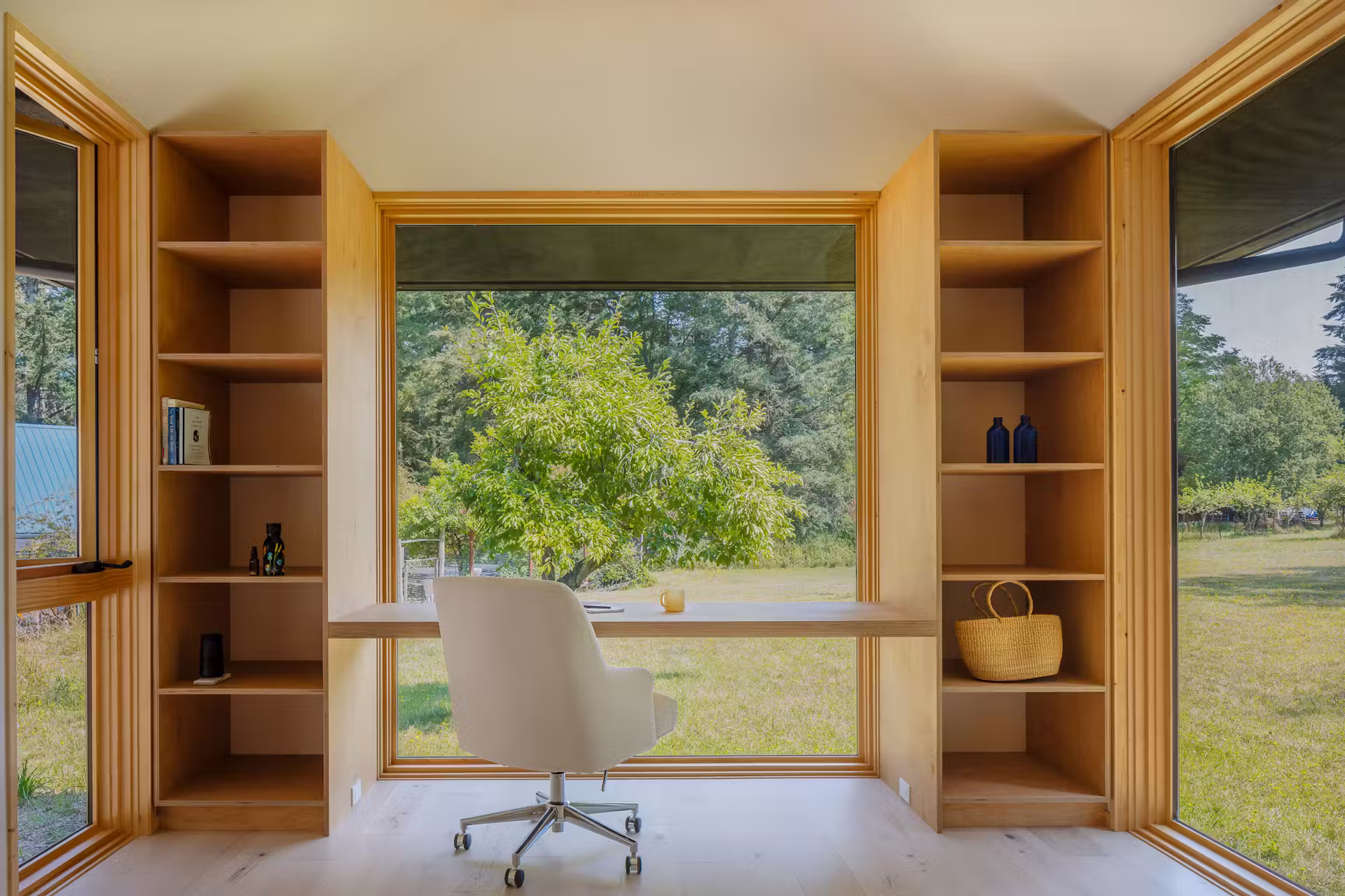 Bladderwrack Cabin to projekt stworzony dla pary, która szukała miejsca blisko wody, pozwalającego na codzienne kajakowanie i spokojne życie z dala od miasta. Lopez Island, jedna z najcichszych wysp w archipelagu San Juan, szybko okazała się dla nich idealnym wyborem. Płaskie łąki, gęste zagajniki i spokojne zatoki stworzyły naturalną scenerię dla domu, który miał być początkowo prostą bazą wypadową, a ostatecznie stał się pełnowymiarowym miejscem do życia.