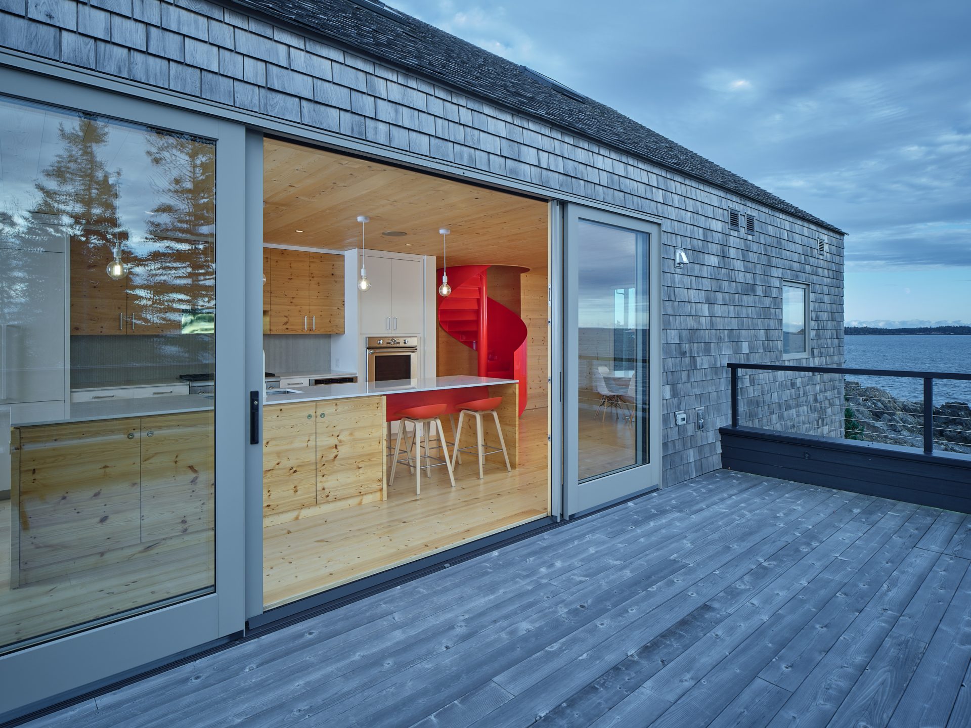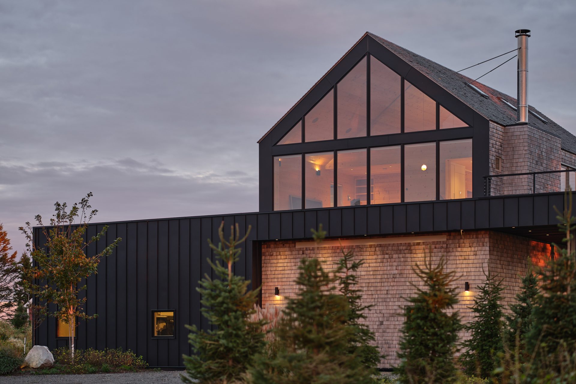 Masywna, stalowa konstrukcja wspierana przez Rivir Builders wpisuje się dyskretnie w industrialny charakter lokalnych „shedów”. Ściany zewnętrzne powleczono drewnem i metalem, a wielkopowierzchniowe okna sięgają do sufitu, by zapraszać światło i krajobraz do wnętrza. Wnętrza spajają naturalne materiały – jasne drewno podłóg, stalowe belki i surowy beton.