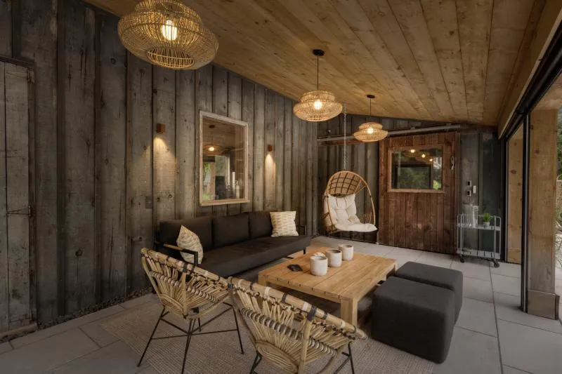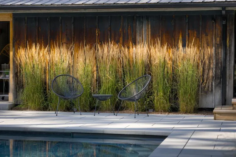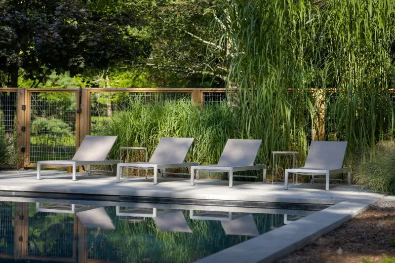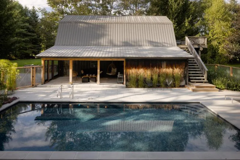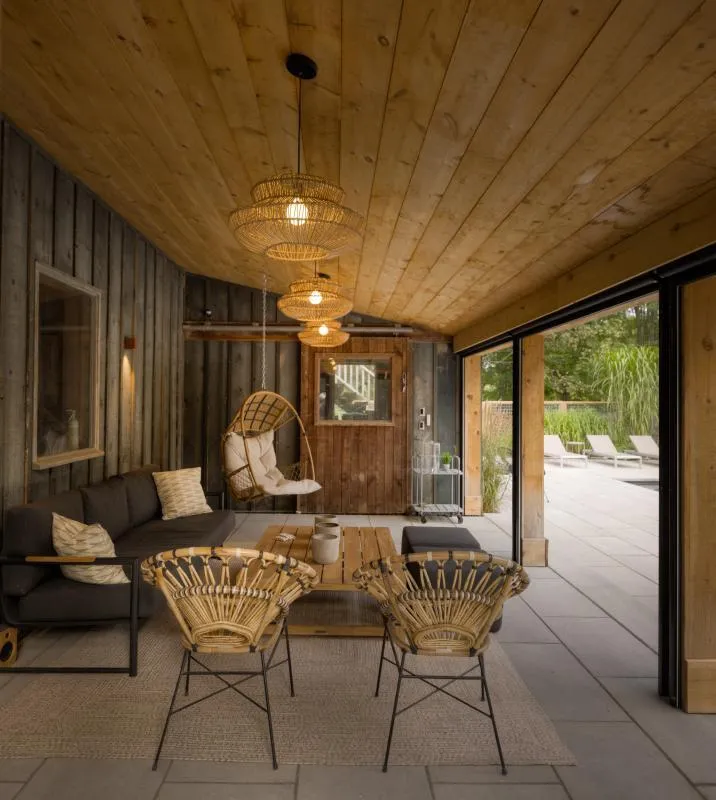 Nowy basen znajduje się około 70 metrów od głównego budynku i stanowi centralny element projektu. Obejmuje on także patio, stolarkę, oświetlenie, nasadzenia i modernizację budynku. Przestrzeń jest osłonięta od ulicy, ale ma otwarty widok na dom. Strefa spotkań i rozrywki zapewnia właścicielom i ich dorosłym dzieciom miejsce na wspólny relaks w cieplejszych miesiącach. Projekt łączy w sobie nowoczesny styl boho, jakiego oczekiwali właściciele domów, z rustykalnym charakterem posiadłości.