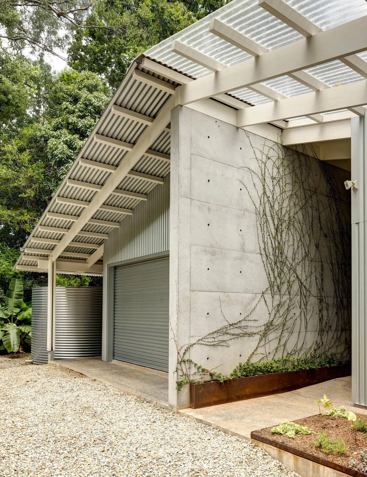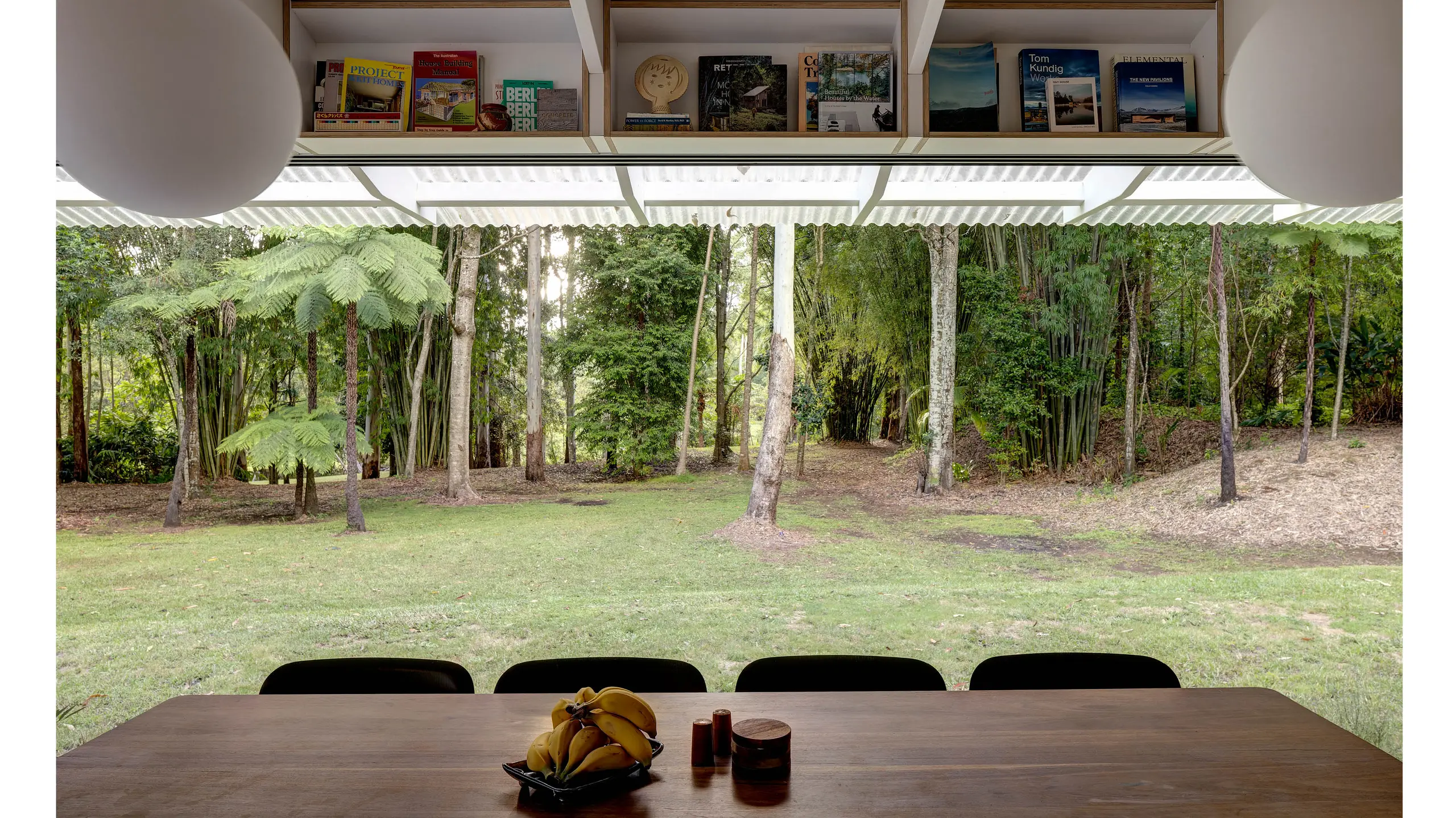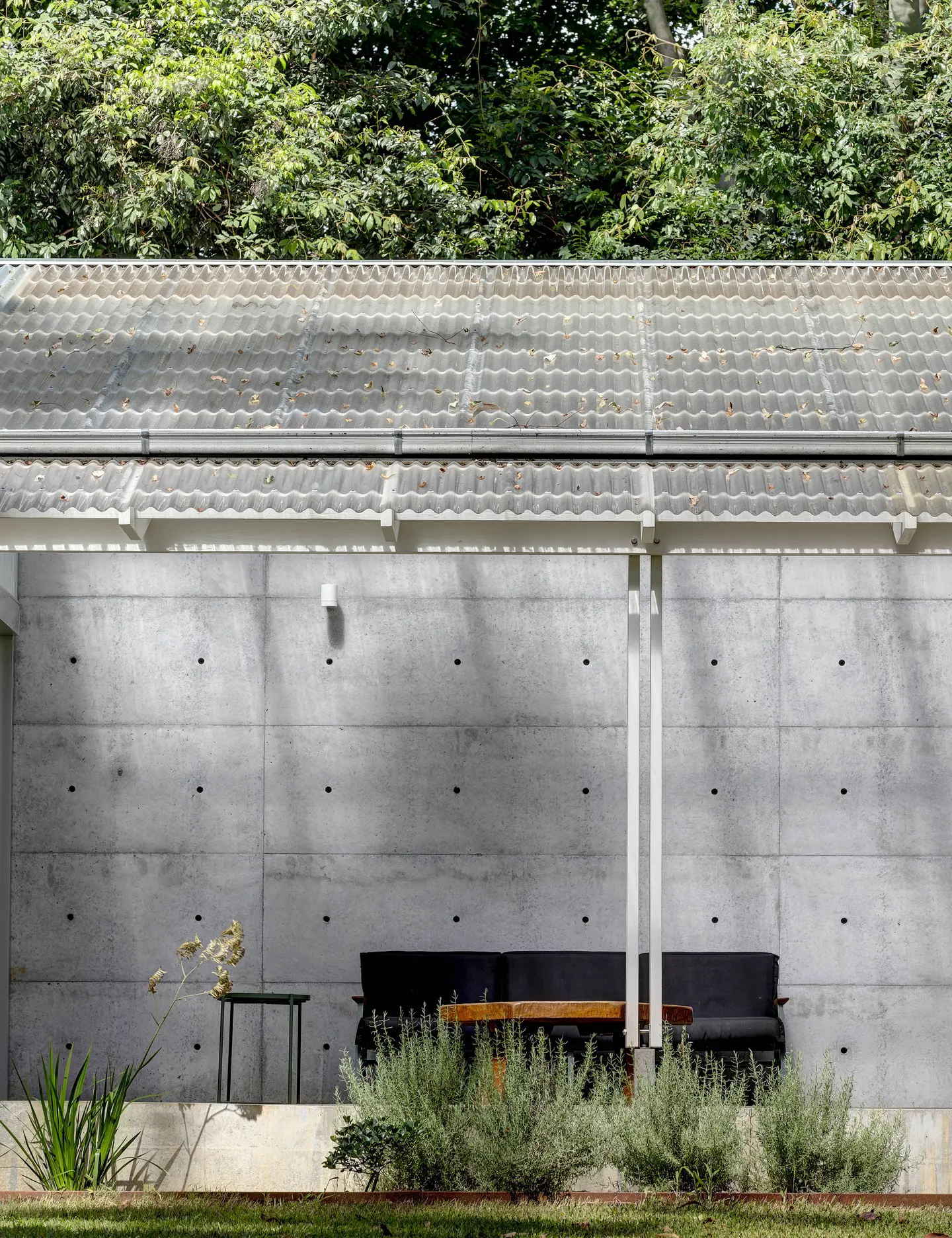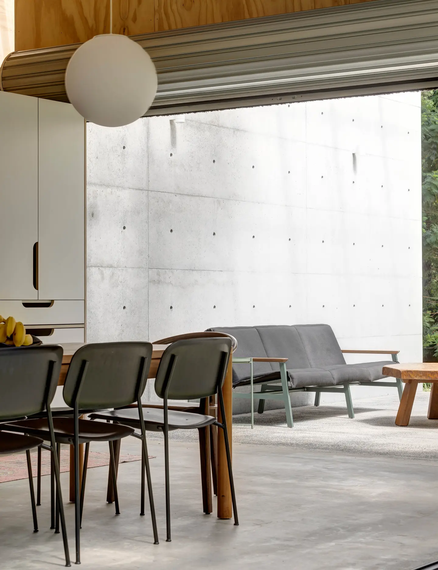 Dom ma trzy jasne sypialnie i przestrzeń dzienną, która całkowicie otwiera się na zewnątrz dzięki przesuwnym szklanym drzwiom i roletom garażowym. W słoneczne dni wnętrze i ogród stają się jednym – dom oddycha razem z krajobrazem. W środku rośnie niewielki ogród zimowy, który wprowadza do wnętrza jeszcze więcej zieleni i naturalnego światła.