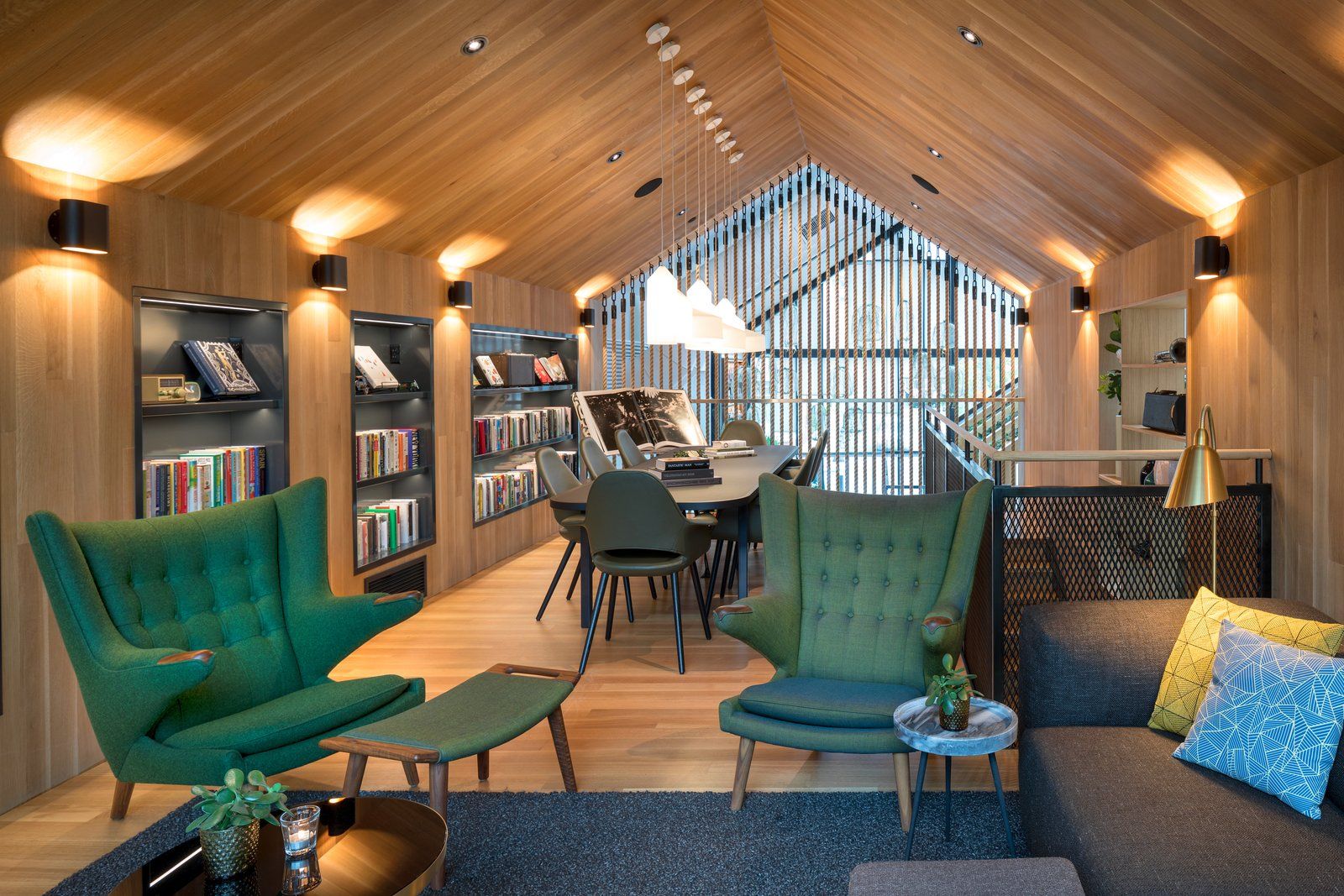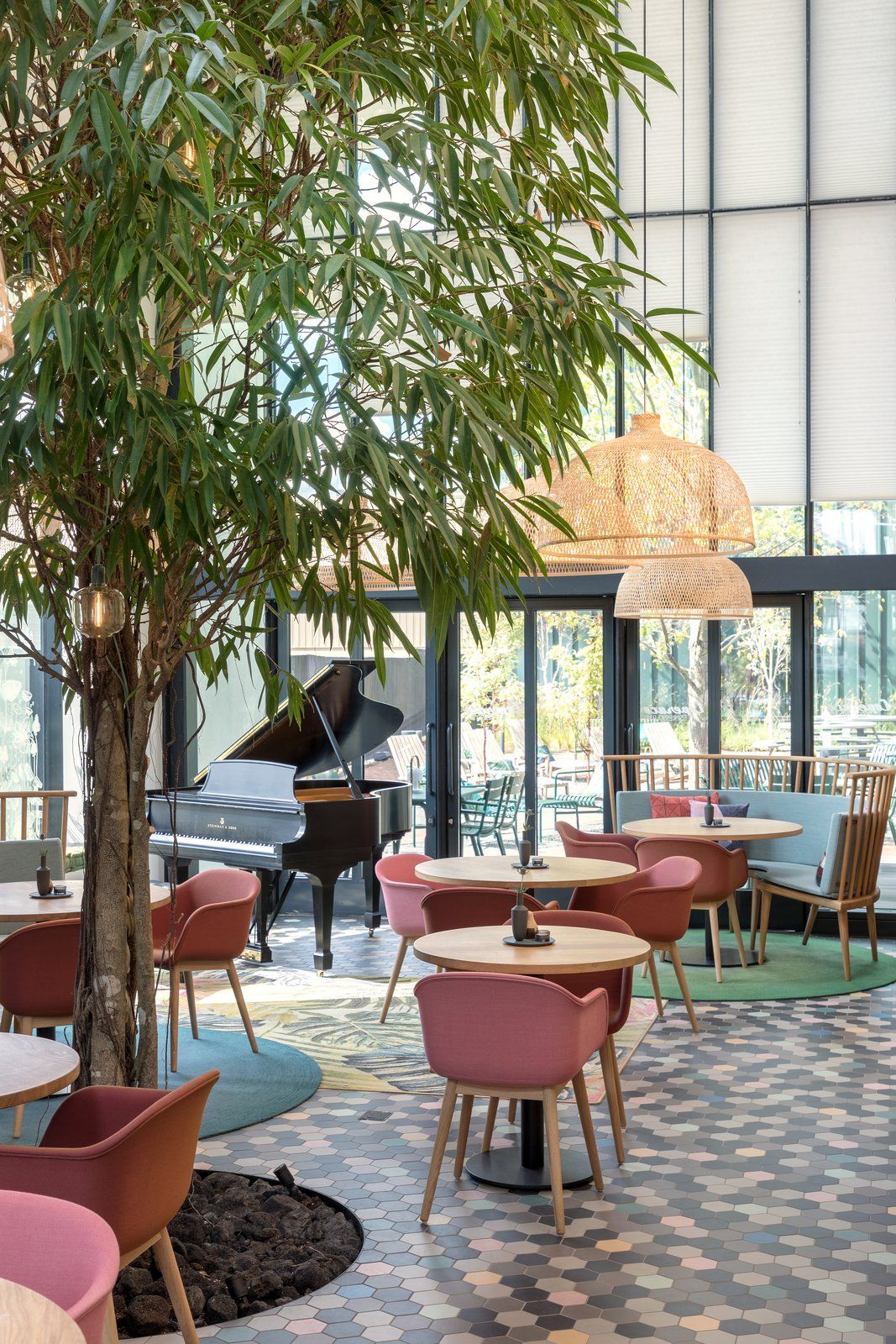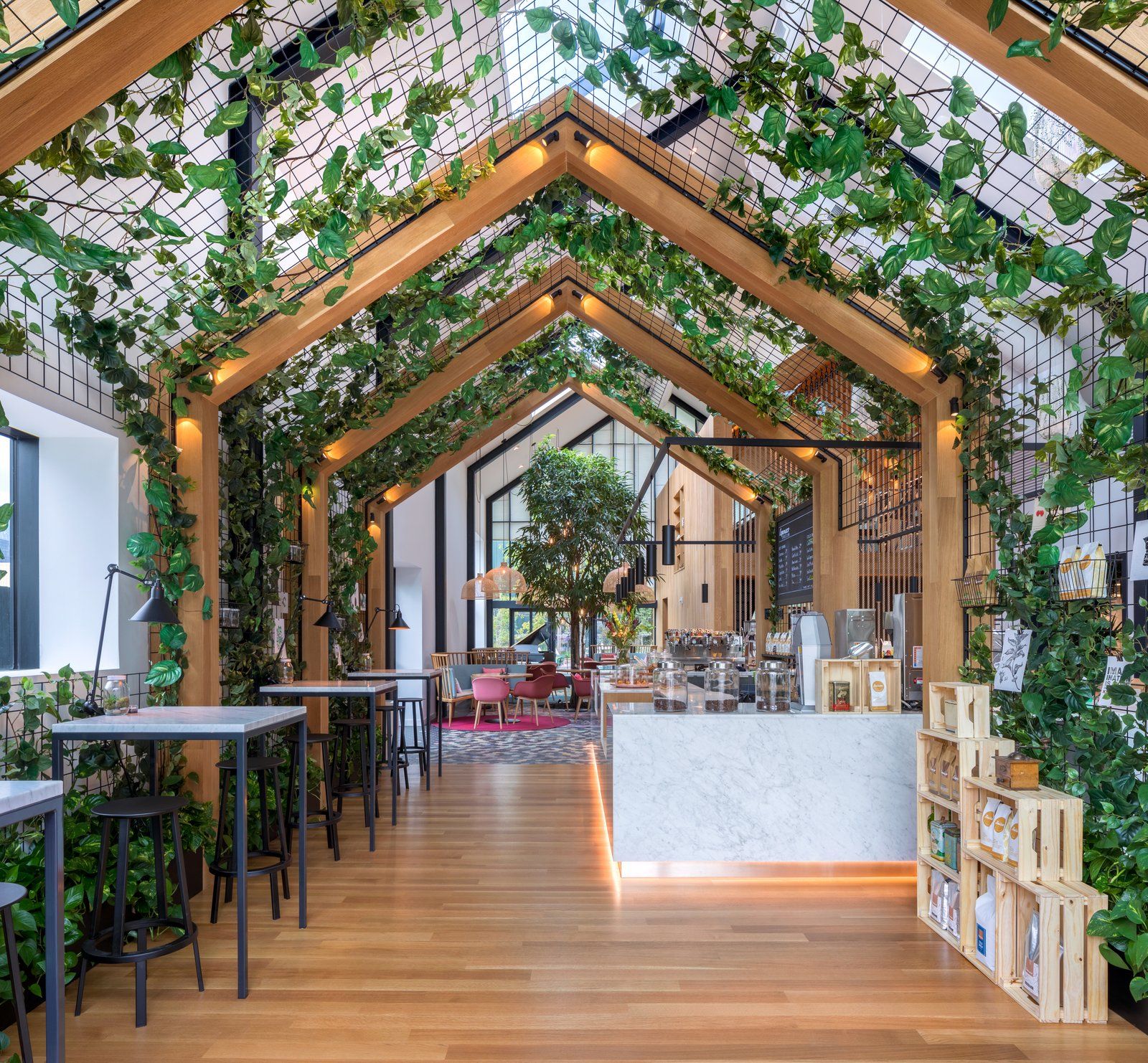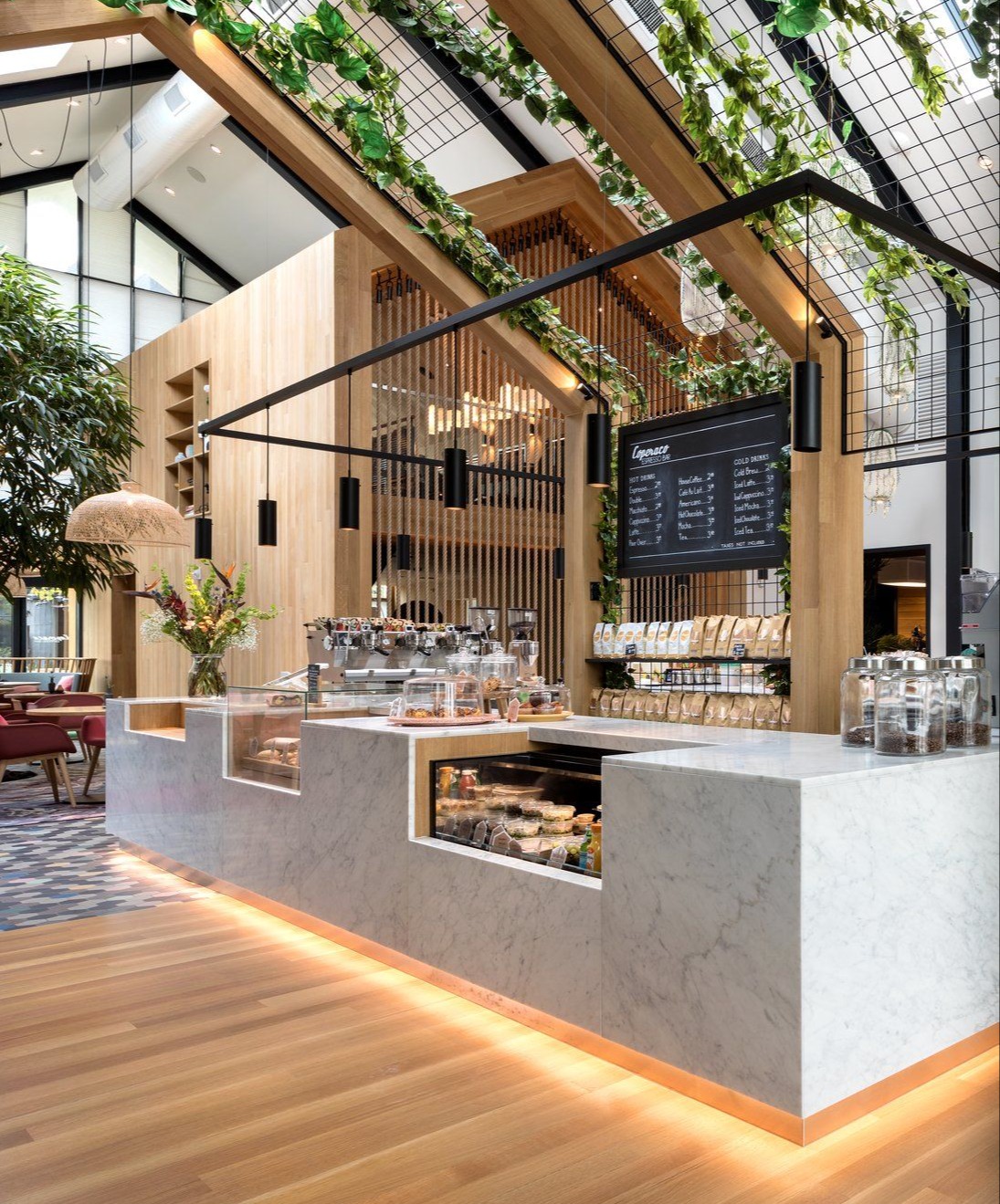 Wnętrze kawiarni jest przestronne, pełne światła i wyraźnie podzielone na strefy, co tworzy komfortową atmosferę zarówno dla stałych klientów, jak i gości przybywających okazjonalnie. Ciężki, podświetlany marmurowy bar został subtelnie oddzielony od przestrzeni dzięki pionowym listwom i liściom. Na podłodze mozaika wyznacza granice stref, a oświetlenie podkreśla przytulność miejsca. Nietypowym akcentem jest dwupiętrowy „domek na drzewie” wykonany z drewna i ściany ze sznurka, w którym powstała przytulna biblioteka przy kominku. Tego typu rozwiązania nadają wnętrzu charakter nowoczesnej stodoły, łącząc minimalistyczny design z elementami naturalnymi i zapewniając komfortowe, relaksujące doświadczenie.